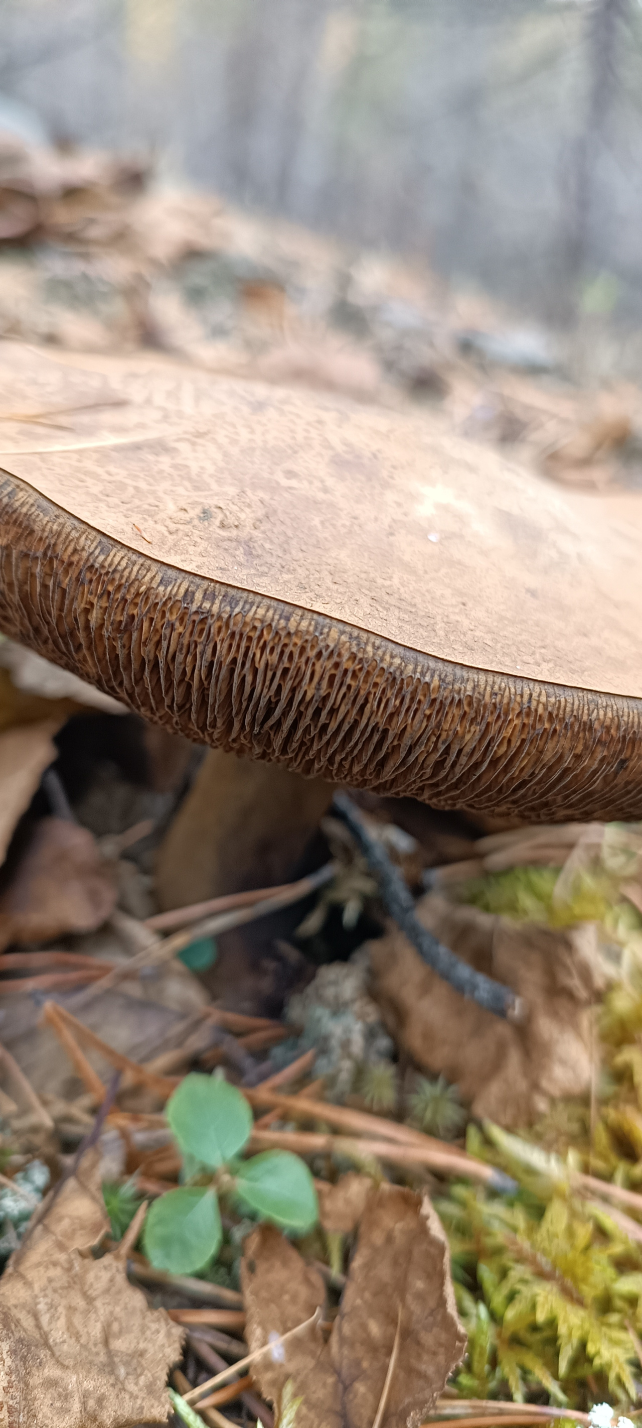 Те грибы, у которых видно гименофор (нижнюю сторону шляпки), похоже, Моховик Лиственничный, посмотрите: https://wikigrib.ru/mohovik-listvennichnyj/