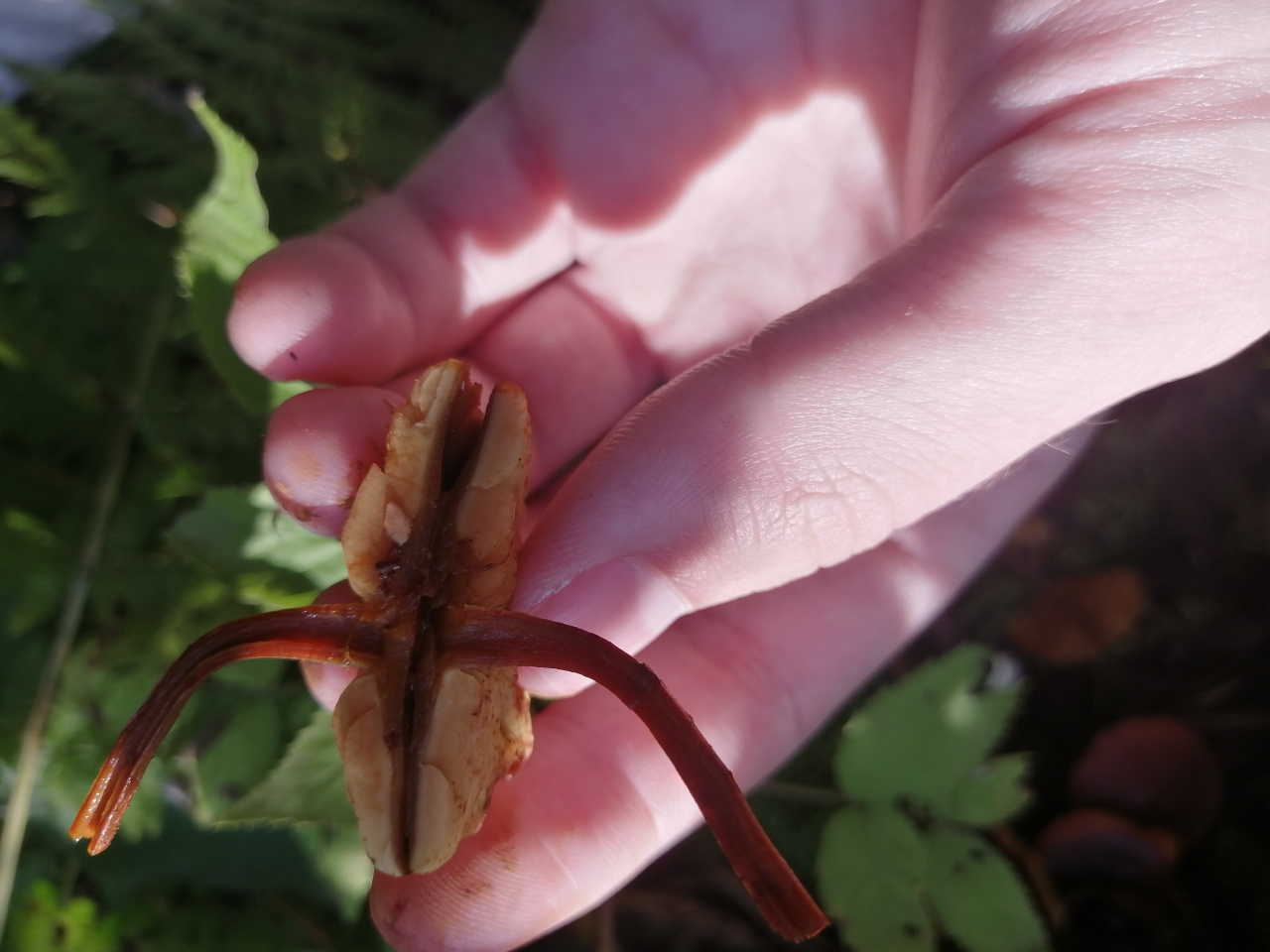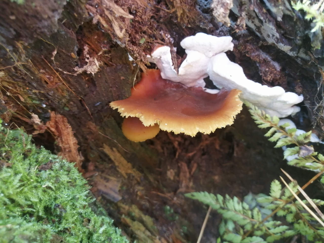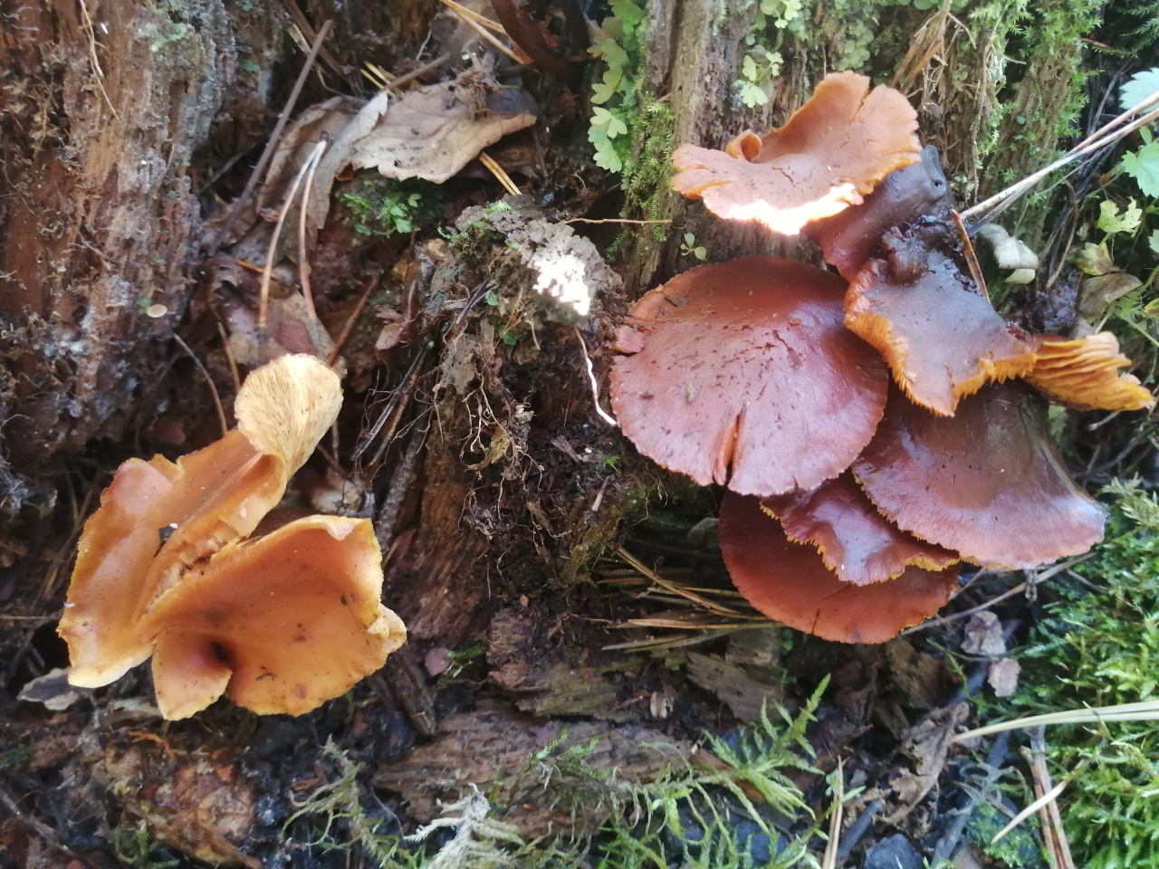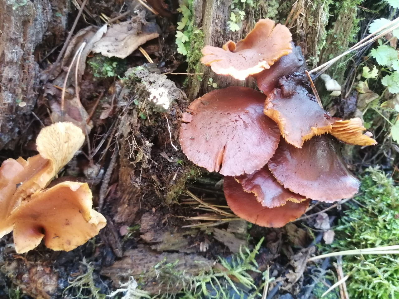 Описание гриба: Несколько раз встречал эти грибы на пнях и раз на стволе упавшей сосны. Запах как у трутовика. Шляпки у всех покрыты густым марки слоем, который, если потрогать, оставляет следы и после высыхания похоже на глину