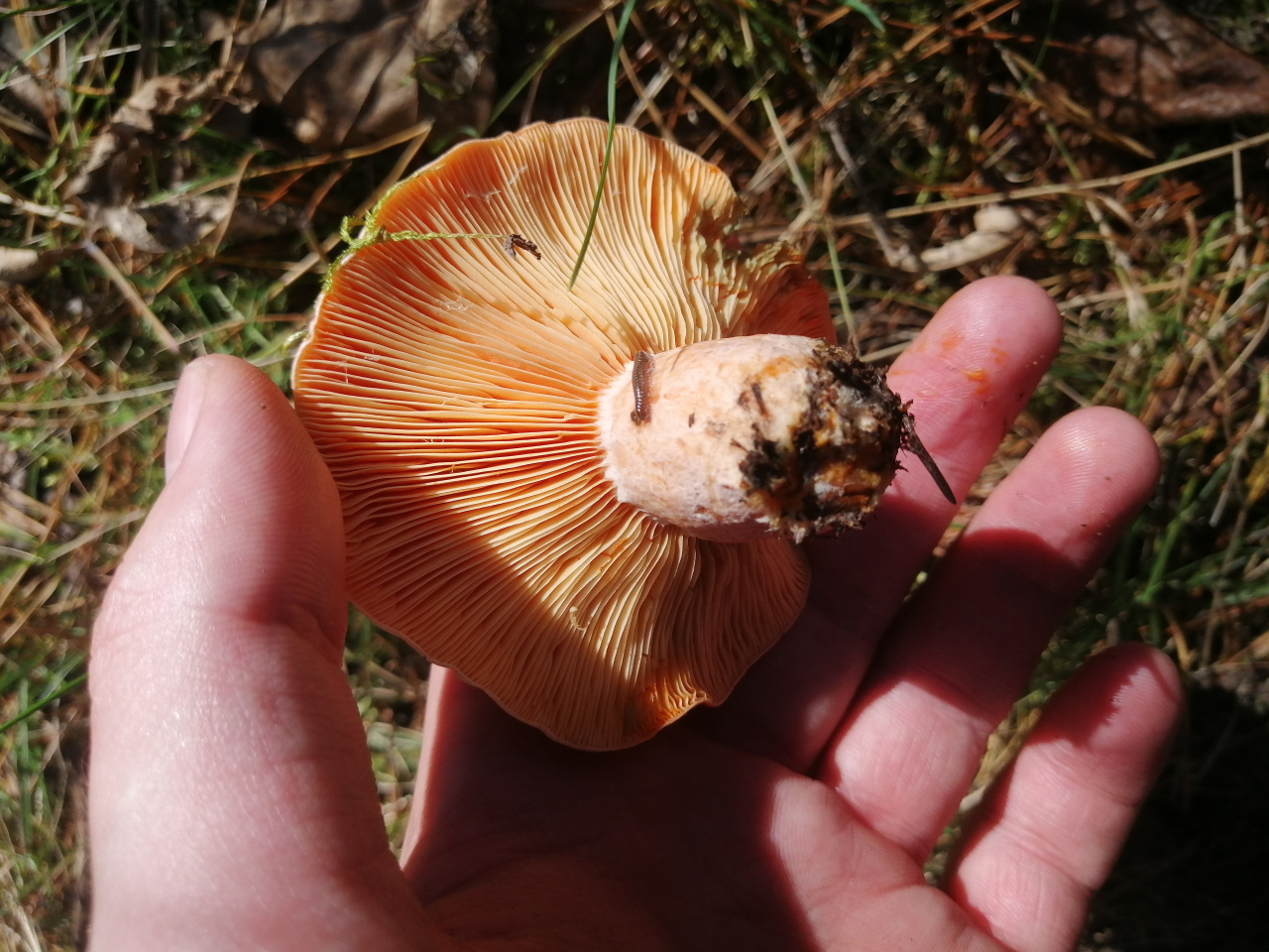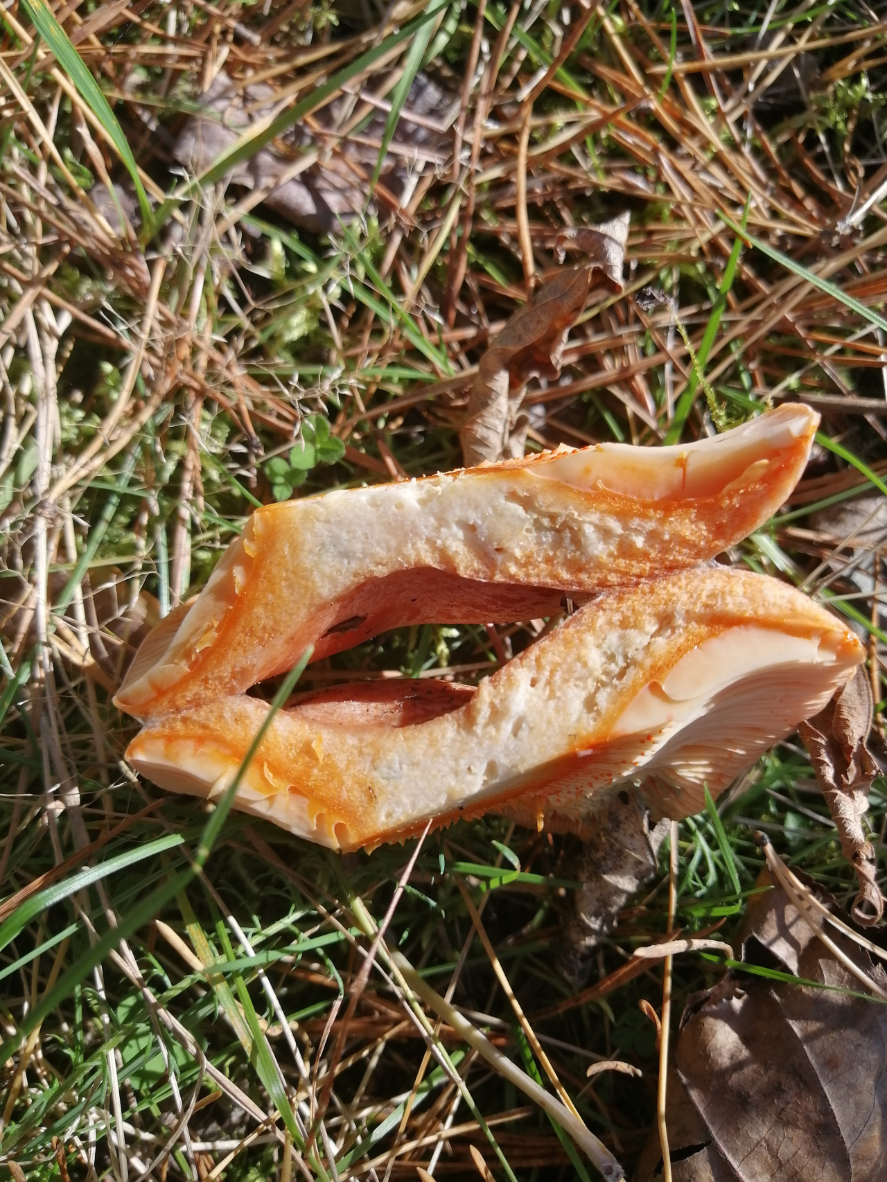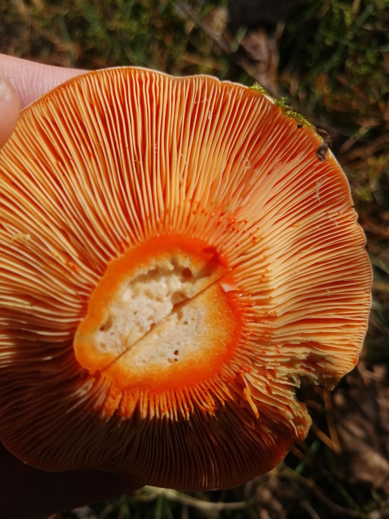 Описание гриба: Это рыжик? Рос в траве рядом с лиственными деревьями. При срезе или надавливании на пластинки выделяется рыжий сок