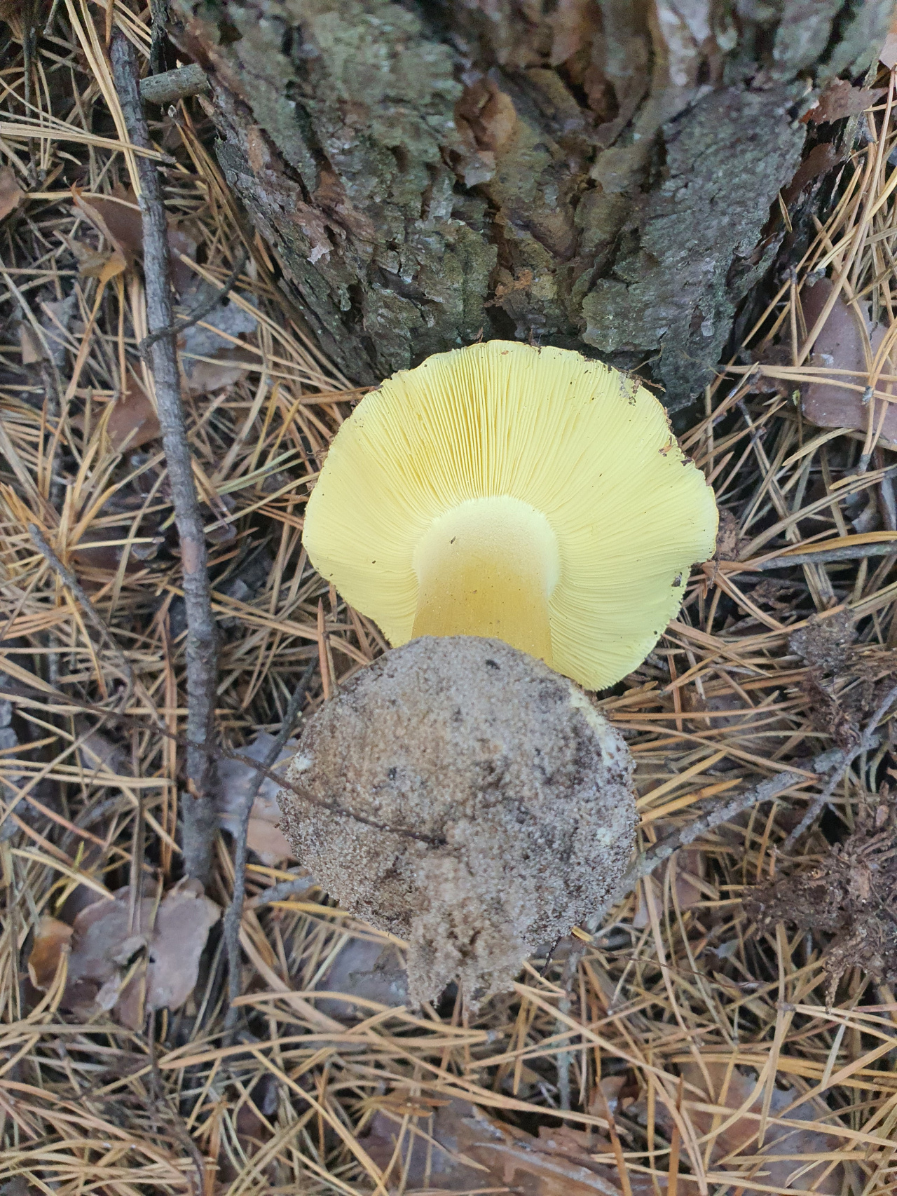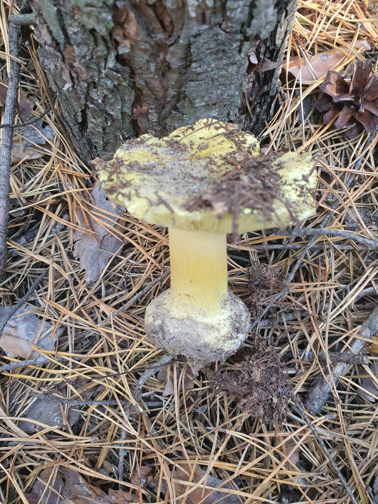 Описание гриба: Сосновый лес. Гриб однородного бело-жёлтого цвета с ровной толстой ножкой и основанием в виде перевёрнутой луковицы. Растёт группами.
