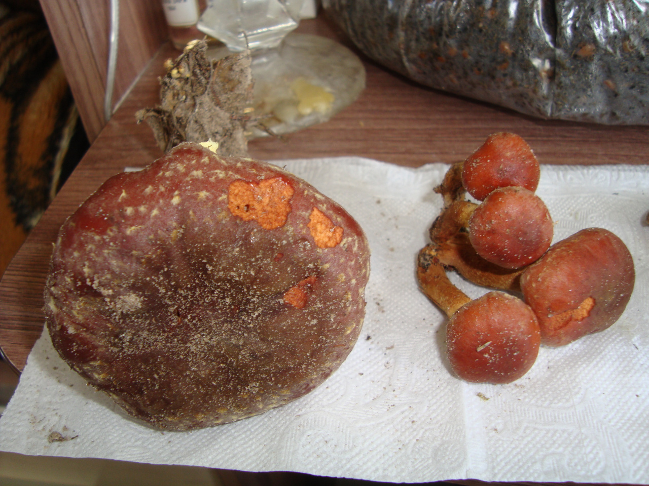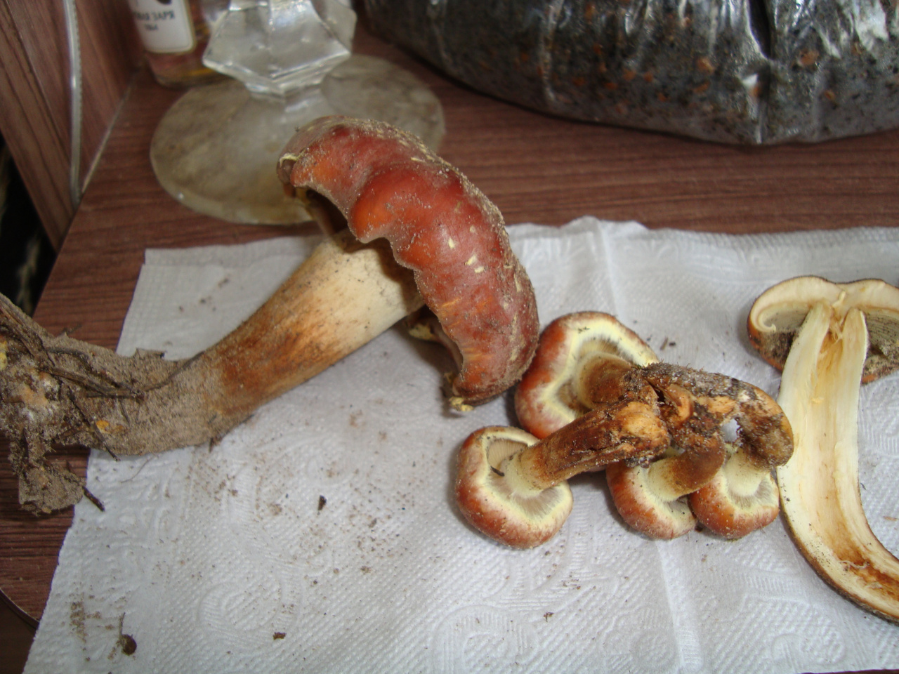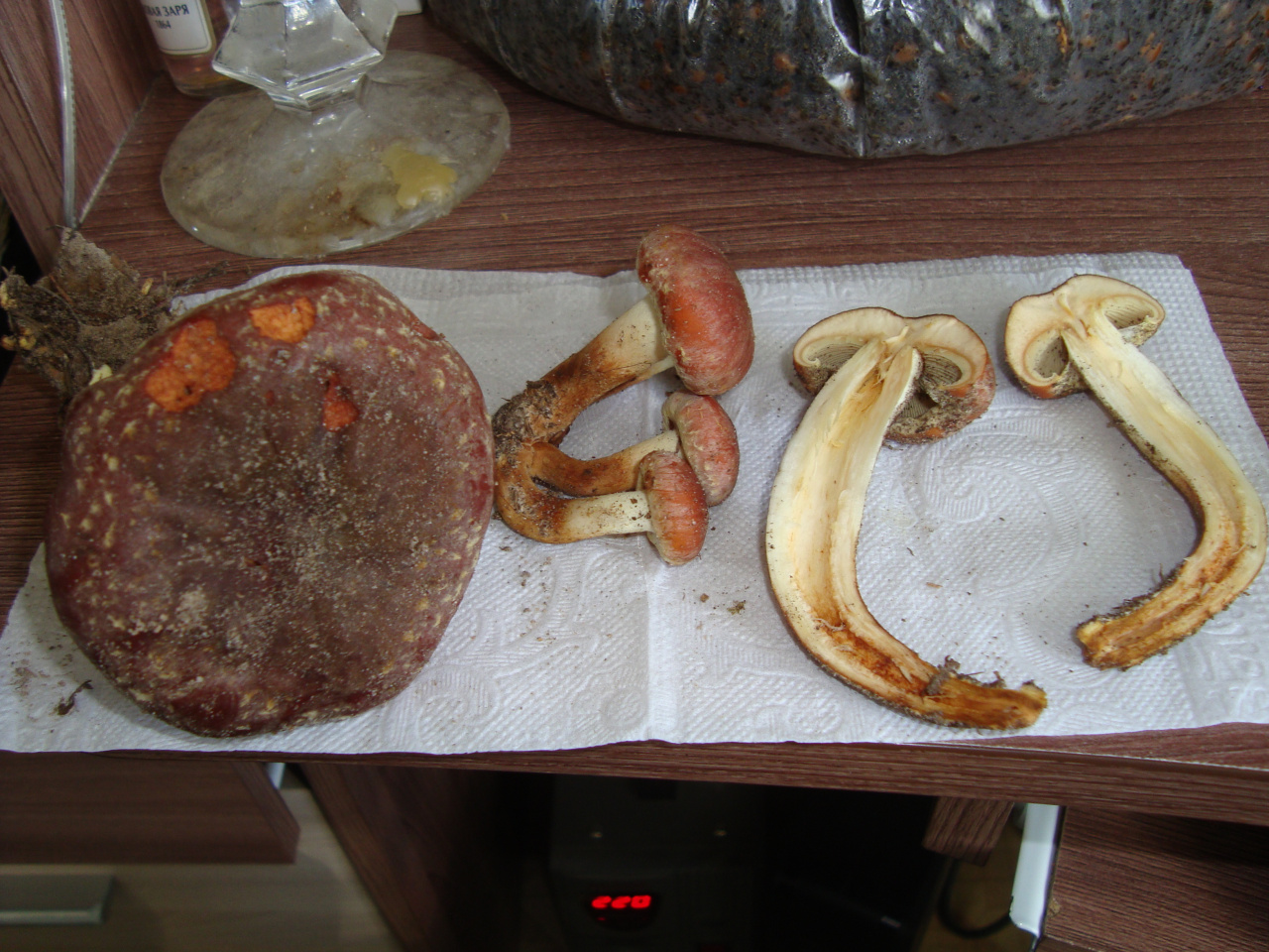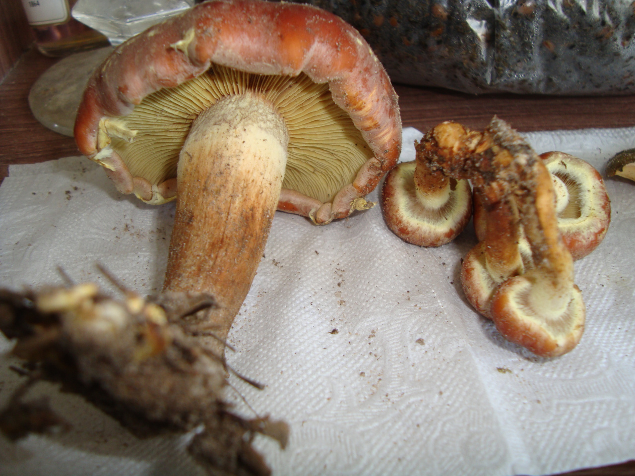 Описание гриба: Очень похож на кольцевик, но намёки на кольцо есть только у одного гриба. Все грибы молодые, до конца не раскрытые, вместо кольца как будто паутинка. Гриб на ощупь плотный, шляпка мясистая. У грибов покрупнее края шляпки кривые, как будто волны. На шляпках белые и желтоватые точки-хлопья. Не как у мухомора, более приросшие, плоские. По краям шляпки остатки покрывала. Под шляпкой пластинки светлые, желтоватые. Единственный гриб постарше маломерок, у него пластинки серые. Ножки под шляпкой бело-жёлтые, а к низу коричневые, полые внутри. Мякоть на срезе белая. Появился слегка желтовато-коричневатый оттенок, пока я писала и перечитывала это сообщение, но основной тон беловатый. Запах на срезе грибной, на вкус не горький. Млечного сока нет. Грибы росли дружной семьёй на поваленной полусгнившей берёзе, в том числе на корнях, где они оказались все в песке. Ножки уходят глубоко в песок или в уже мягкие слои коры, откуда вытаскиваются голой рукой без дополнительных инструментов. Впервые заметила грибы 29 сентября, но не собрала. Тогда они выглядели более красными, а сейчас коричневые. Сходила за ними и описала уже 1 октября.