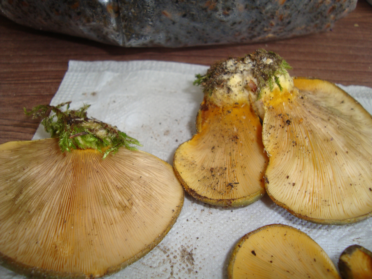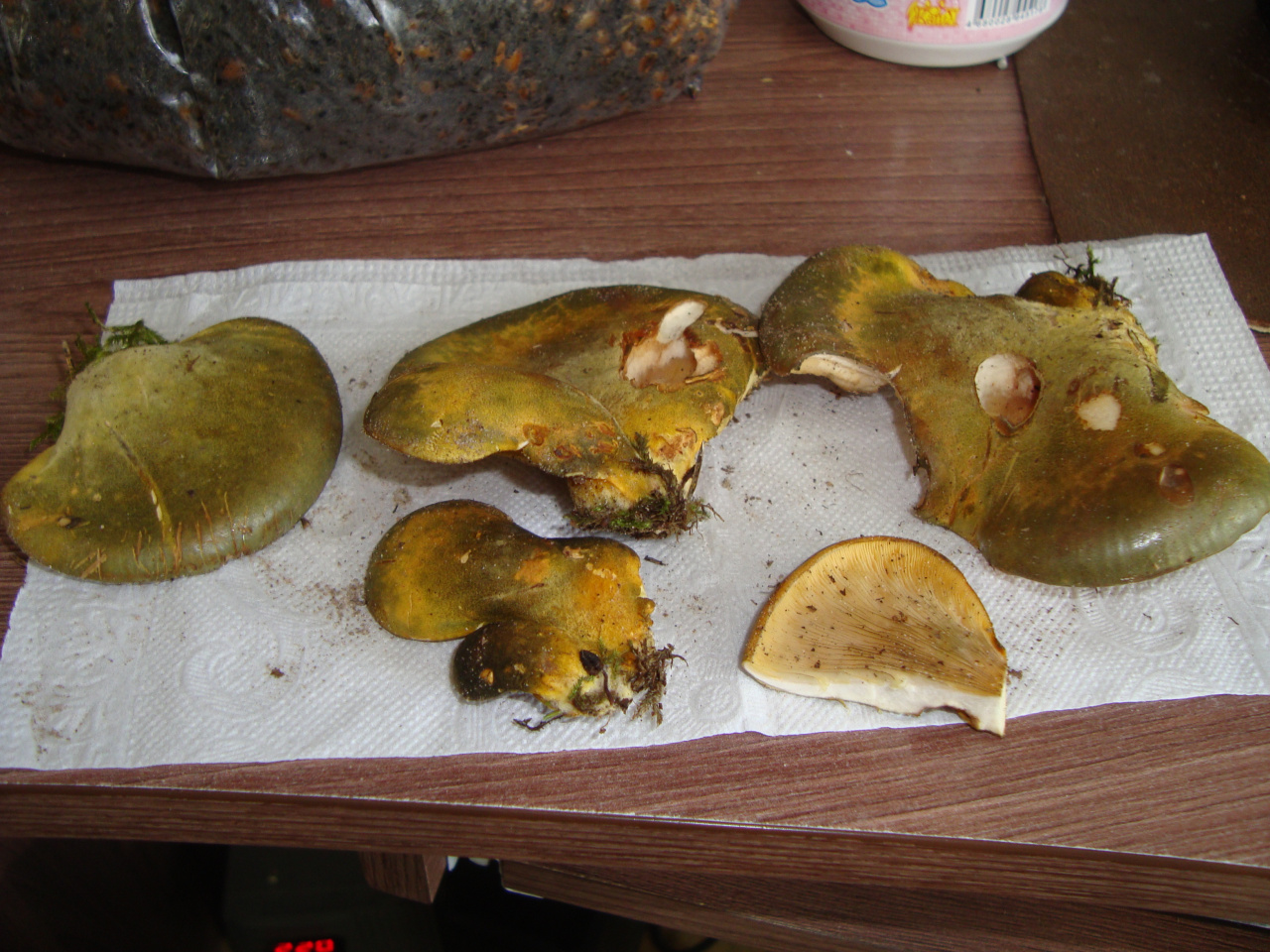 Описание гриба: Гриб похож на осеннюю вешенку, но так как я никогда не собирала их в лесу, хочется убедиться, чтобы избежать неприятных последствий после употребления. Шляпка довольно мясистая, сухая, плотная, болотно-зелёная с жёлтым, не симметричная, один бок уходит в ножку. Пластинки желтовато-коричневые, даже с оранжевым оттенком, плавно переходят в ножку. Ножка очень короткая, не выраженная, на ощупь слегка бархатистая, под цвет пластинок. На срезе мякоть белая, не меняет цвет. Запах грибной, на вкус не горькая. Млечного сока нет. Грибы росли на старом полуразрушенном замшелом пне, вперемежку с другими грибами, опятоподобными. Затрудняюсь назвать дерево, которому этот пень принадлежал.