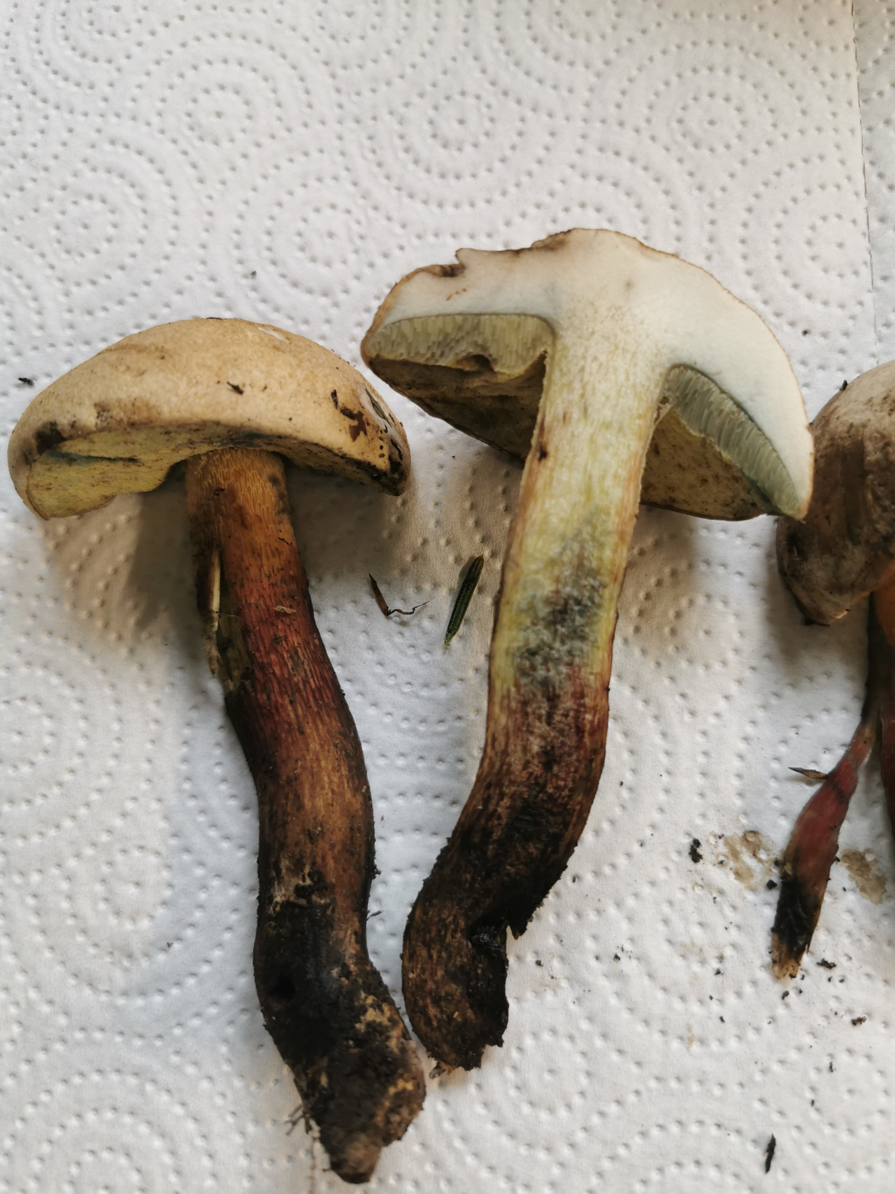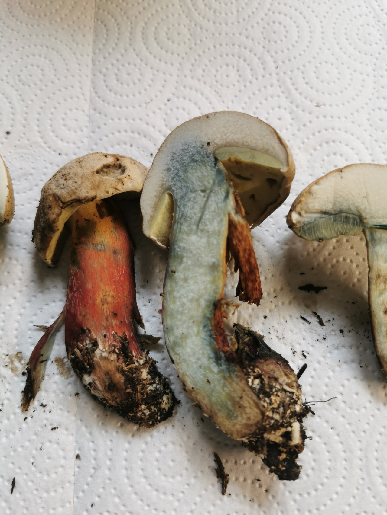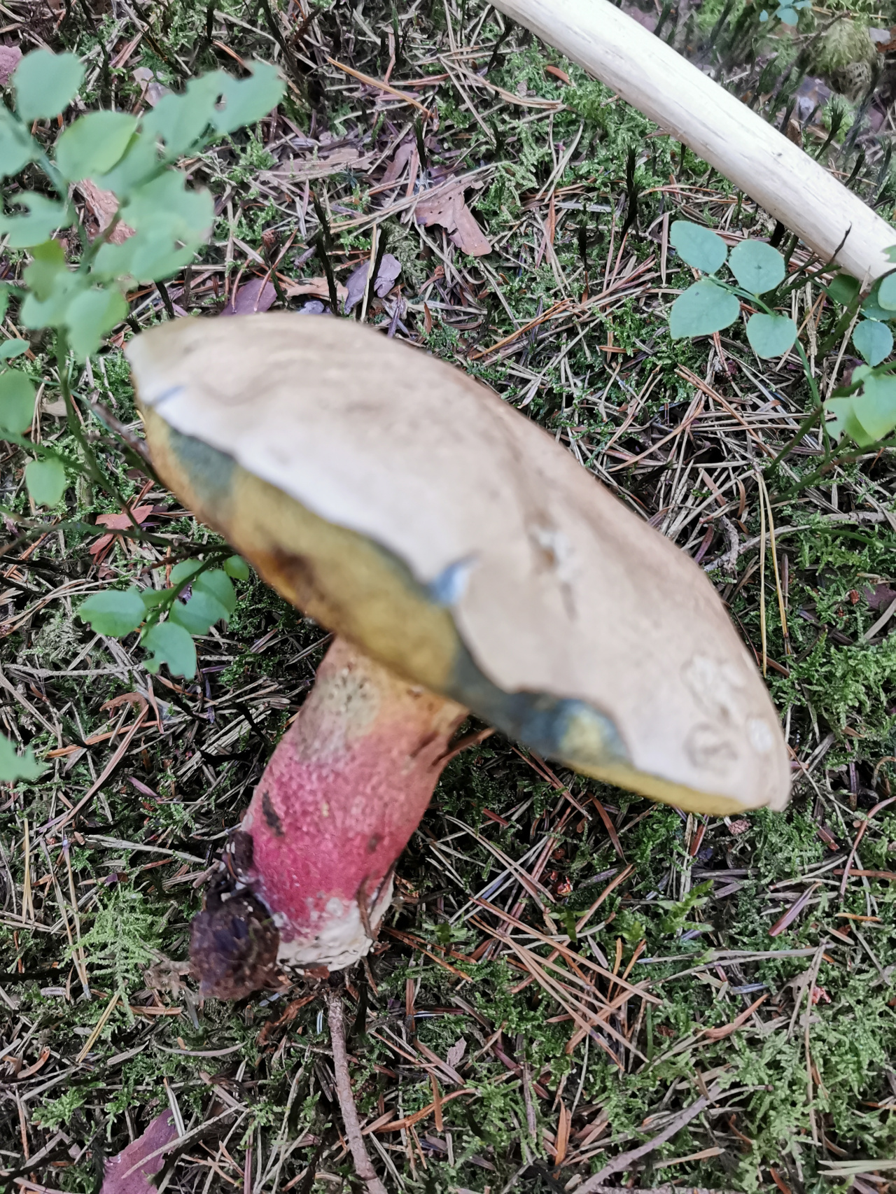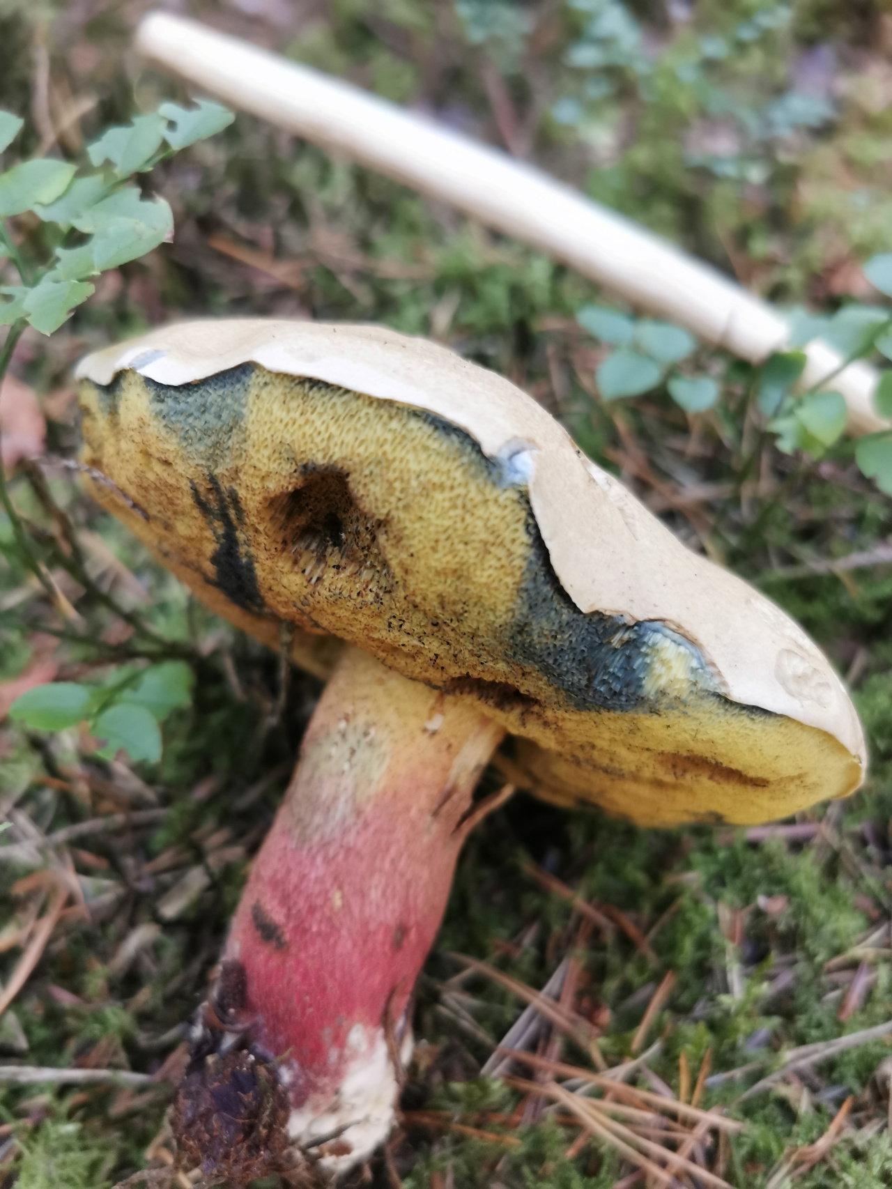 Описание гриба: Помогите определить гриб. Лес Шварцвальд, преимущественно хвоя и смешанный, лес имеющий плотное мховое покрытие По земле, пням, сломанным деревьям. Конец сентября — начало октября одиночно попадаются такие грибы. Похож на сатанинский, но ножка прямая, красная снизу, шляпка серая, светло-серая или серовато-бежевая. Снизу гименофор (губка) светло-желтая. Не малиновая, не красная. Видела такие перестоявшие — шапка почти плоская, в диаметре около 12 см, ножка не круглая. Разрезала, он медленно синел, когда полежал, начал чуть светлеть в посиневших местах