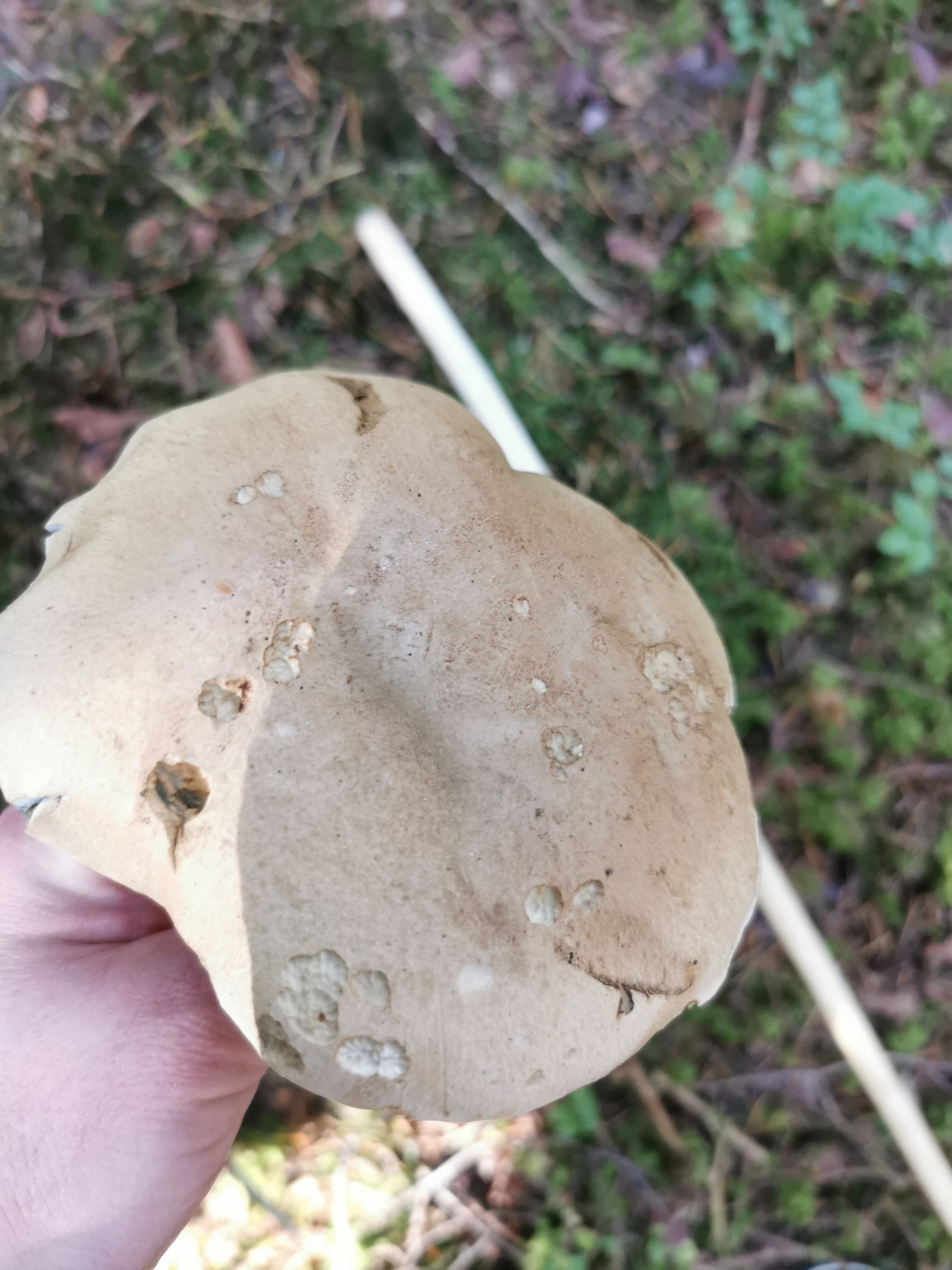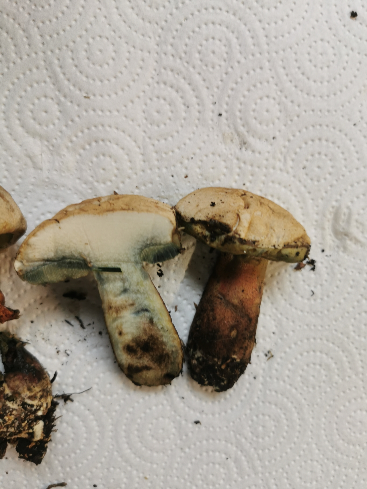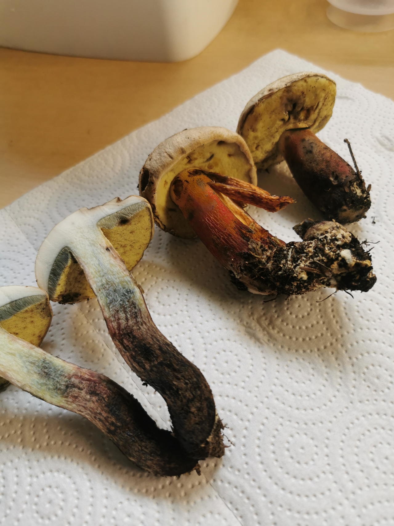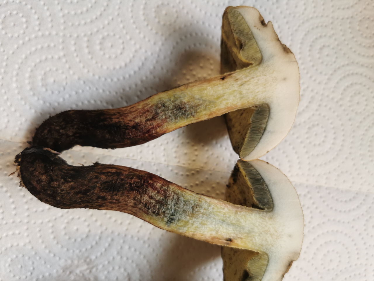 Описание гриба: Помогите определить гриб. Лес Шварцвальд, преимущественно хвоя и смешанный, лес имеющий плотное мховое покрытие По земле, пням, сломанным деревьям. Конец сентября — начало октября одиночно попадаются такие грибы. Похож на сатанинский, но ножка прямая, красная снизу, шляпка серая, светло-серая или серовато-бежевая. Снизу гименофор (губка) светло-желтая. Не малиновая, не красная. Видела такие перестоявшие — шапка почти плоская, в диаметре около 12 см, ножка не круглая. Разрезала, он медленно синел, когда полежал, начал чуть светлеть в посиневших местах