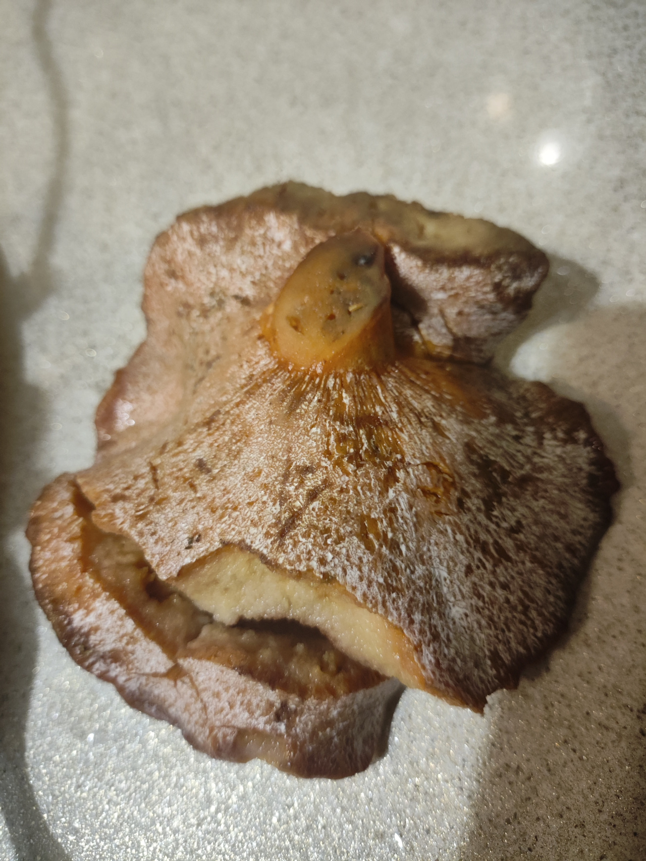 Описание гриба: Купил муж с рук замороженные рыжики. Все нормальные, а этот вызывает сомнения из-за белого налета под шляпкой