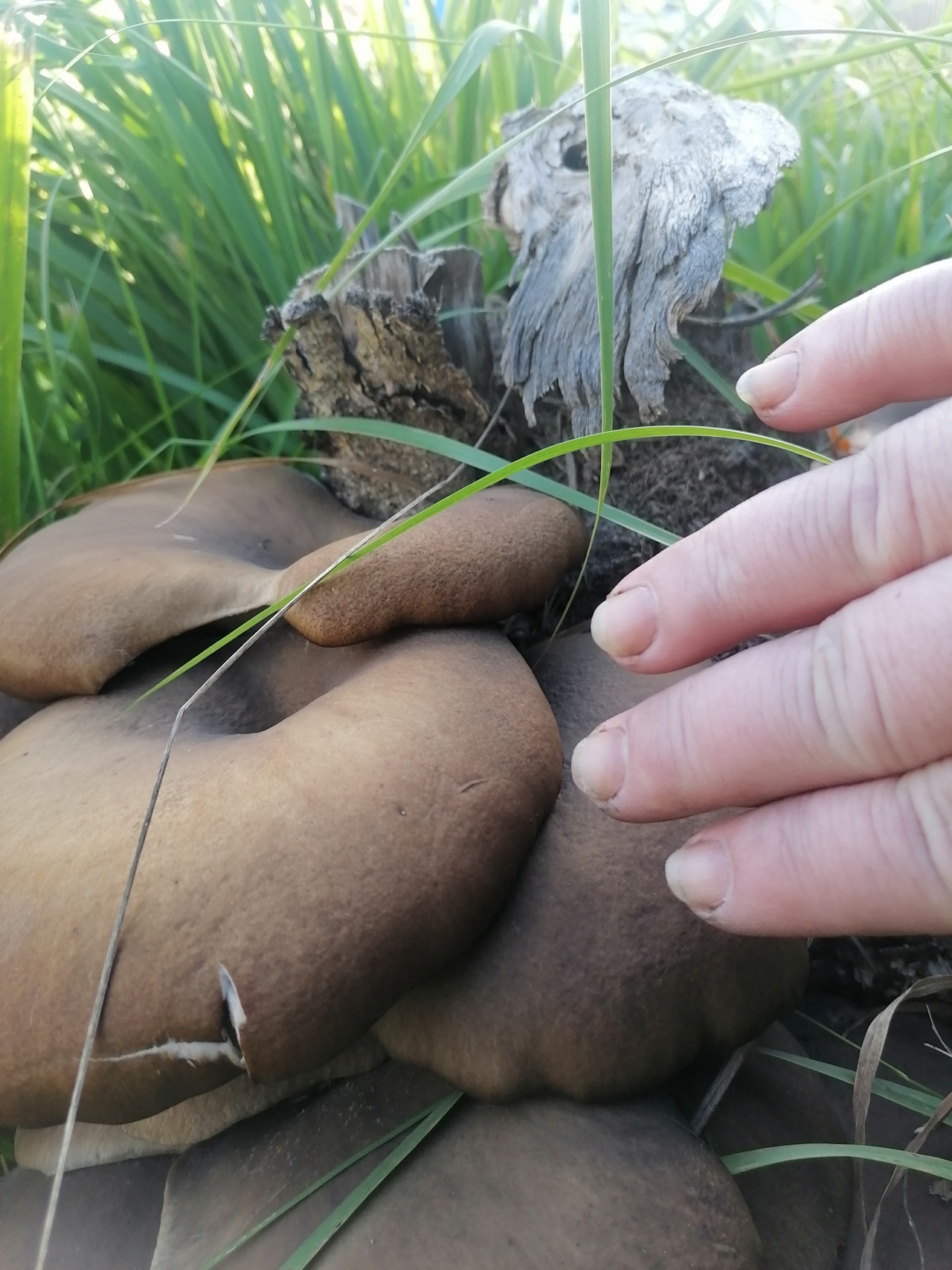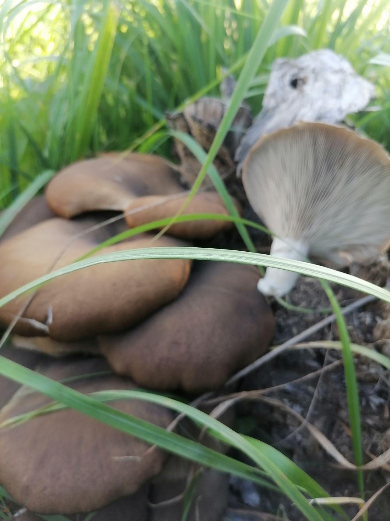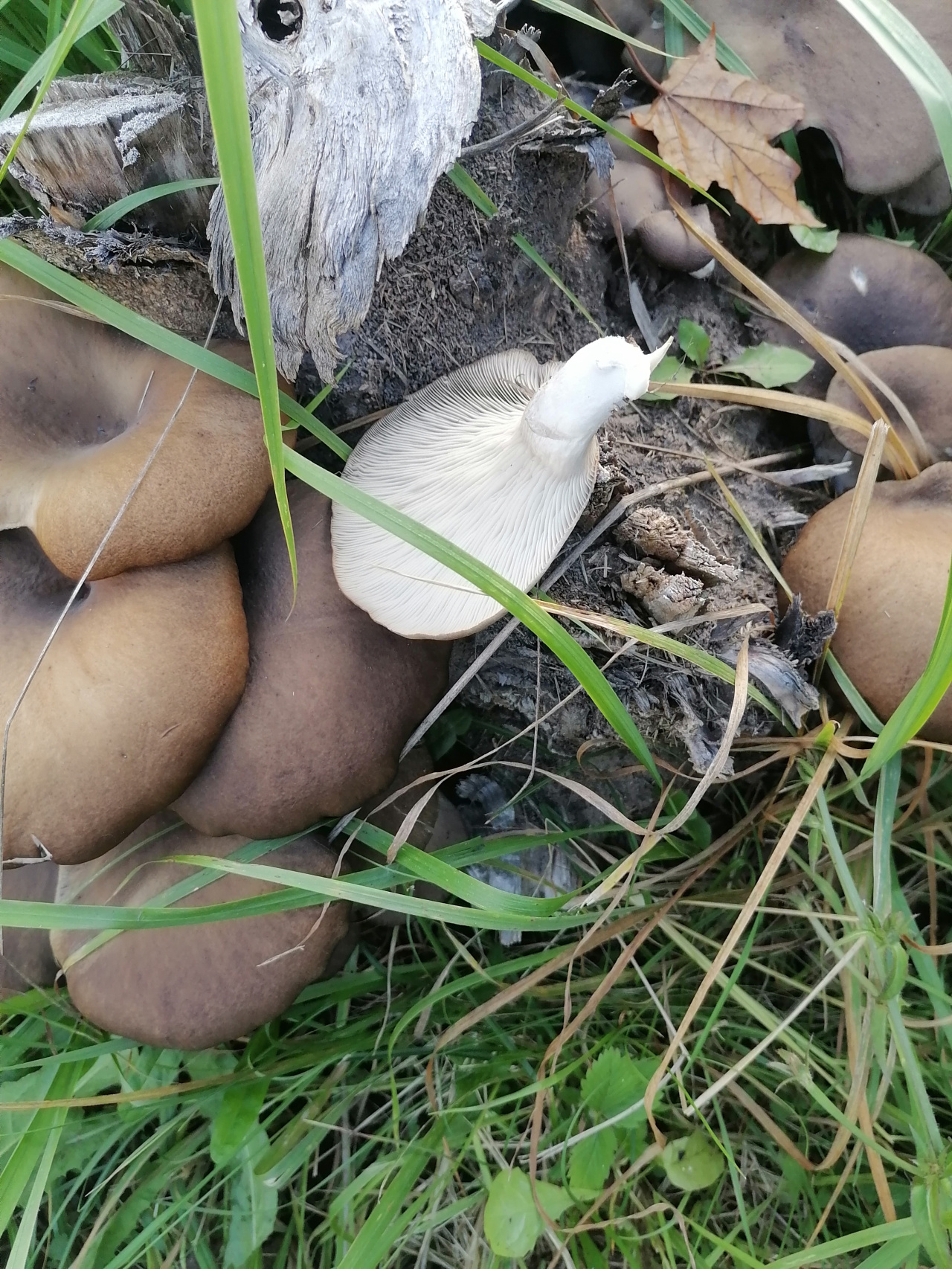 Описание гриба: Похож на вешенки или луговой опенок. Шапка серая гладкая, ножка плотная белая, пластинчатый без юбочки на пне