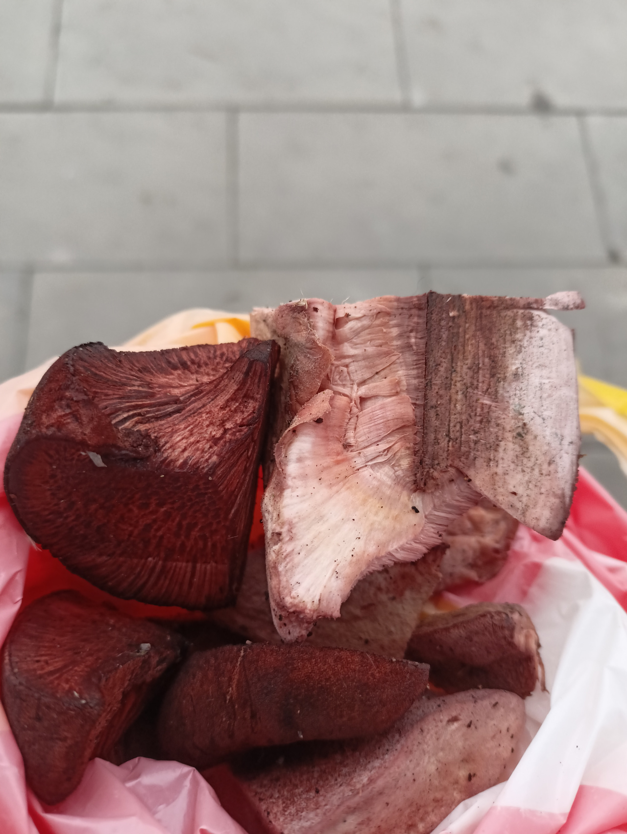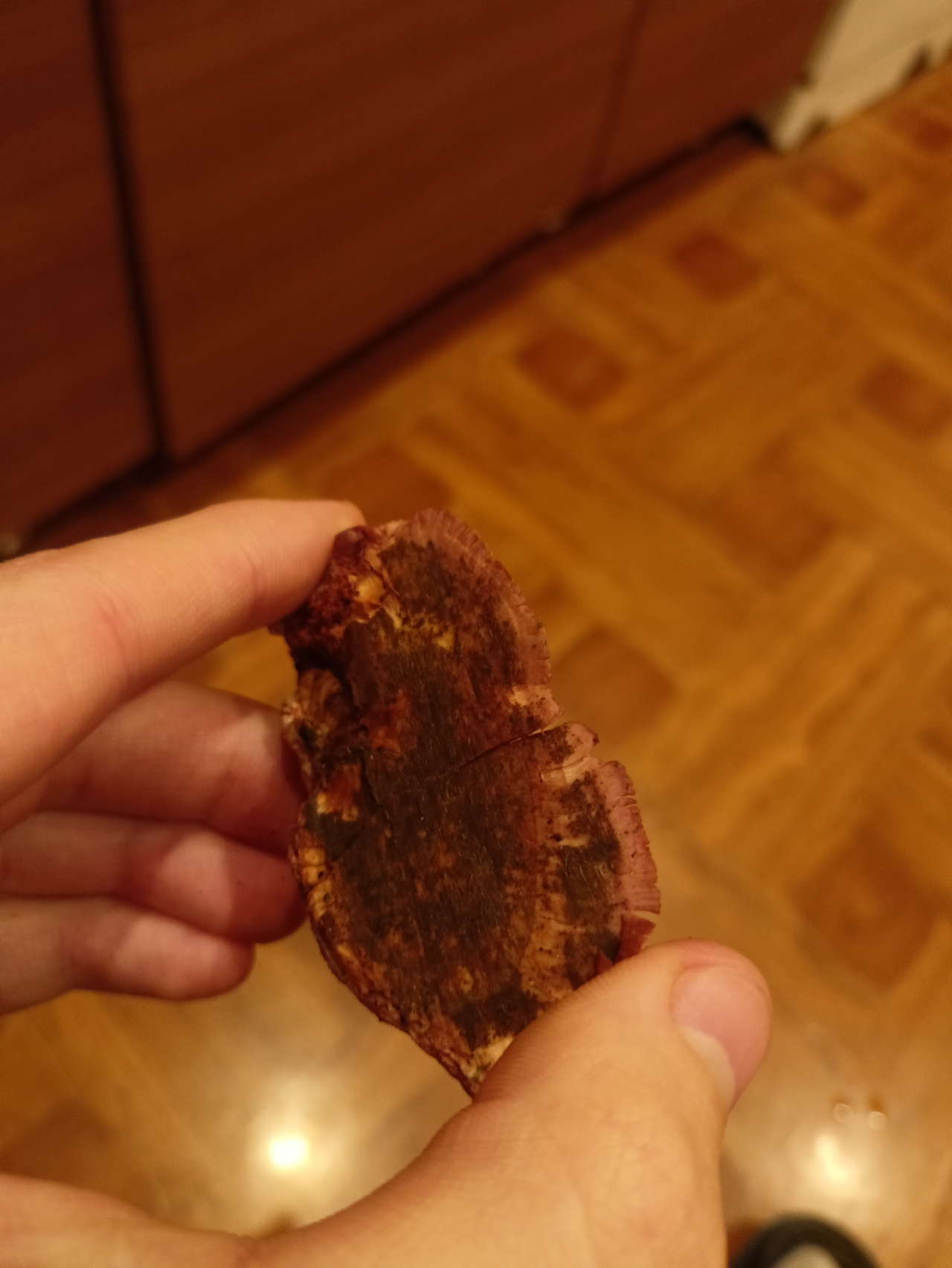 Описание гриба: Собирал в смешанных лесах. Левый (темно-красный) был собран с большого пня широколиственного дерева, а правый с поваленной сосны). Запах приятный, грибной. Левый гриб на срезе становится темно-красным.