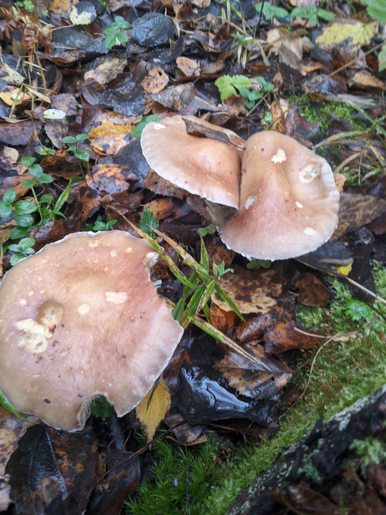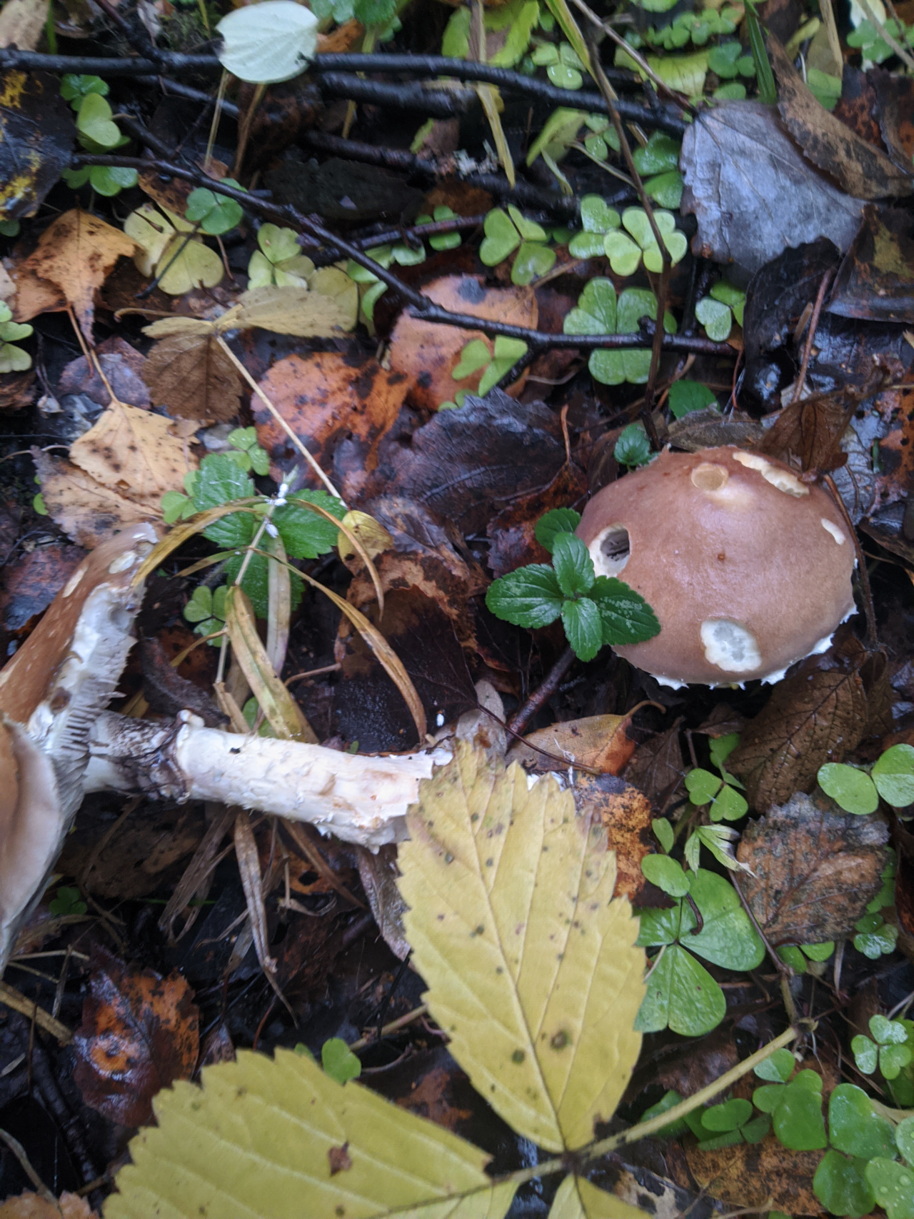 Грибы растут на опушке, часть рядом с берёзой и чась впритык к гнилому пню.