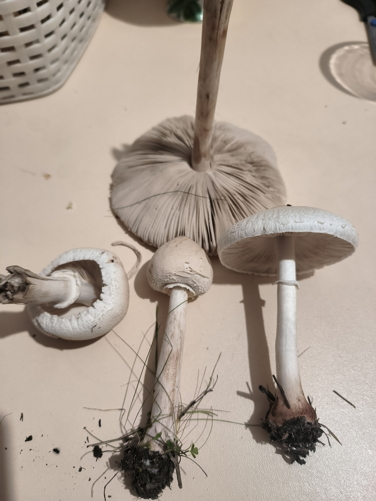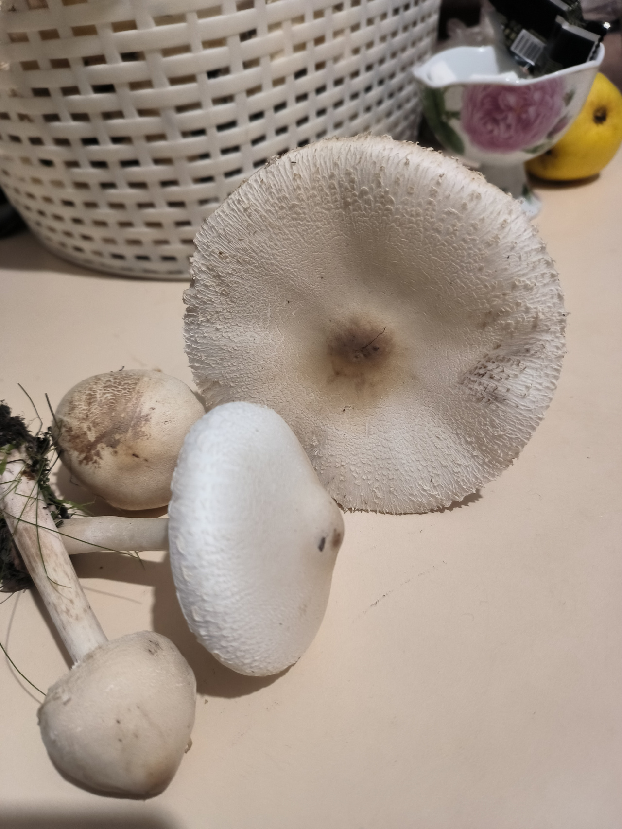Описание гриба: Растут большими группами на старых выпасах в предгорном районе. Все белые-светло-кремовые. Молодые — с куполообразной закрытой шляпкой и покрывалом. У взрослых шляпки раскрыты, у некоторых немного вогнуты. В центре шляпки бугорок, цветом, чуть темнее самой шляпки. На поверхности шляпки на некоторых грибах подобие чешуек. Пластины белые, светло-кремовые. Ножки тонкие, жесткие, жилистые, хрупкие с небольшим утолщением у основания. Запаха нет.