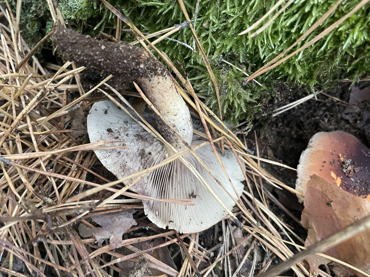Описание гриба: Гриб старенький, раскрытый. Низ — пластинки. Шляпка матовая. Размер шляпки примерно 5-6см.