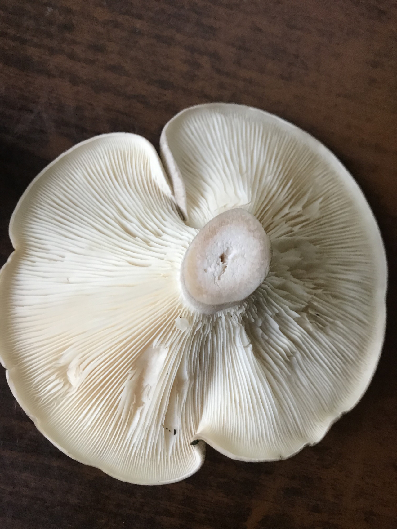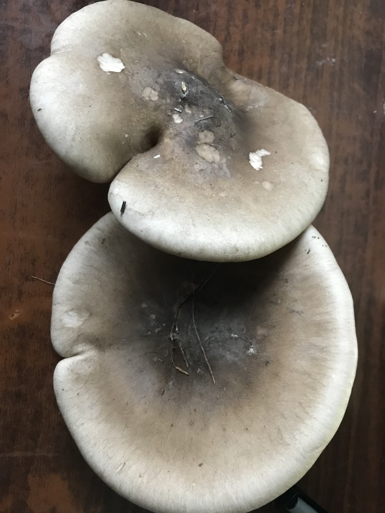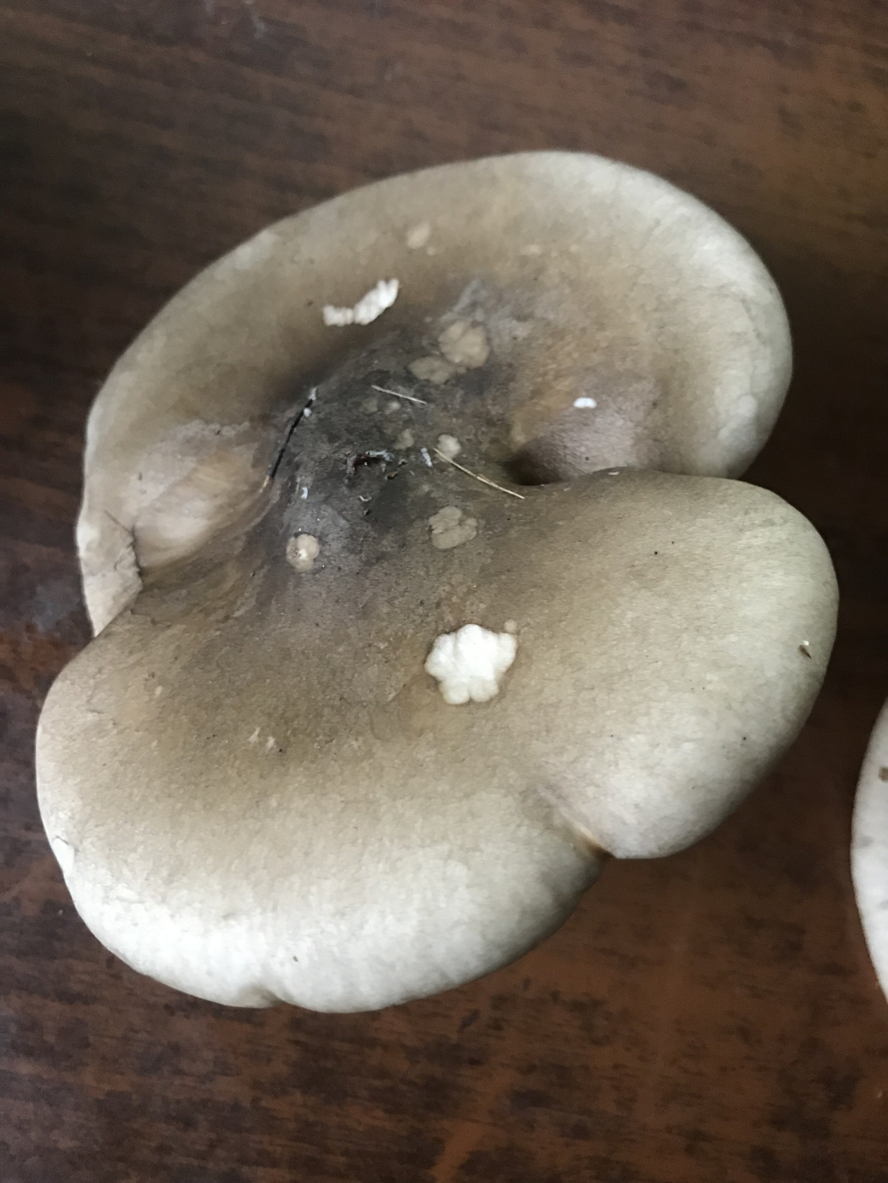 Описание гриба: Размер грибов от 5 и более 10 см в диаметре,шляпка серая распростертая с бугорком в середине,споровая масса пластинчатая белая,запах слабый негрибной,не очень приятный.Найдены в смешанном лесу.Подскажите,пожалуйста что это за грибы.