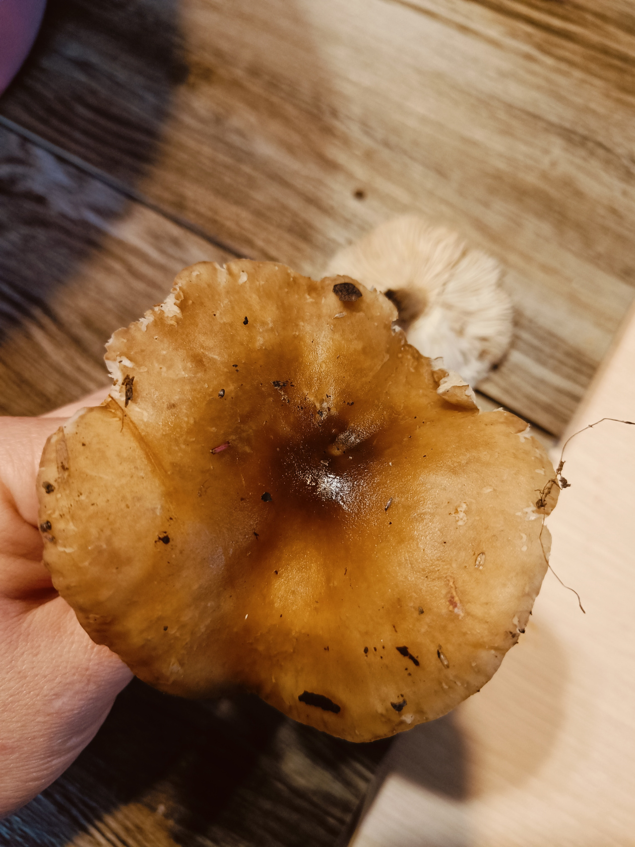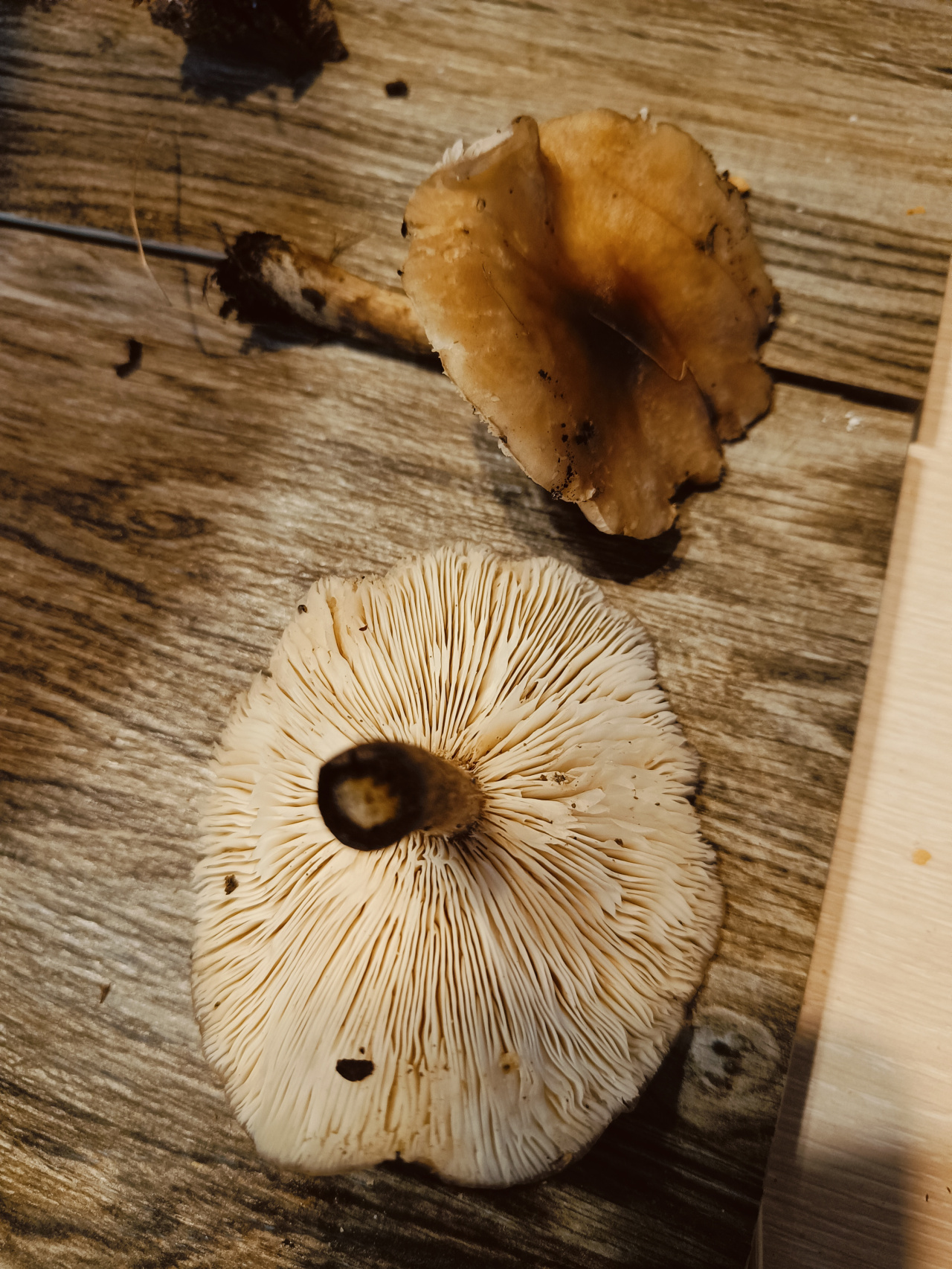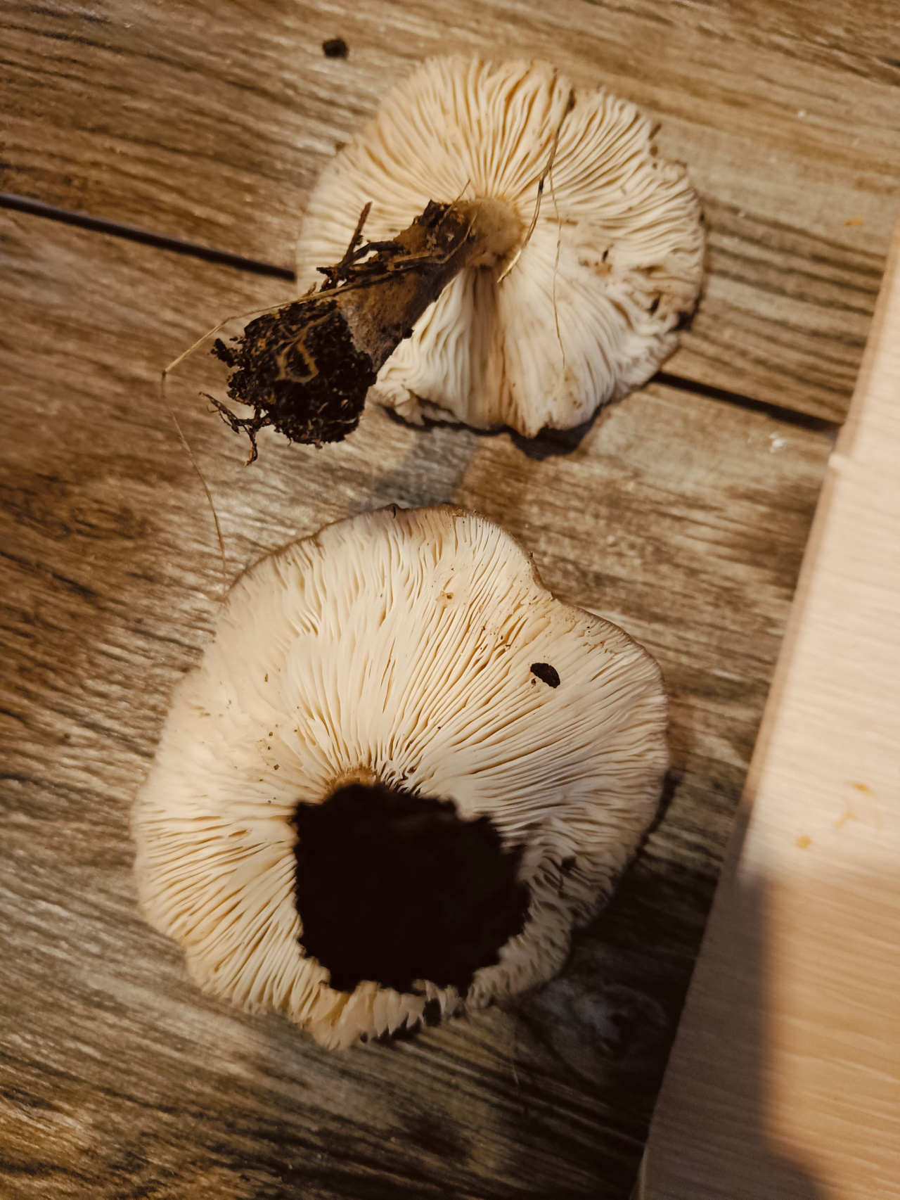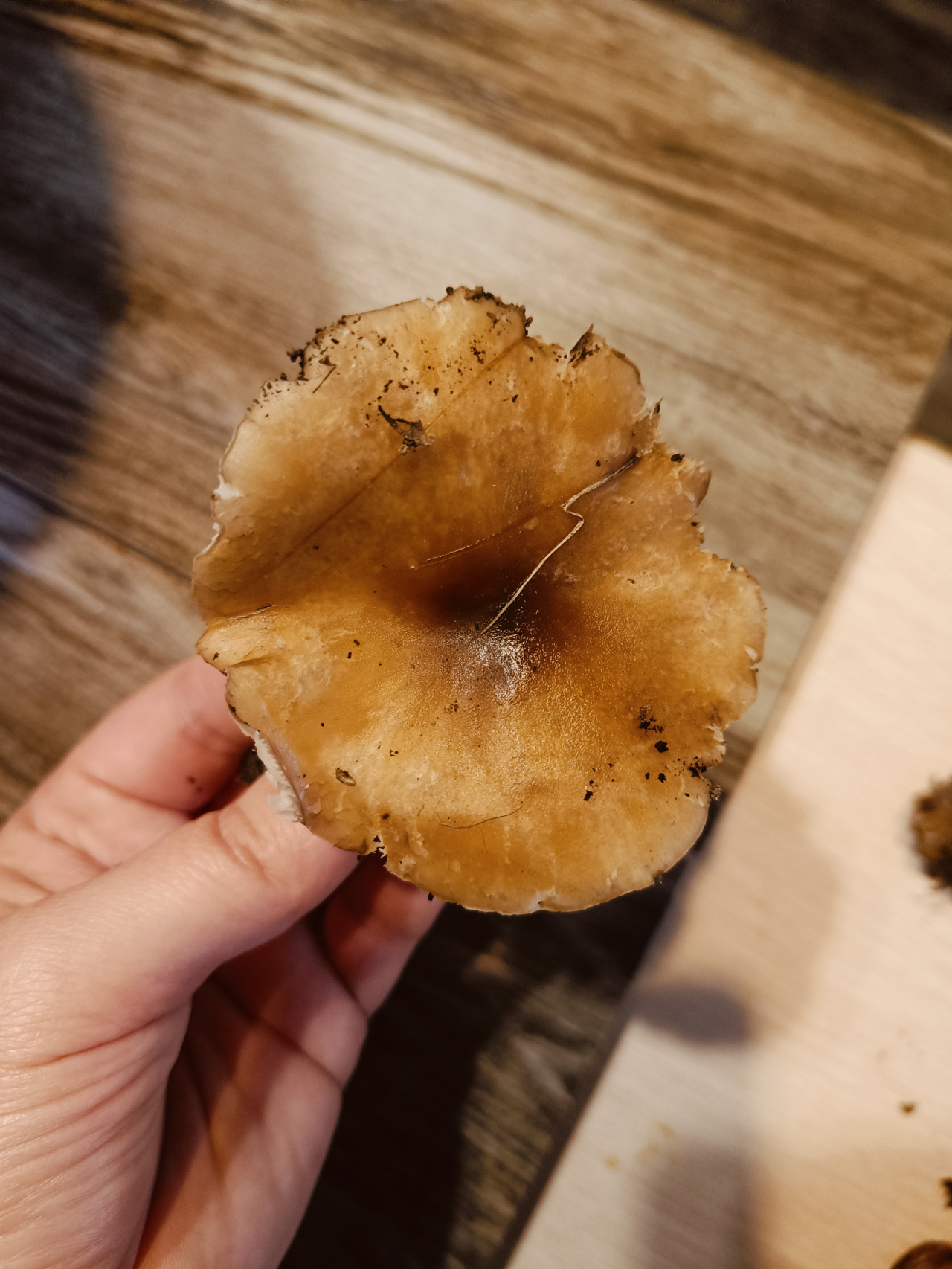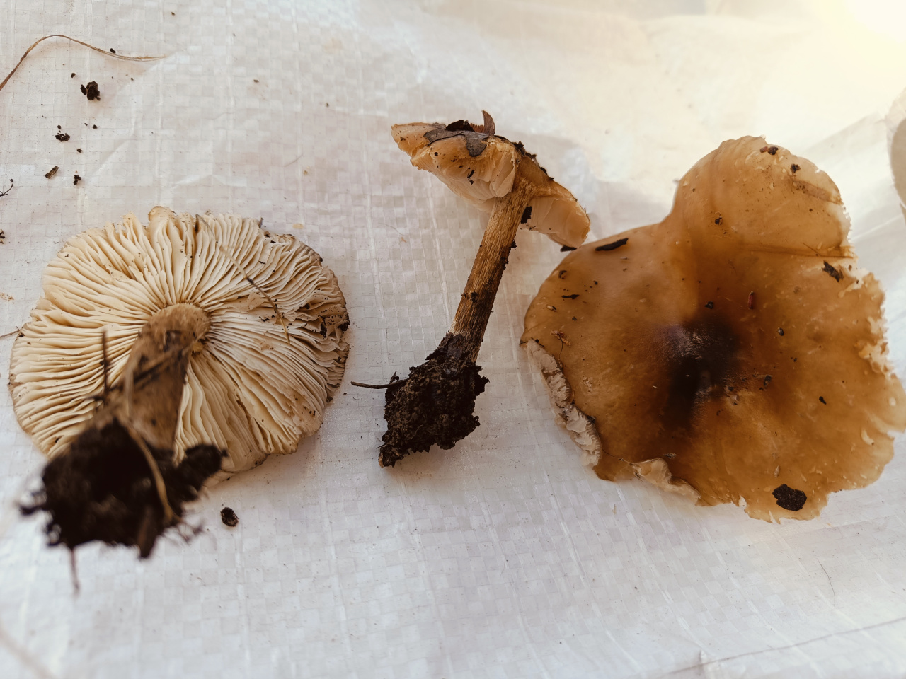Описание гриба: Лес лиственный, росли как в ямке на расстоянии по одну двум. В районе метра было штук 10-12. Запах слабый грибной. При отрезании ножки срез потемнел. Подскажите что за грибы? Съедобный?