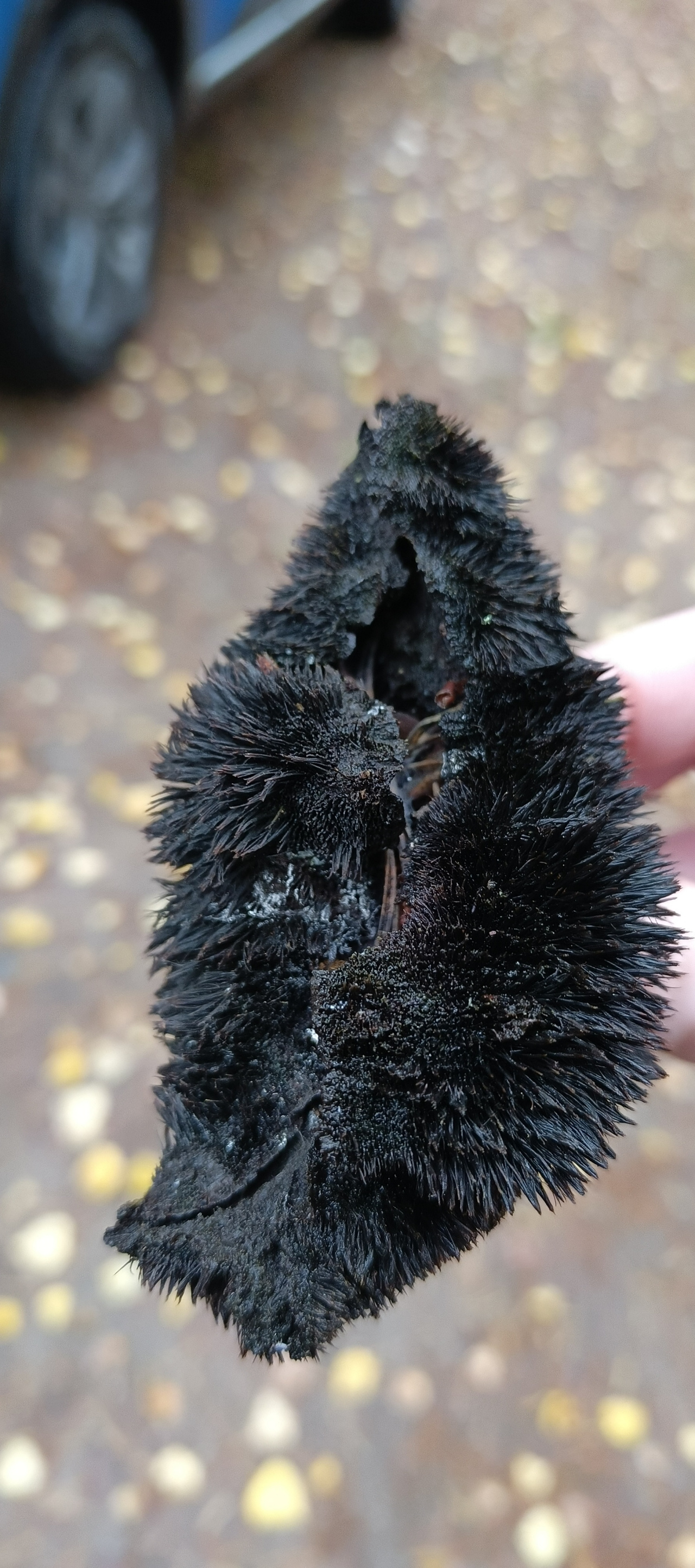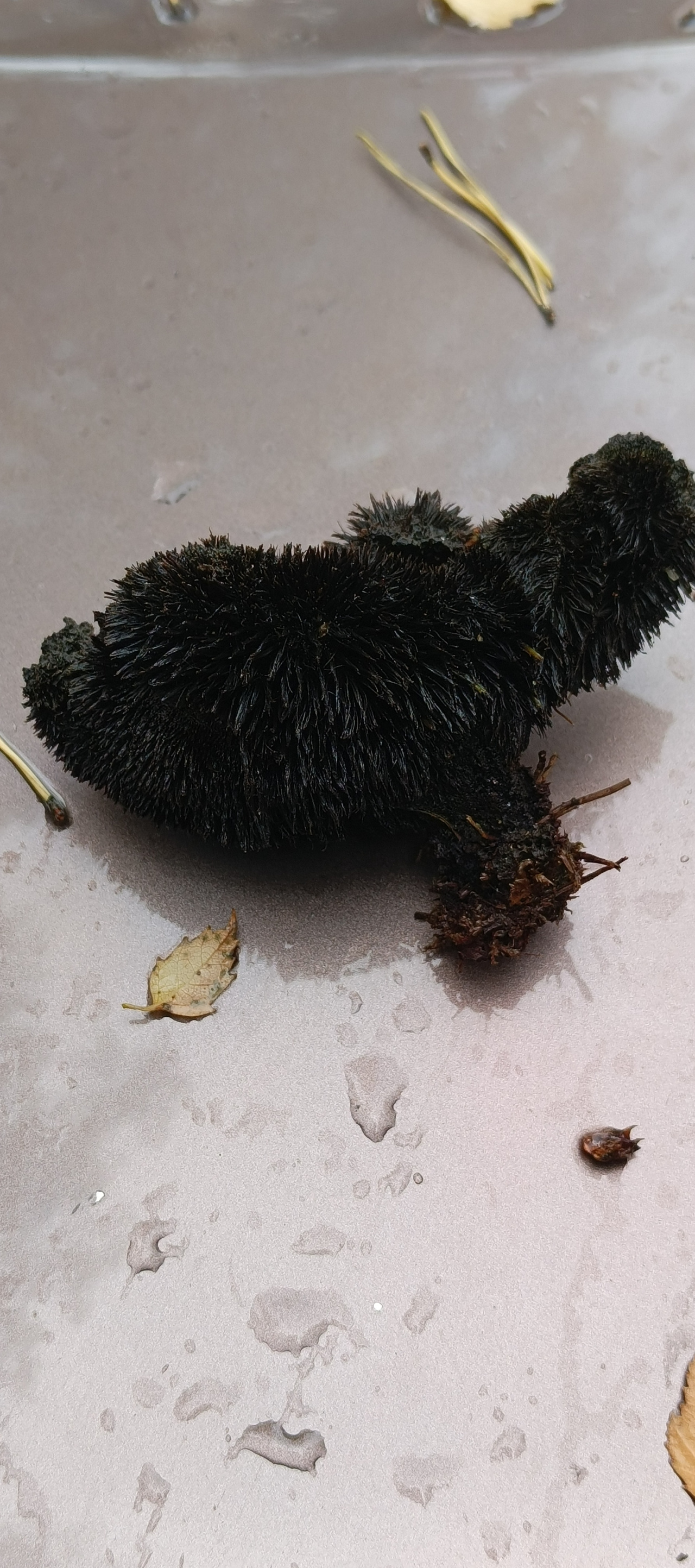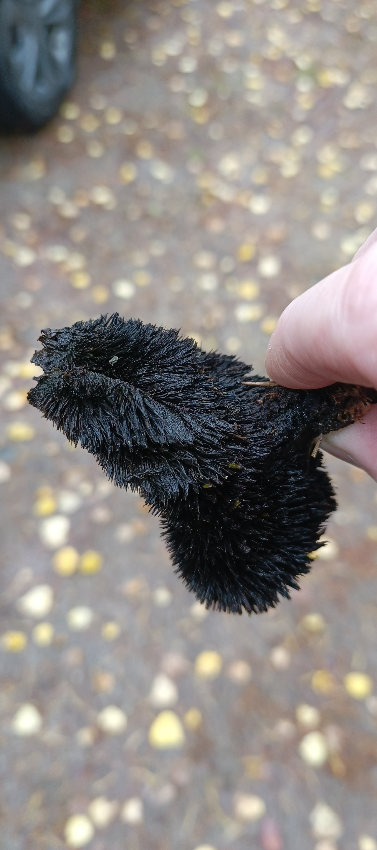 Описание гриба: Ленинградская область. Сосновый бор. Рос на земле. Похож на ежовика, только черный.
