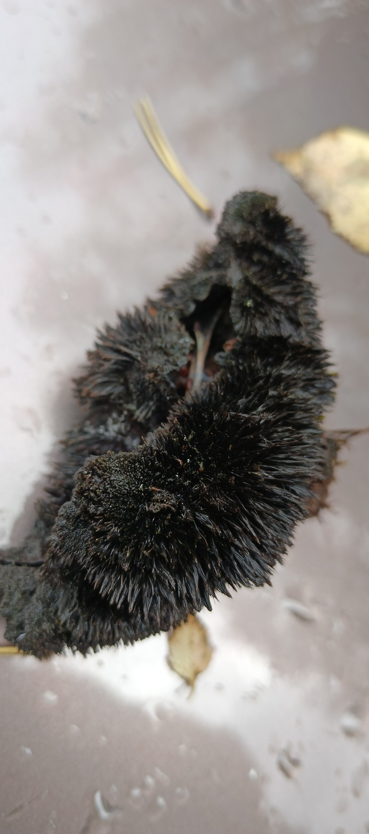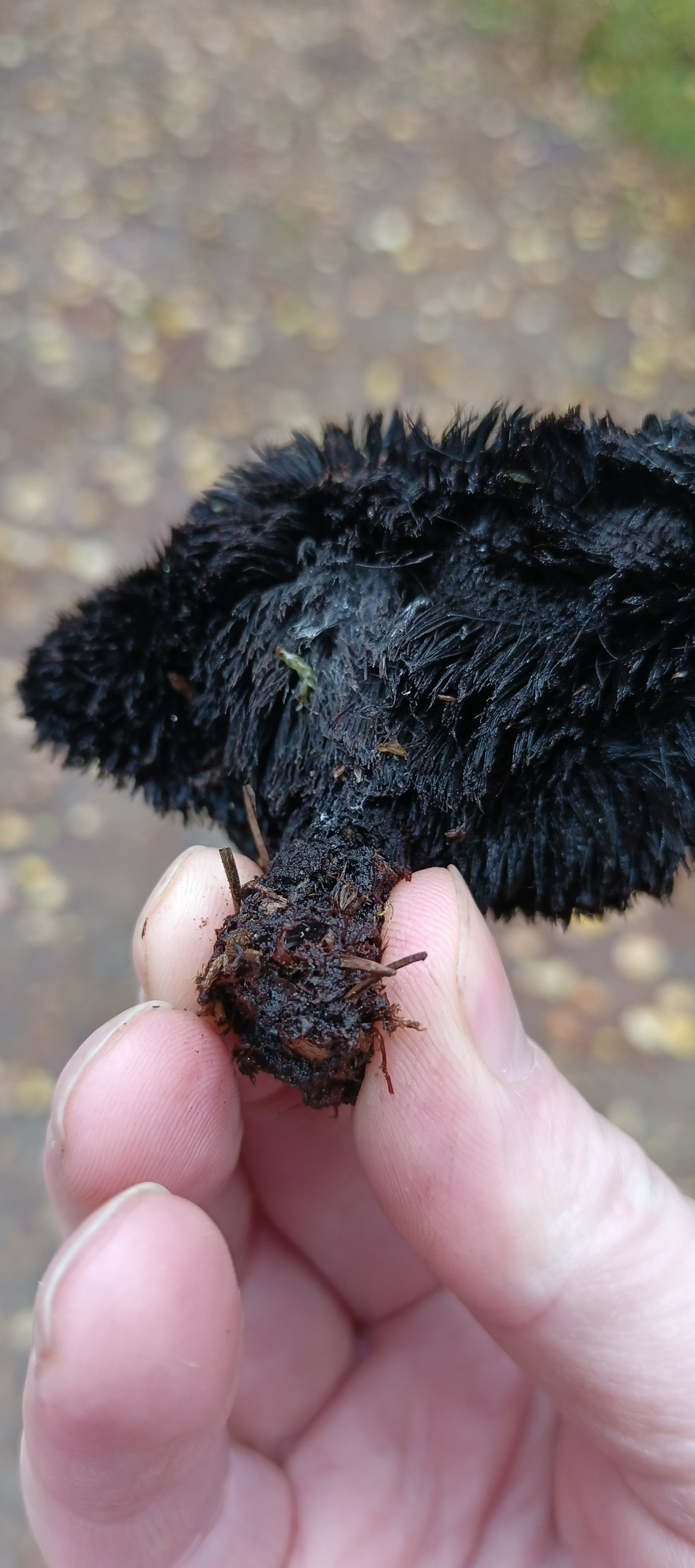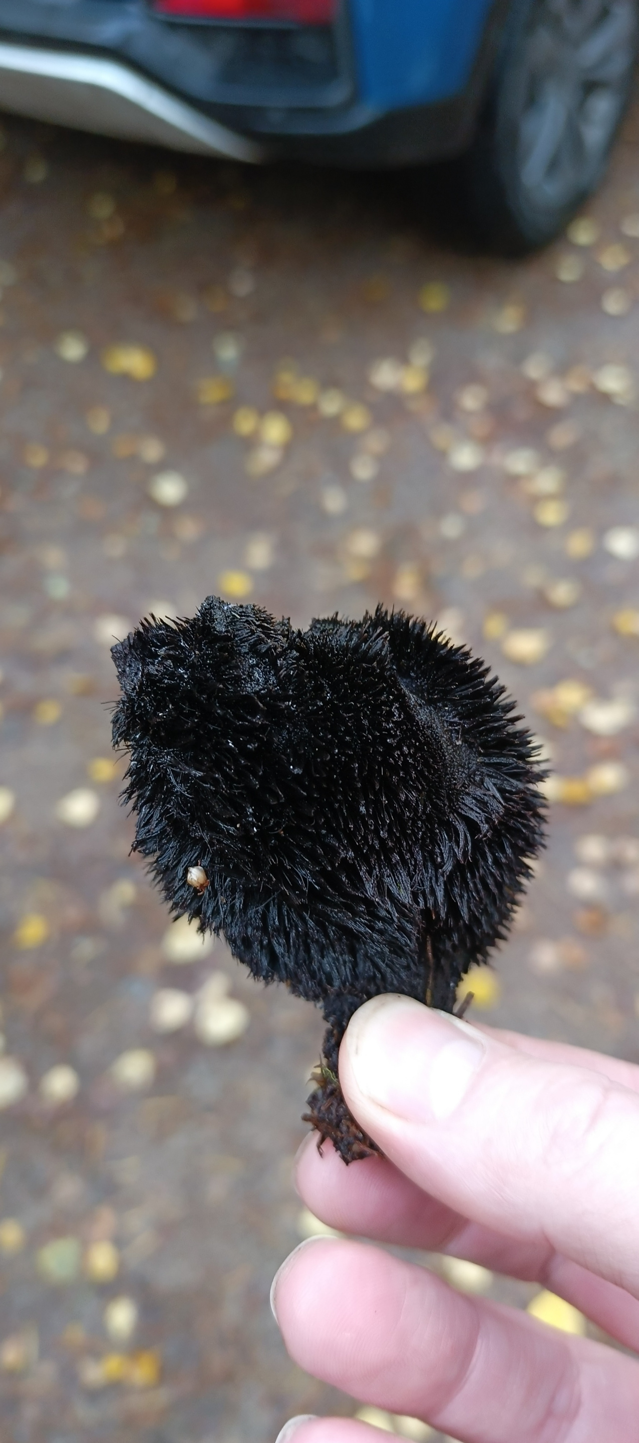 Описание гриба: Ленинградская область. Сосновый бор. Рос на земле. Похож на ежовика, только черный.
