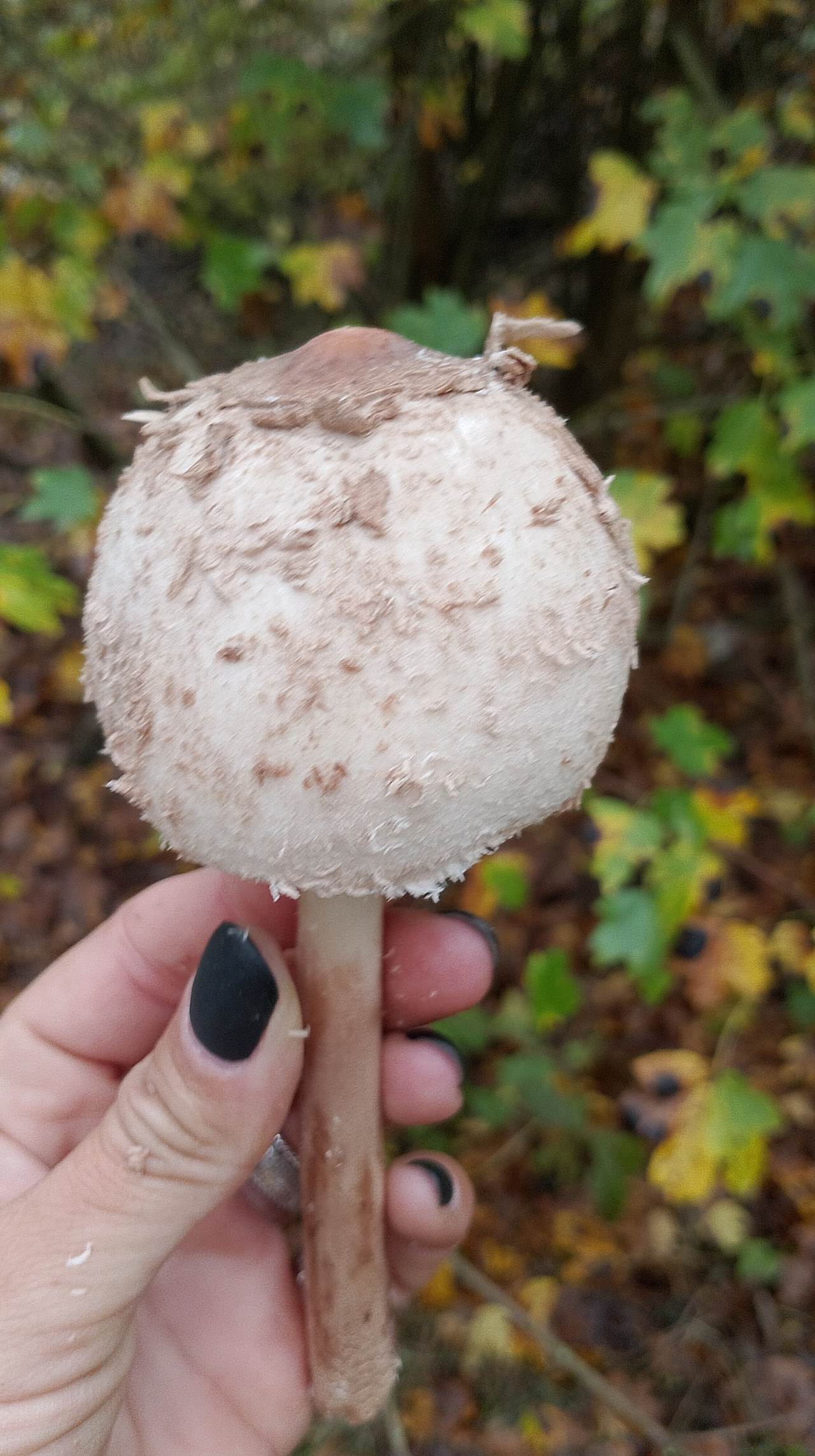 Молодой зонтик. Пёстрый или Краснеющий, ножку на фото плохо видно. Посмотрите: https://wikigrib.ru/grib/zontik/