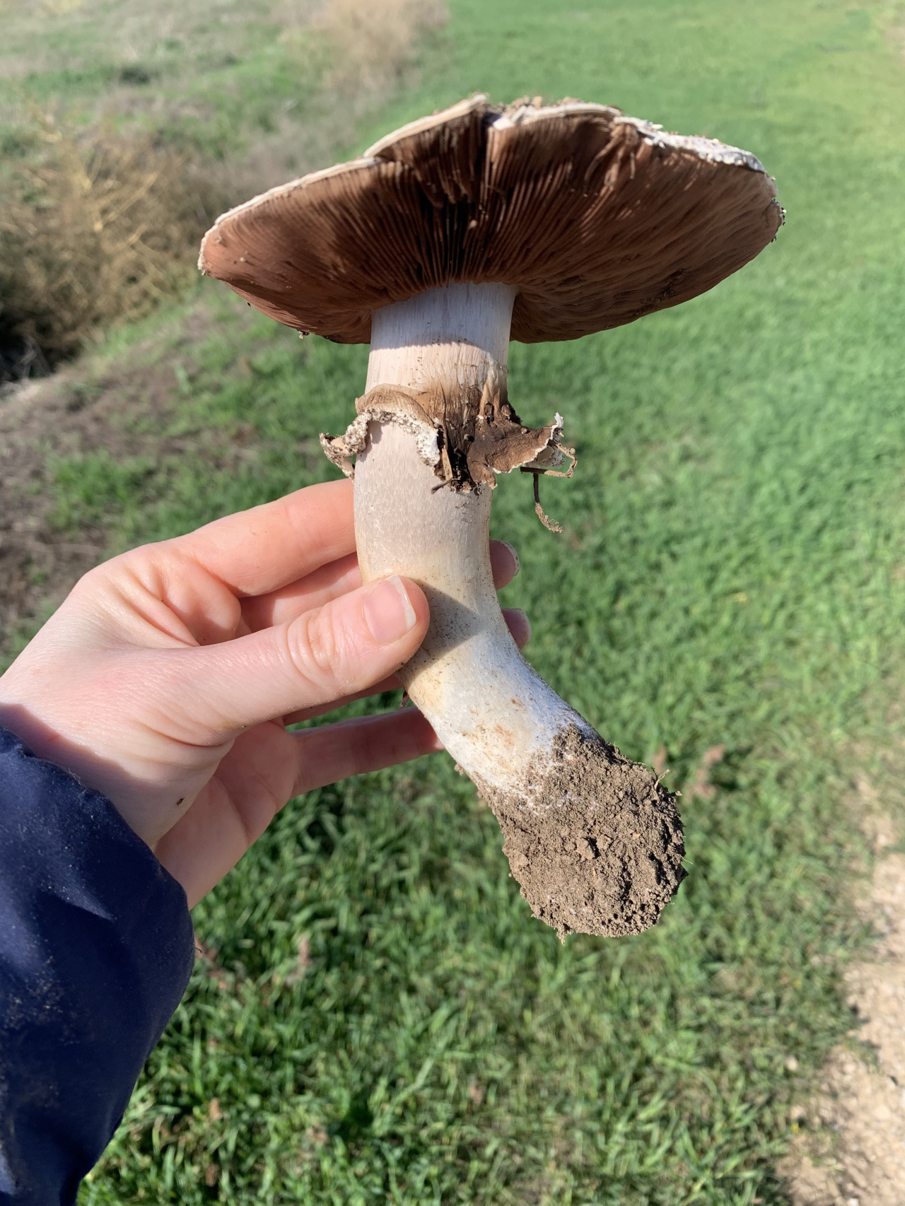 Описание гриба: Пахнет как шампиньоны, белая шляпка, есть юбочка, растет в поле