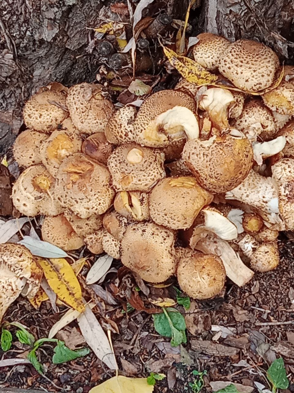 Описание гриба: Растут семьёй у подножья тополя, бежевый цвет, цвет не меняет при надавливании, приятный грибной запах, ножка утолщённая, чешуйчатый покров гриба, парковая зона