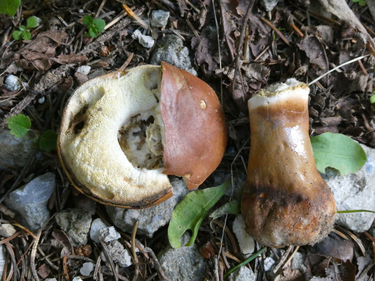 Описание гриба: польский? желчный? рос на склоне у тропы в смешанном лесу, очень червивый уже