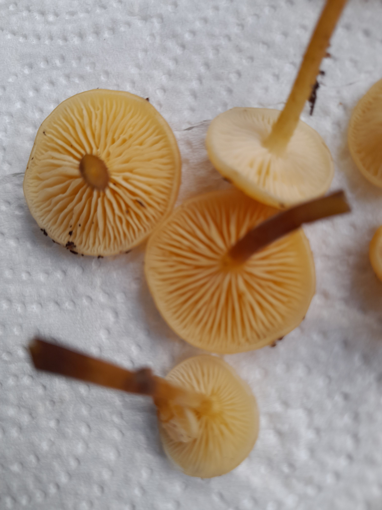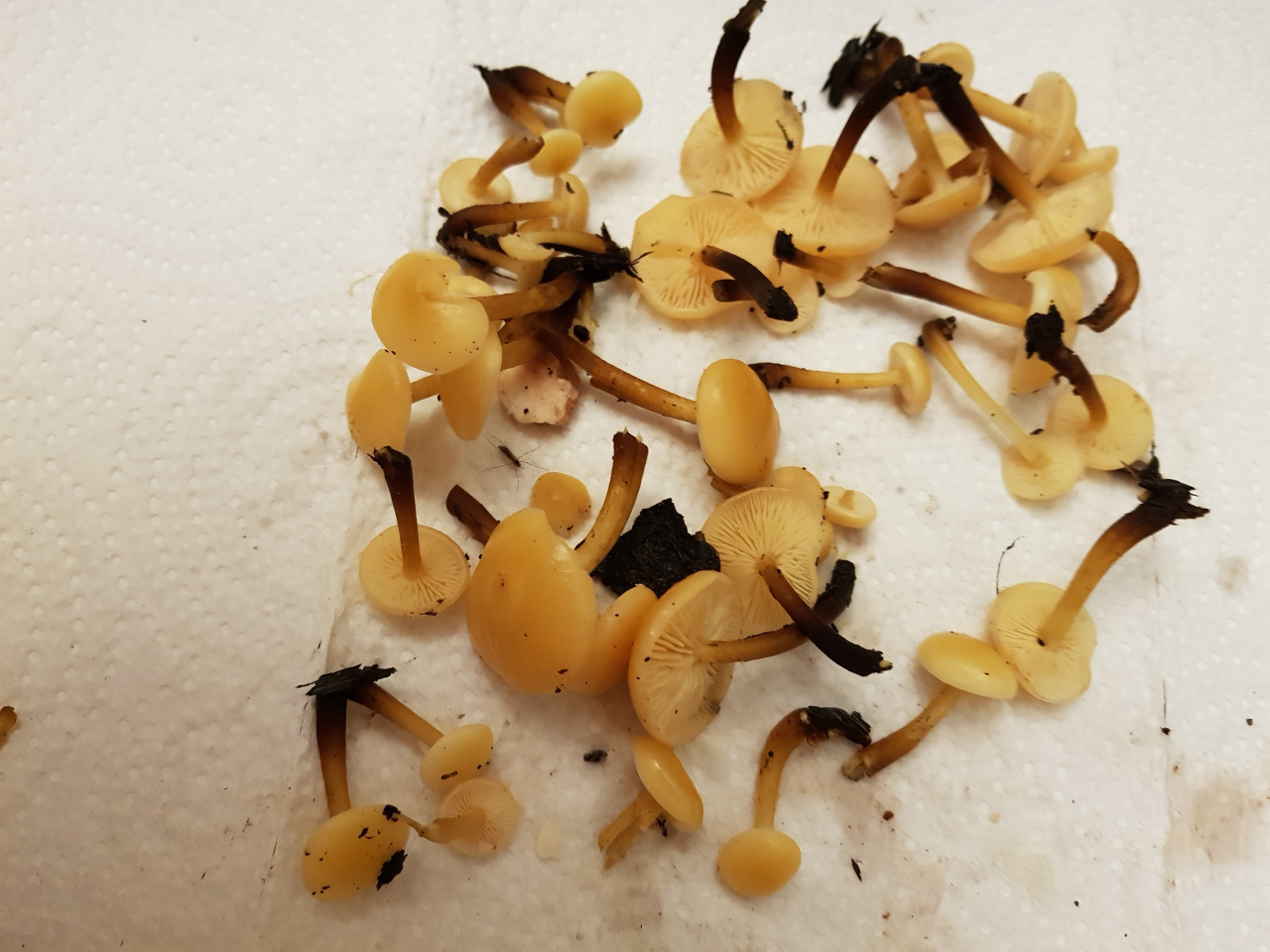 Описание гриба: Здравствуйте. Подскажите, пожалуйста, что за грибы. Собраны в середине октября в Ленинградской области. Только начали расти, мелкие совсем. Росли на поваленном дереве у ручья. Запах слабый. Был подморожен и очень скользкая шляпка. После подсыхания на шляпке появились концентрические круги.