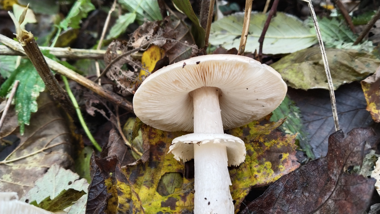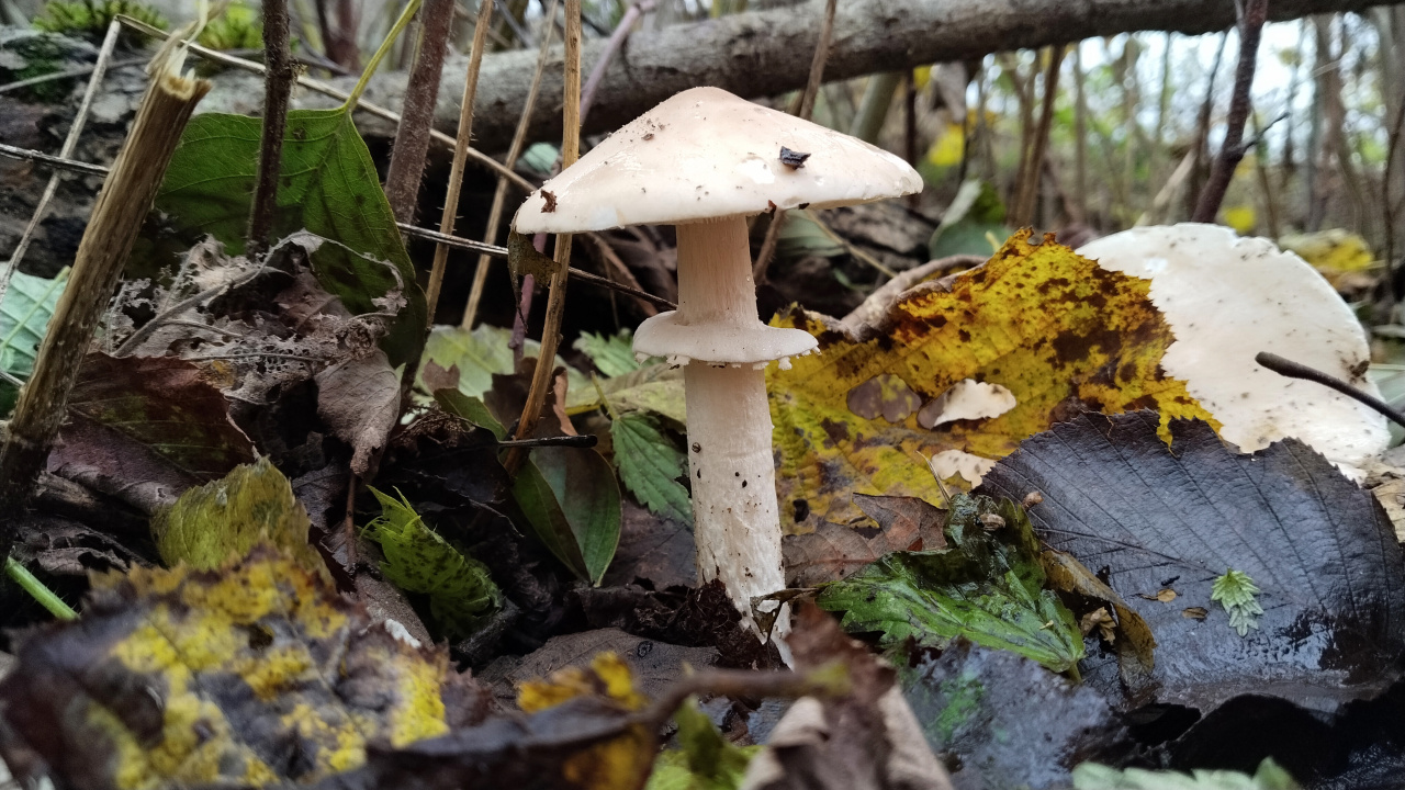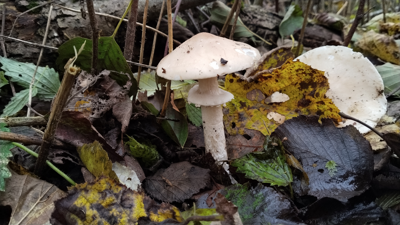 Грибы не более 15 см высотой. Шляпка светло-бежевая, в центре темнее. Пластинки белые, есть кольцо юбочкой. Ножка сплошная. Вольвы не было.