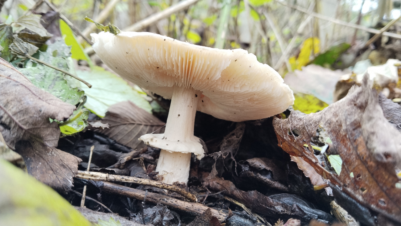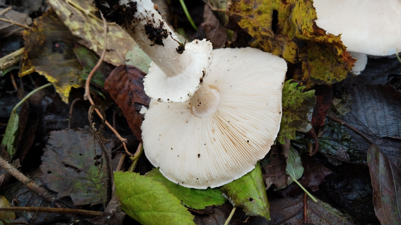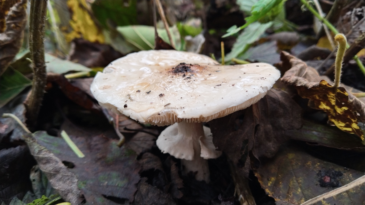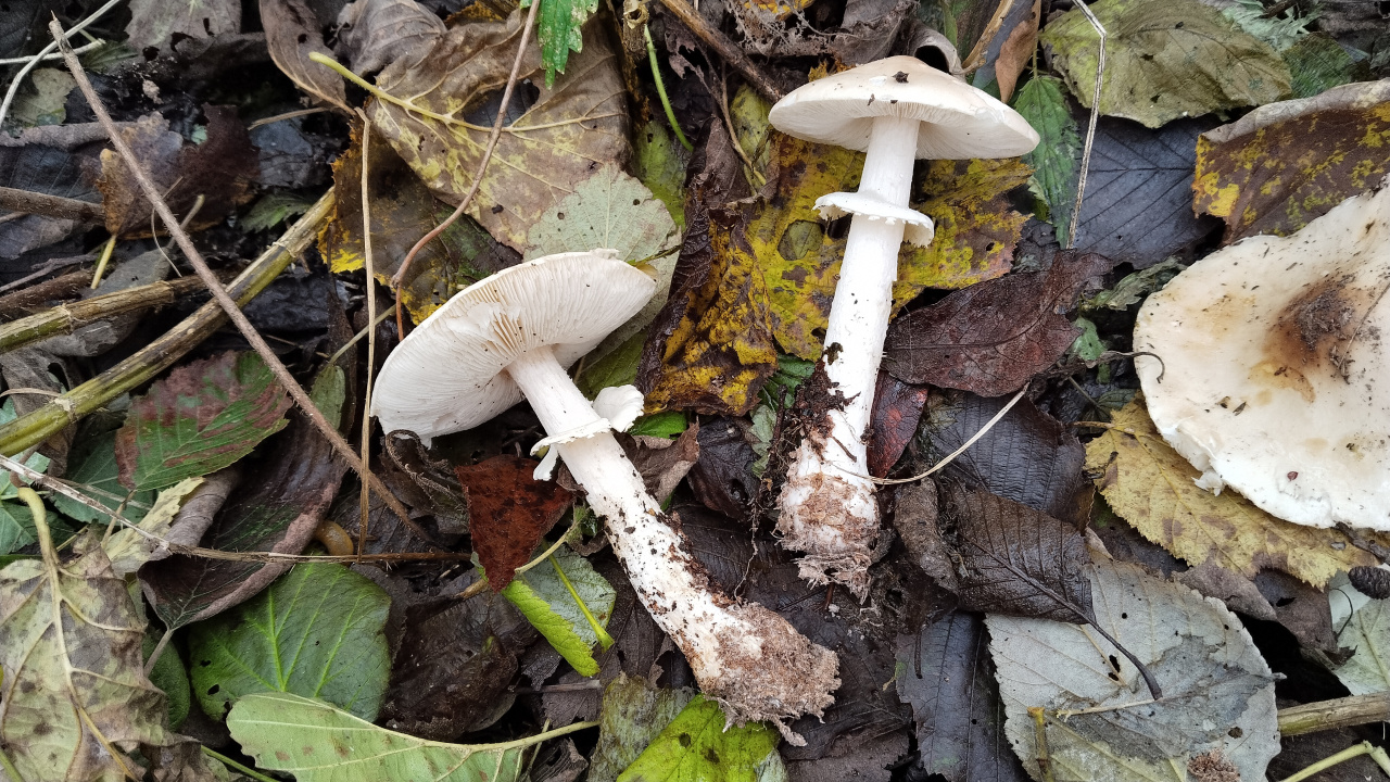 Грибы не более 15 см высотой. Шляпка светло-бежевая, в центре темнее. Пластинки белые, есть кольцо юбочкой. Ножка сплошная. Вольвы не было.