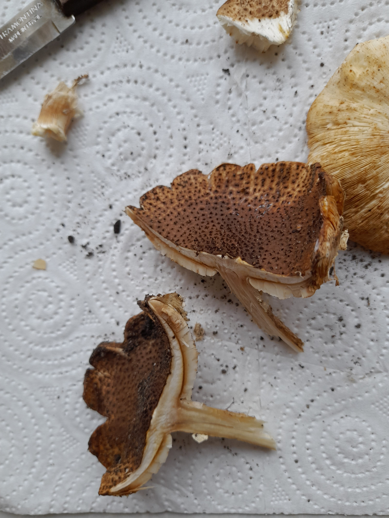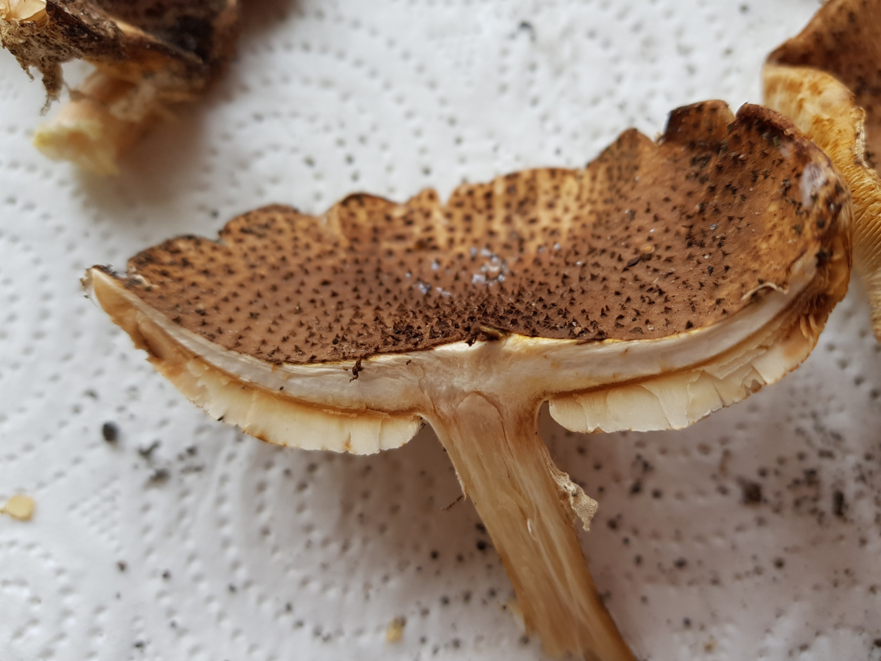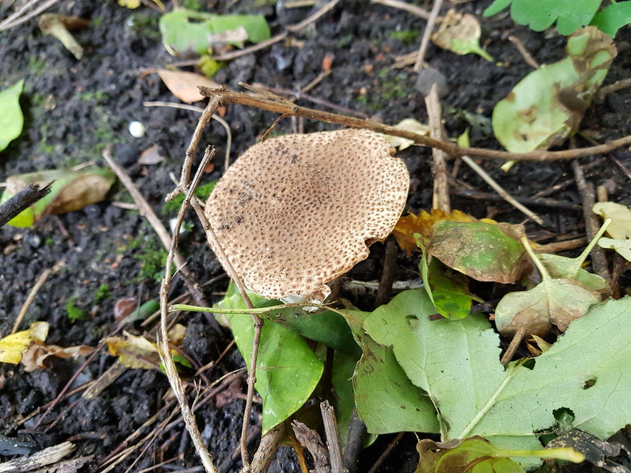 Описание гриба: Парк в Санкт-Петербурге, 20 октября. Рос в кустах. Шляпка бежево-коричневая. Чешуйки темнее, на них черные шипики пирамидальной формы с острым верхом. Легко осыпаются. Запах грибной, приятный, напоминает шампиньон. Цвет на срезе не меняет, светло-бежевый, почти белый. Ножка полая, длиной около 6см, диаметр 1см. Шляпка 7.5-8см.