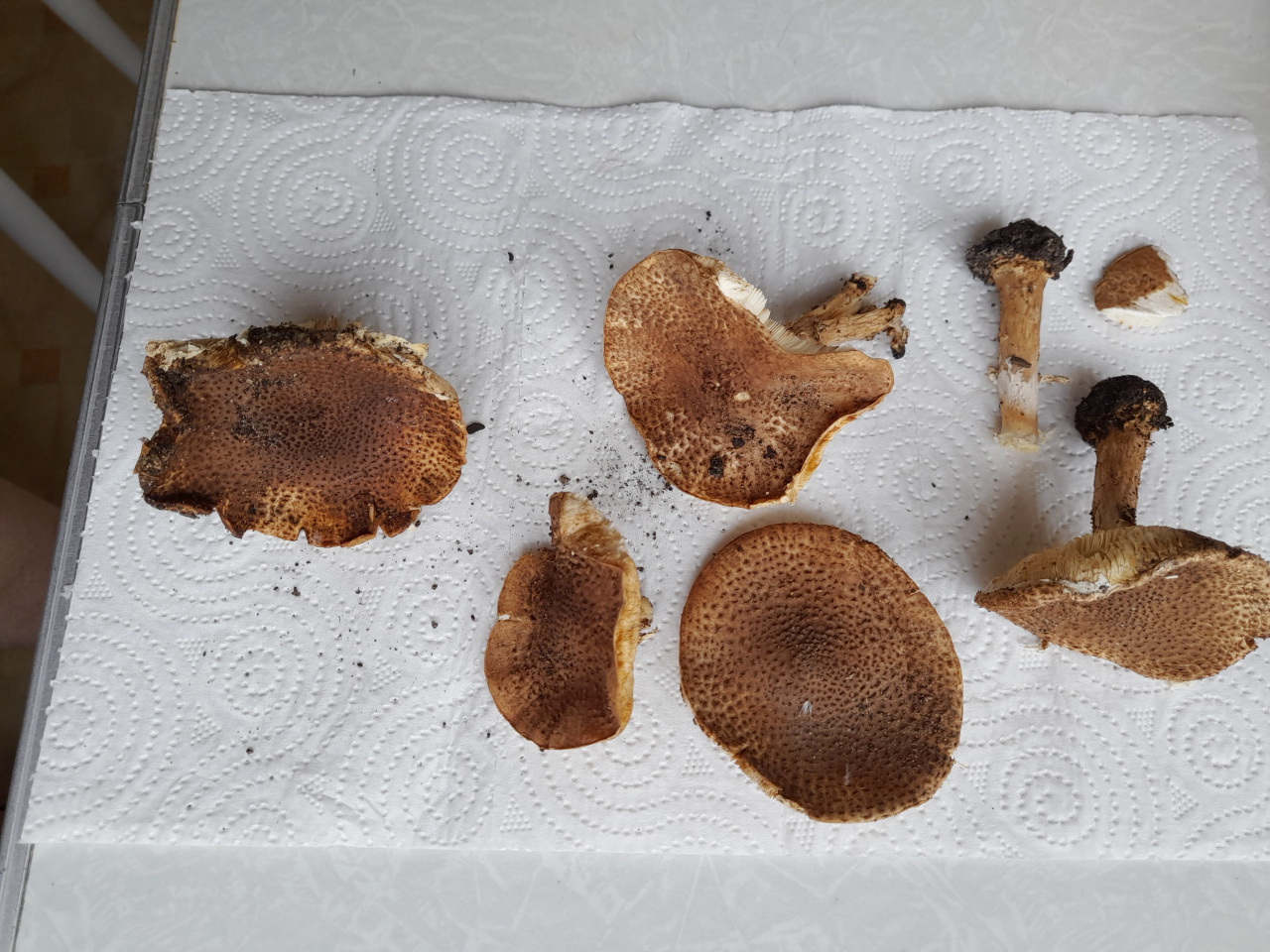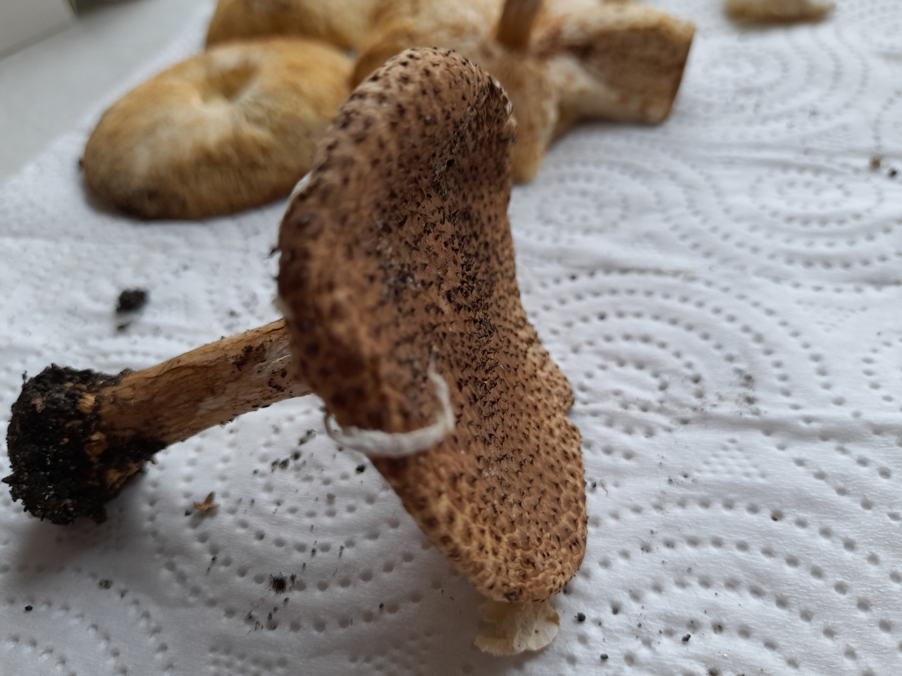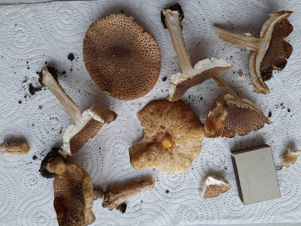 Посмотрела еще одну с шипиками — непохожа. У Echinoderma perplexum шляпка шерстисто-войлочная, ножка кремово-белая, красновато-коричневая у основания, которое может быть покрыто мелкими, более тёмными, зернистыми чешуйками; с кортиновидной, войлочно-шерстянистой, , войлочно-шерстянистой, преходящей, беловатой или охристой кольцевой зоной. На моей ни войлочности, ни шерстистости нет.