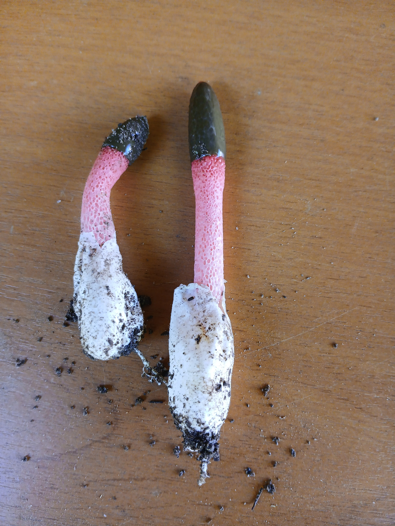 Описание гриба: Розовая шляпка, вытянутая. Ножка белая. Размер около 5 см. Место обитания парник помидорный в огороде.