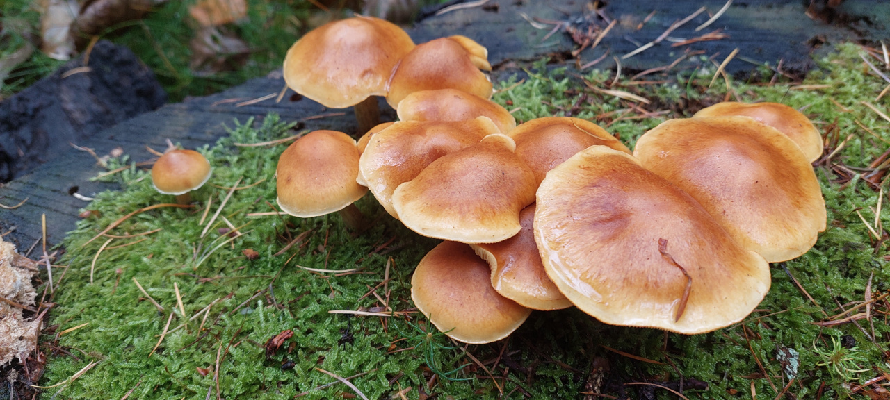 Растёт как и семейками на пне. Так и одиночками на мхе