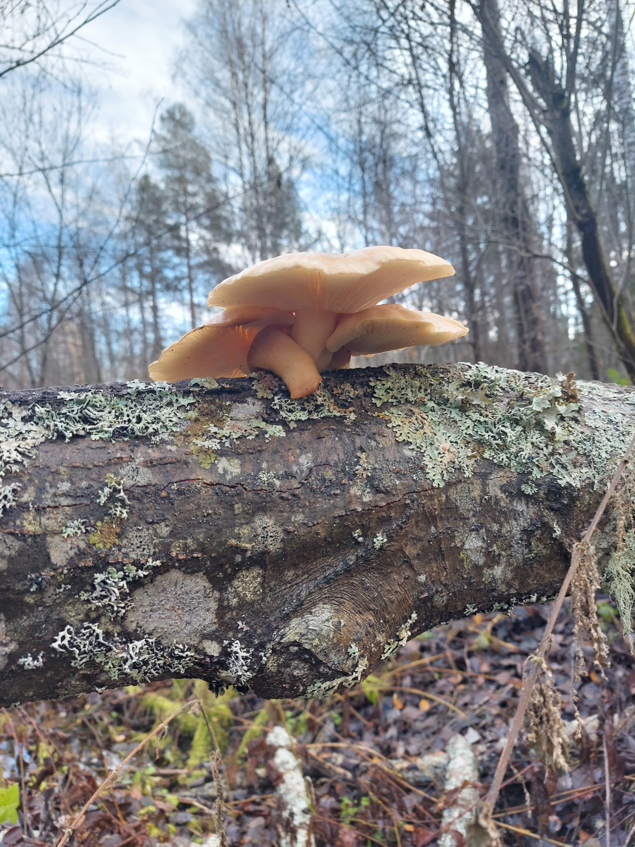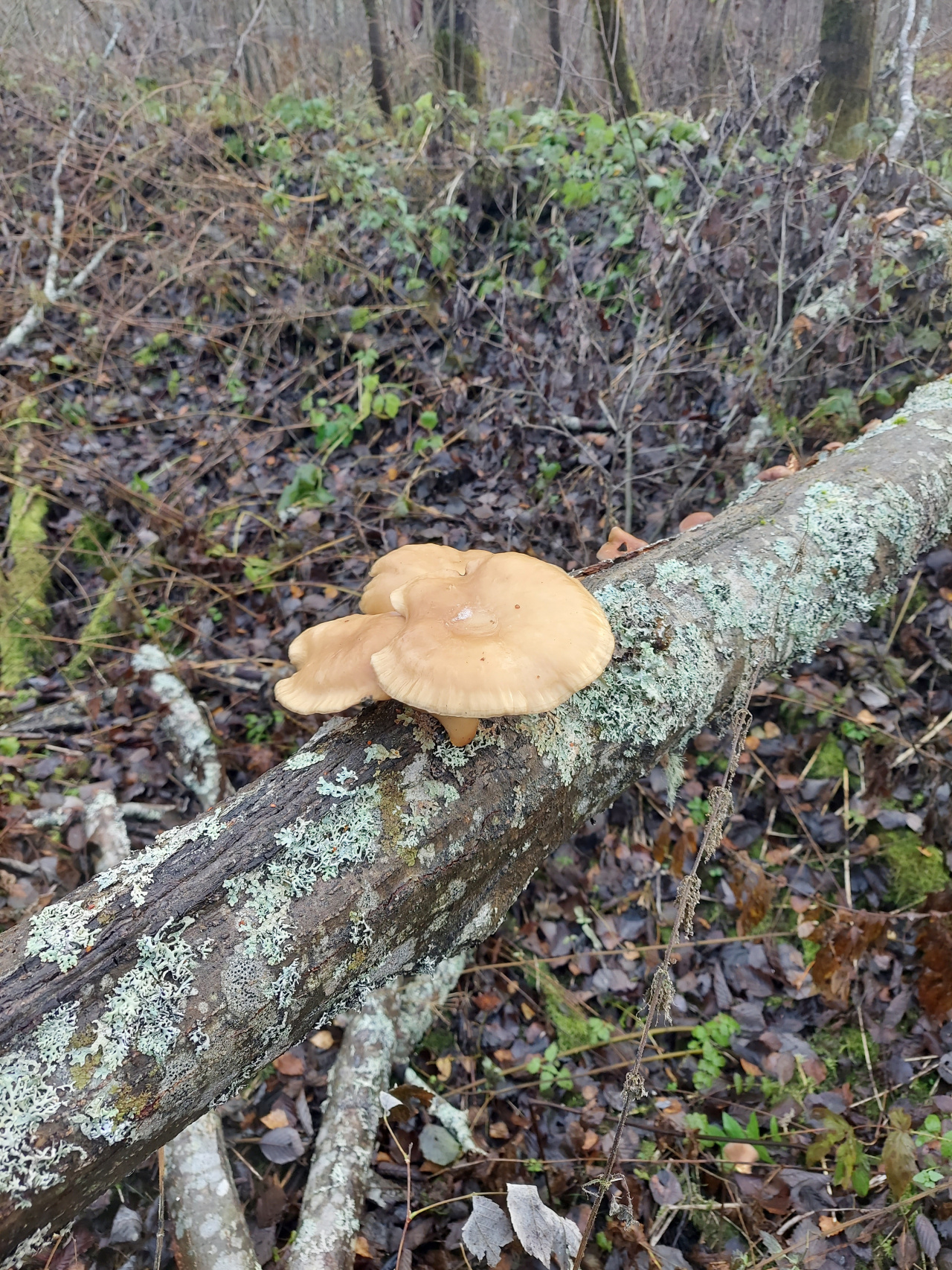 Описание гриба: Мокрый смешанный лес, юг Архангельской области, конец октября. Плотная группа из трех плодовых тел на поваленном дереве, похоже на вешенки, но пластинки не приросшие к ножкам и более хрупкие, чем обычно у вешенок, очень светло-кремовые, почти белые. Сами ножки более выражены, чем привычно для вешенок; и, главное, грибы имеют горький вкус даже после получасовой жарки.