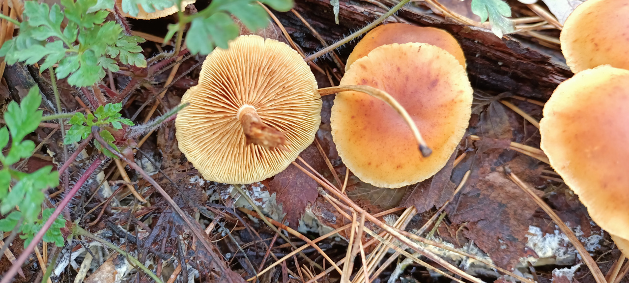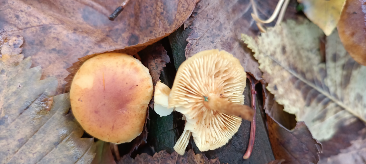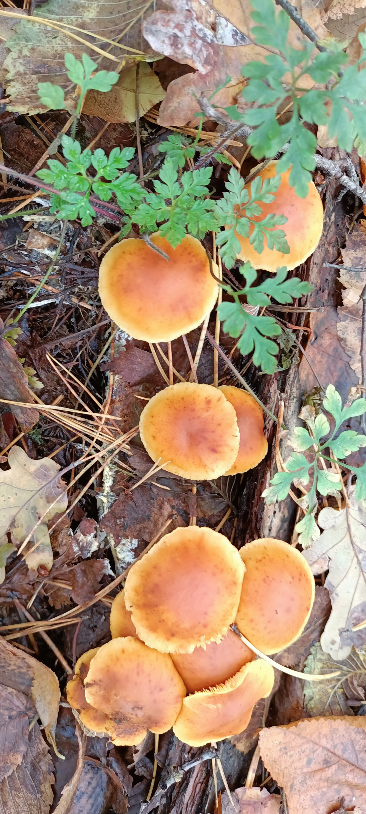 Описание гриба: Пожалуйста, подскажите,что это за грибы, растут в Киевской обл. в октябре, как опята на старых ветках и пнях в смешанном лесу