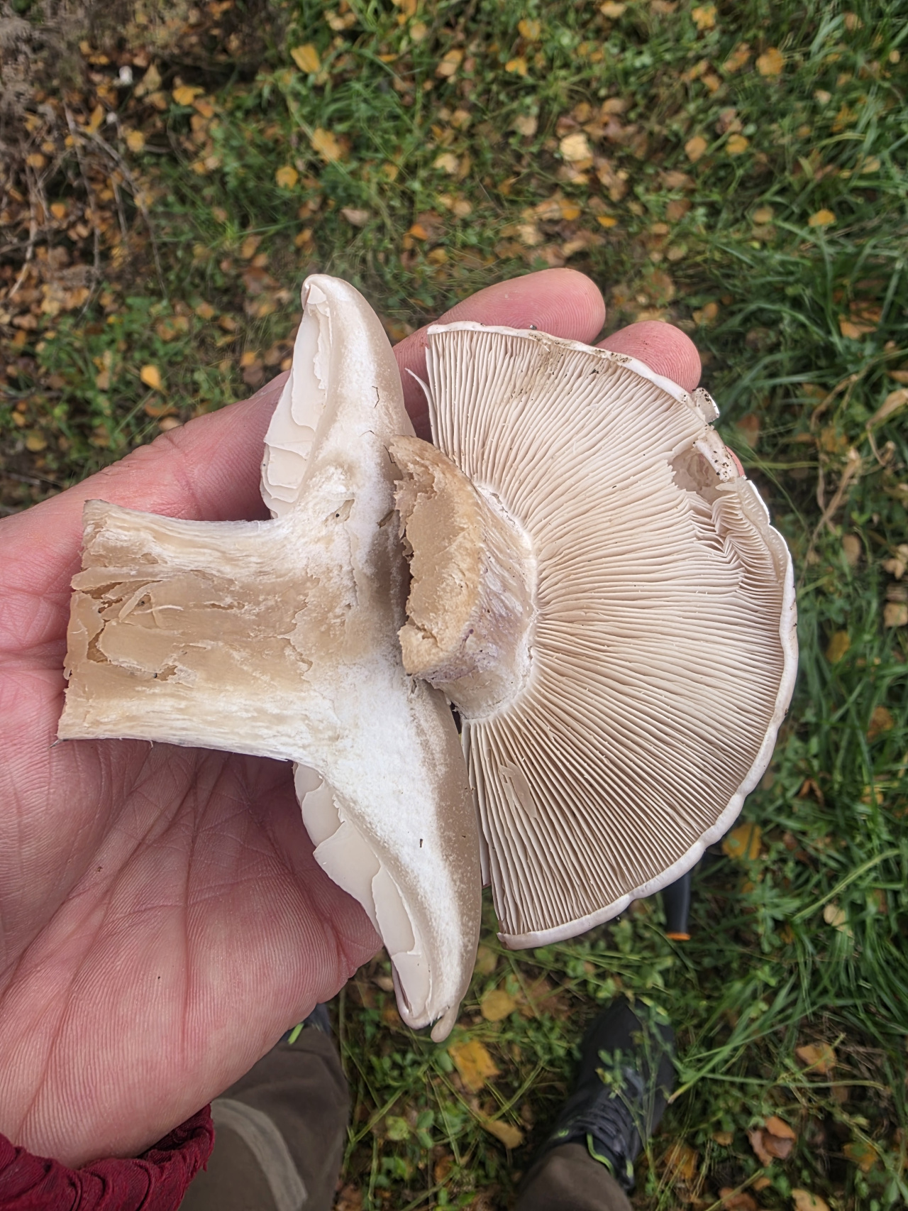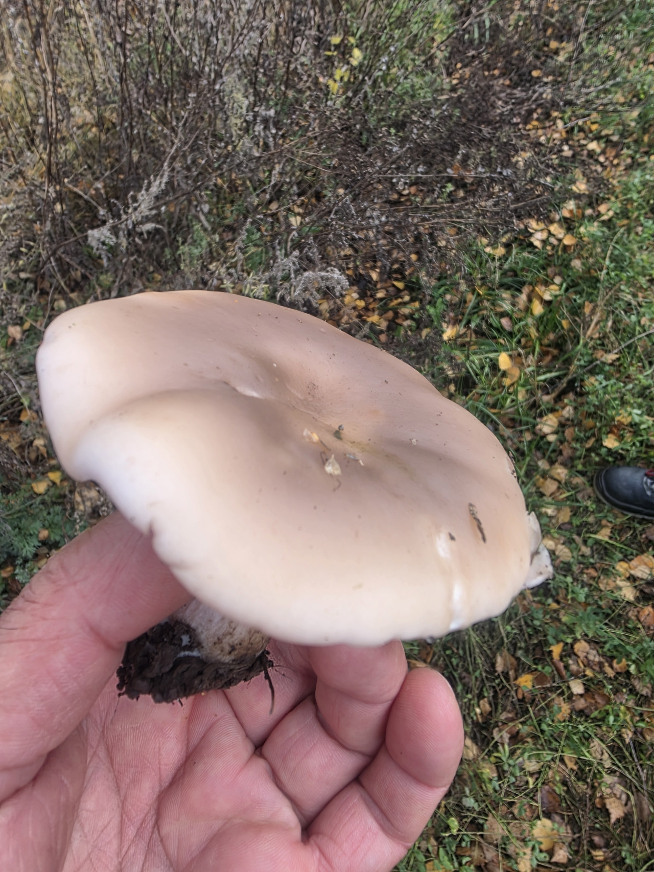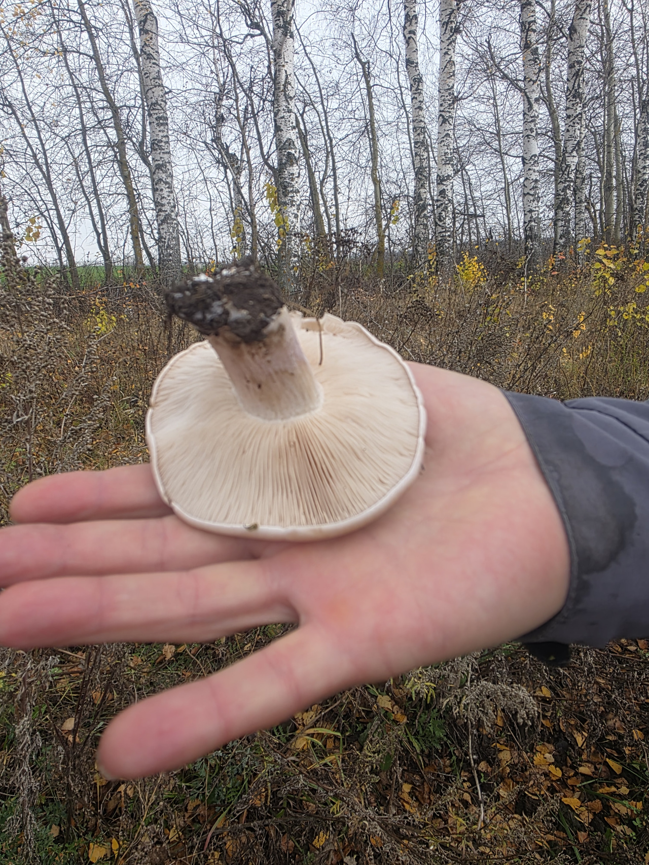 Описание гриба: 26.10.25, поздняя осень. Обычно в это время уже минусовые температуры. В этом году тепло. Сегодня днем +7, ночью +3. Чувашская Республика, Лесозащитные наслаждения между сельхозполями. Берёза, тополь. В поисках вешенки, в траве, рядом с пашней с озимыми, нашёл плотный, красивый гриб с виду похож на рядовку. Запах приятный