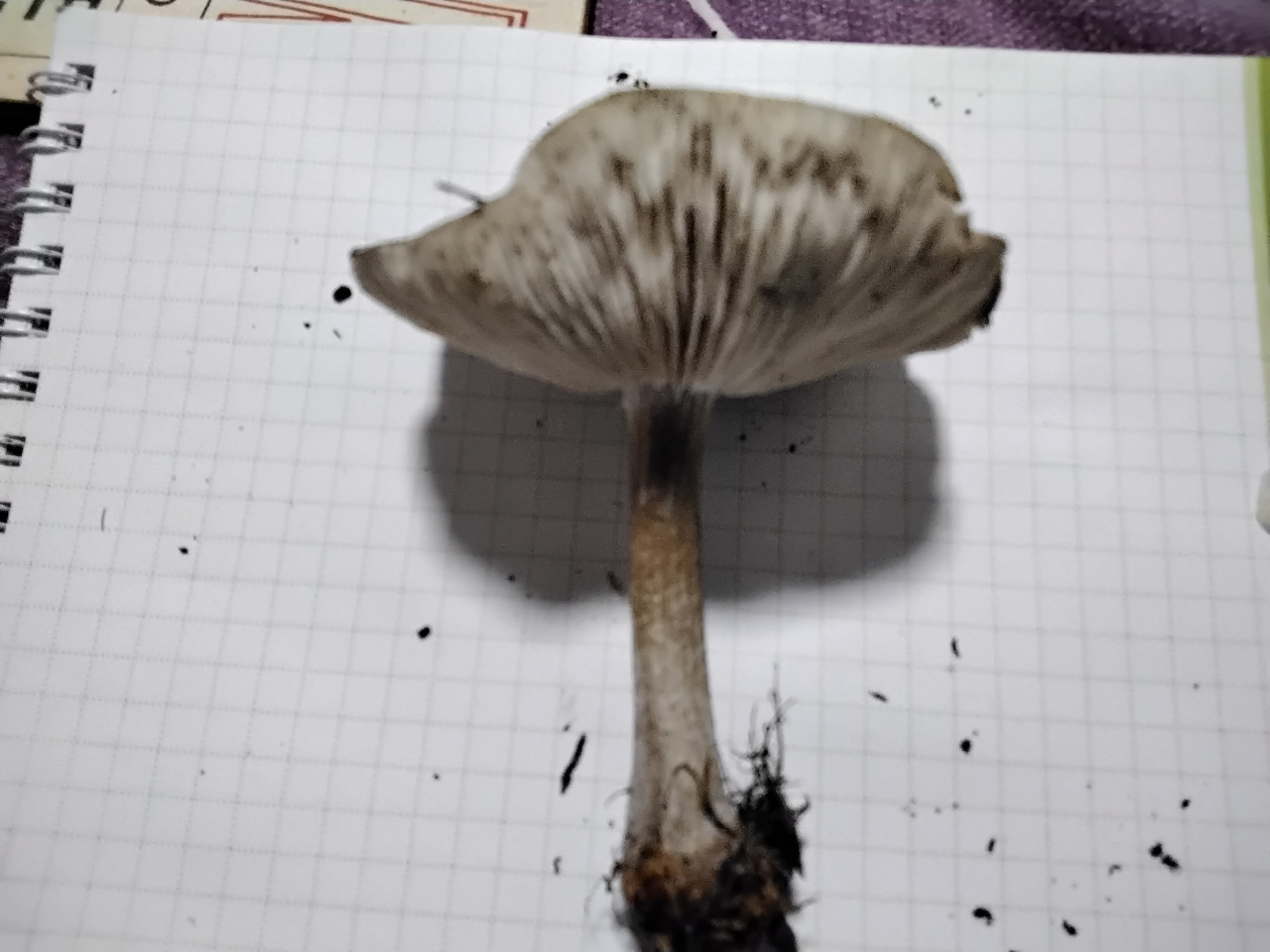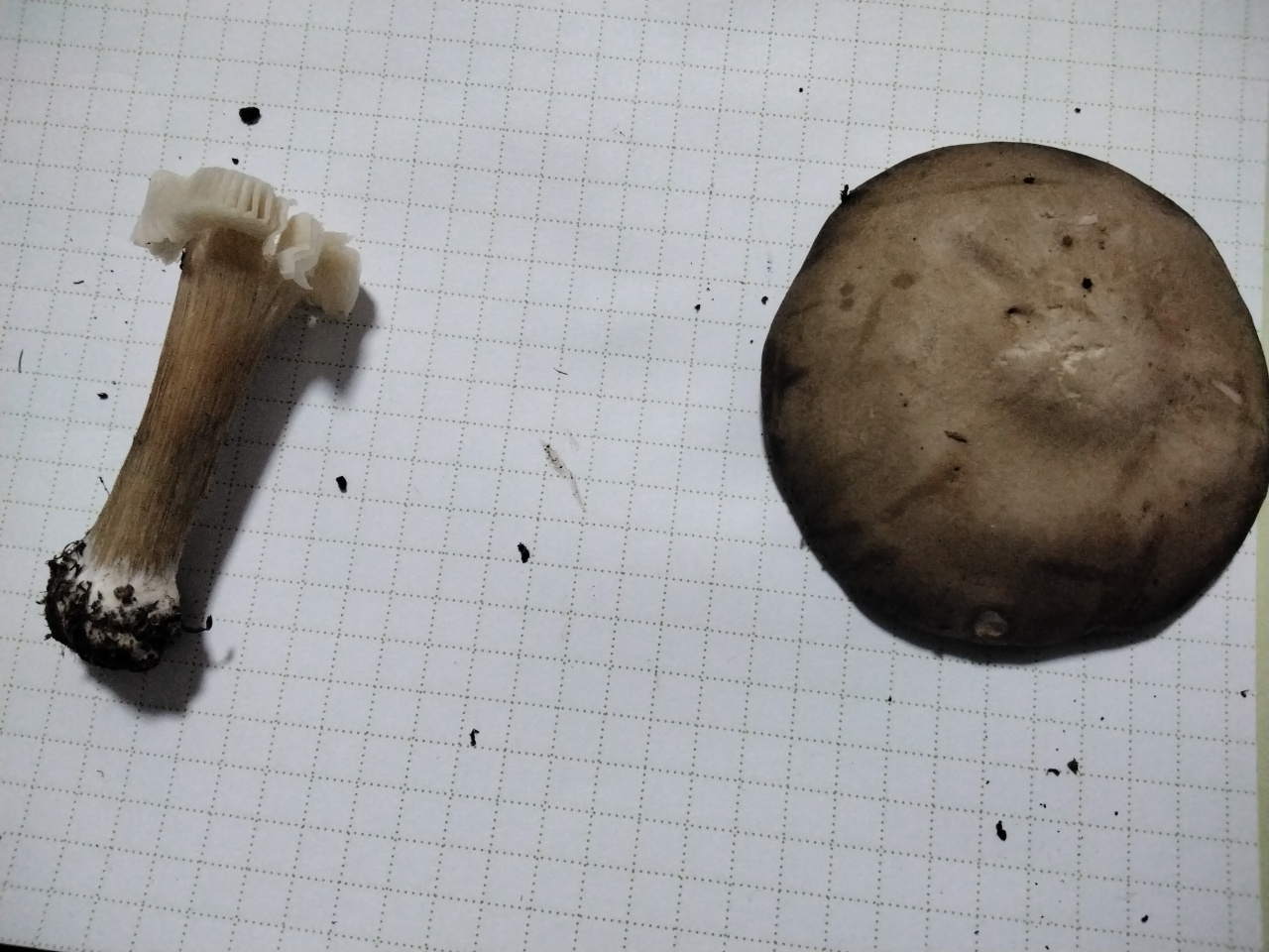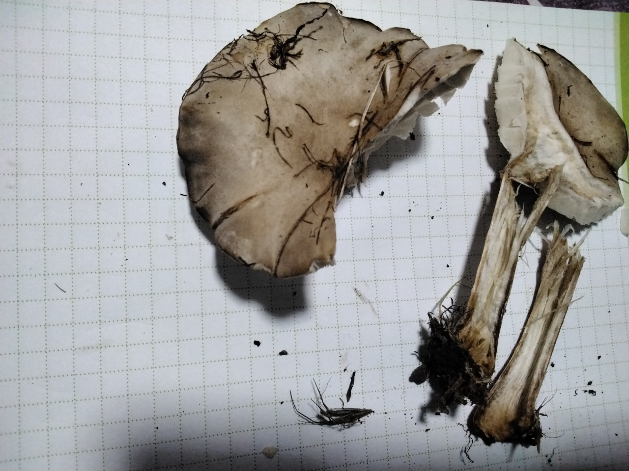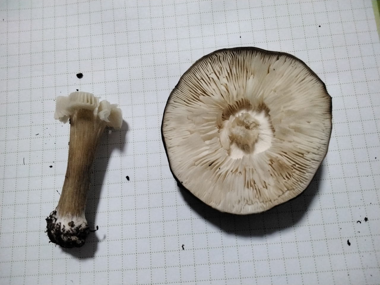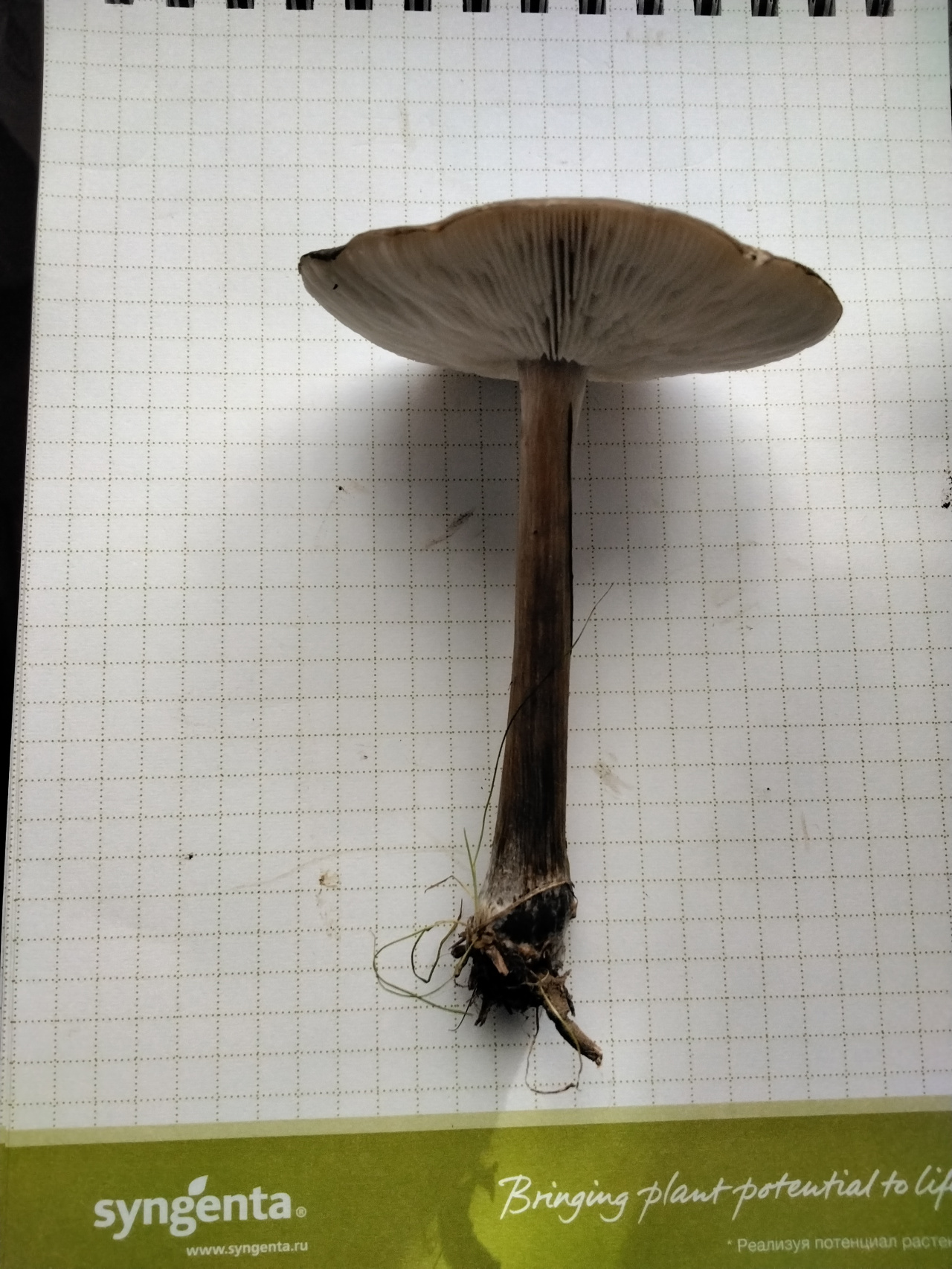 Описание гриба: найден на открытом пространстве среди травы. Такие растут на старой грунтовой дороге. Щляпка коричневая, светлеет в сухую погоду. Ножка крепкая, тонкая, высокая, в центре полая, внизу слегка опушённая белым налетом. Пластинки белые частые. Споровый порошок светлый. Запах приятный грибной. Встречаются и по 1 и небольшими рядами.