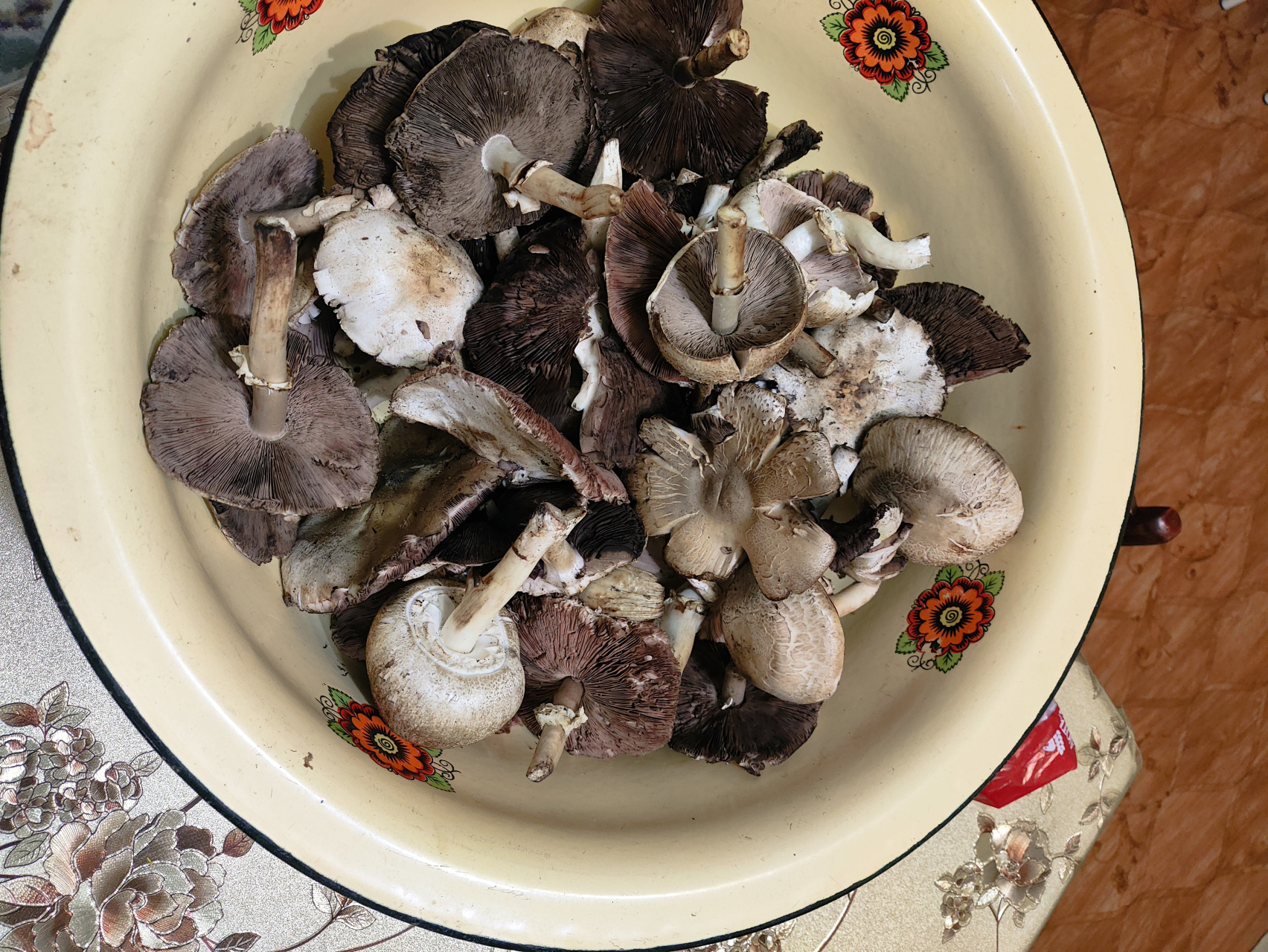 Что-то подобное собирал на газоне, рядом с рекой. Мелкие шампиньоны плюс похожие на них грибы с более светлым низом. Эти, со светло-серым низом шляпки, при отваривании желтеют и издают неприятный запах.