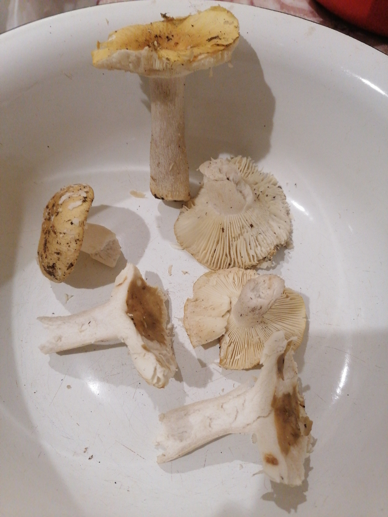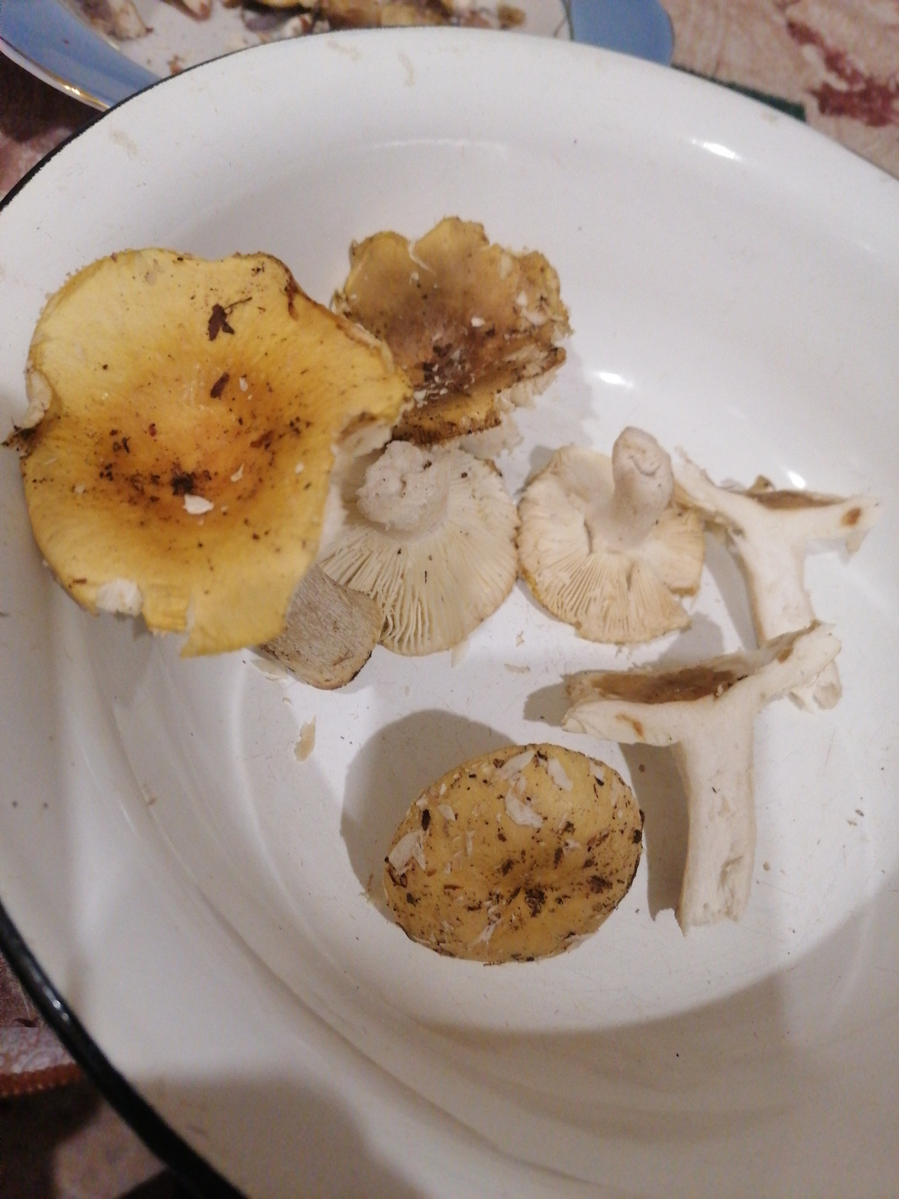 Описание гриба: Хрупкий гриб, имеет слегка грибной запах, смешаный лес, 01.11.2025. Пленка с шапочки снимается снимается неплохо, но хуже к центру. часто росли приподнимая шляпкой солидный слой земли и опавших листьев. Оттенки шляпки теплых тонов желто-телесного цвета, некоторые с легкой зеленоватостью. На вкус тейтральный, слегка пощипывает язык.