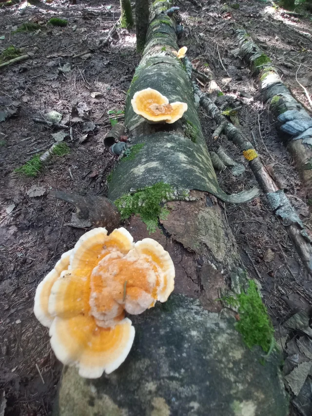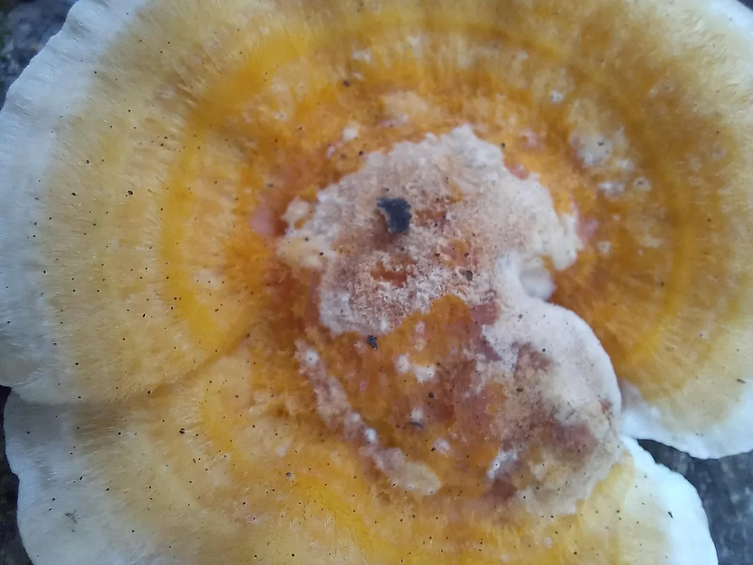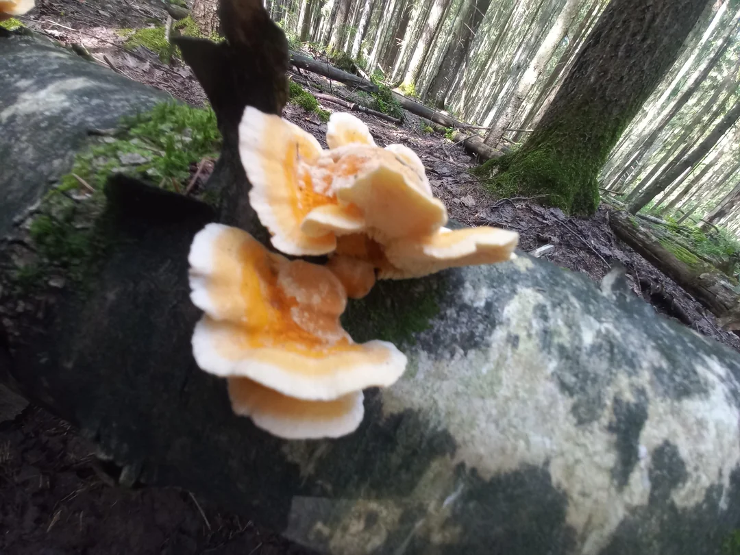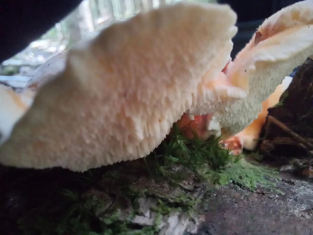 Описание гриба: нашел еще в июле 2025 в ЛО. смешанный лес (береза и сосна, гриб рос на березе). все еще ломаю голову, что эт такое, какой род хотя бы. спороносный слой шипиковый, белый. фото чуть размытые так как приходилось использовать широкопанорамную камеру на телефоне
