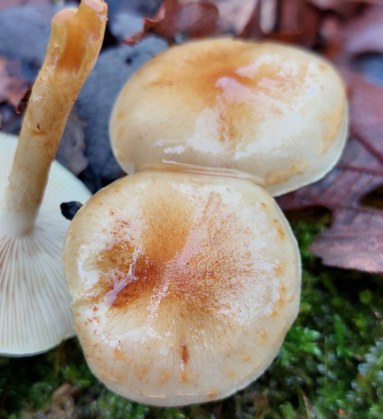 , не кругами, на почве рядом с поваленными деревьями в смешанном лесу. Шляпки грибов имеют сверху желейную (гелевую, слизистую) плёнку. Подозреваю, что это чешуйчатка клейкая. Что скажете?