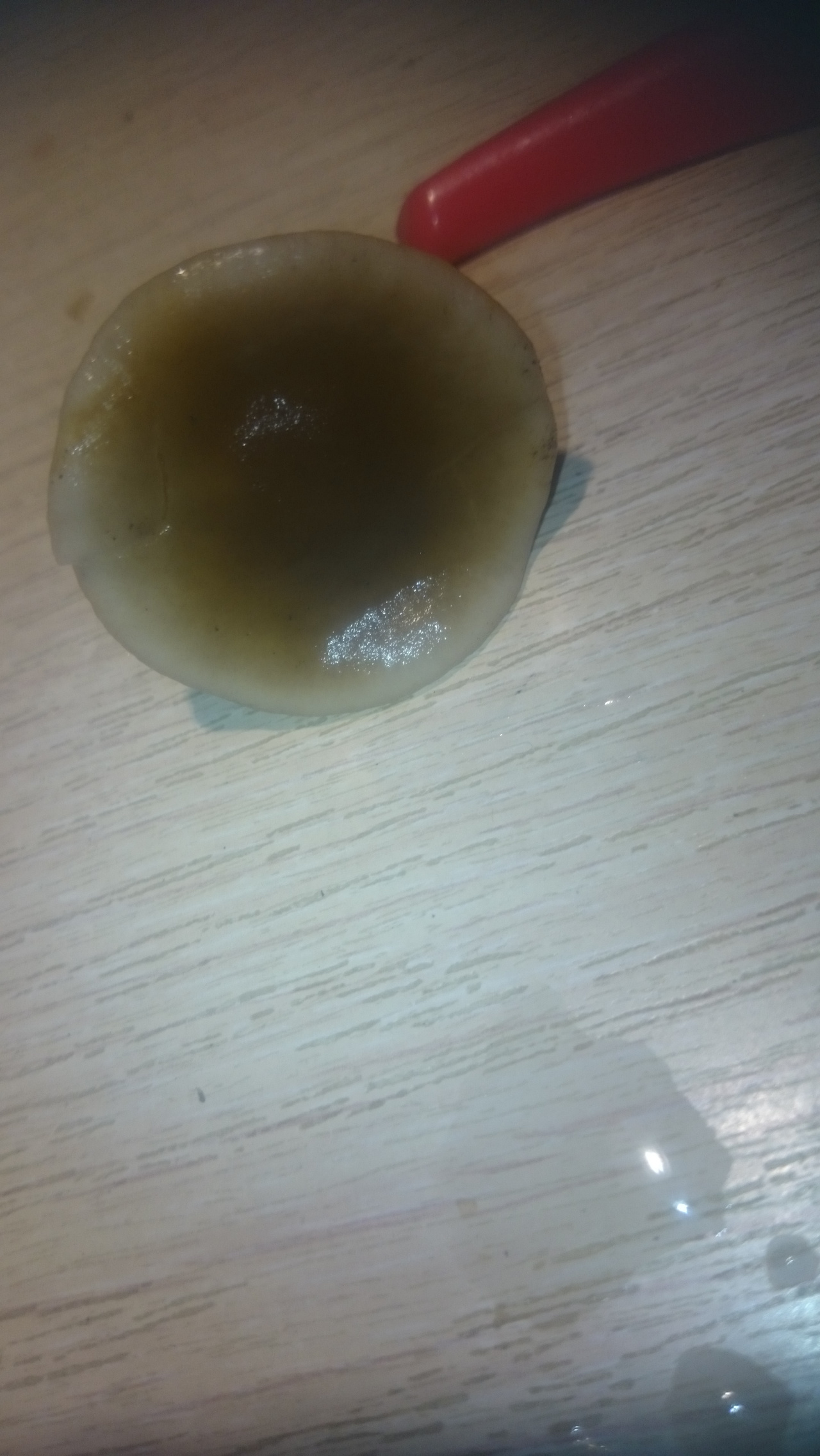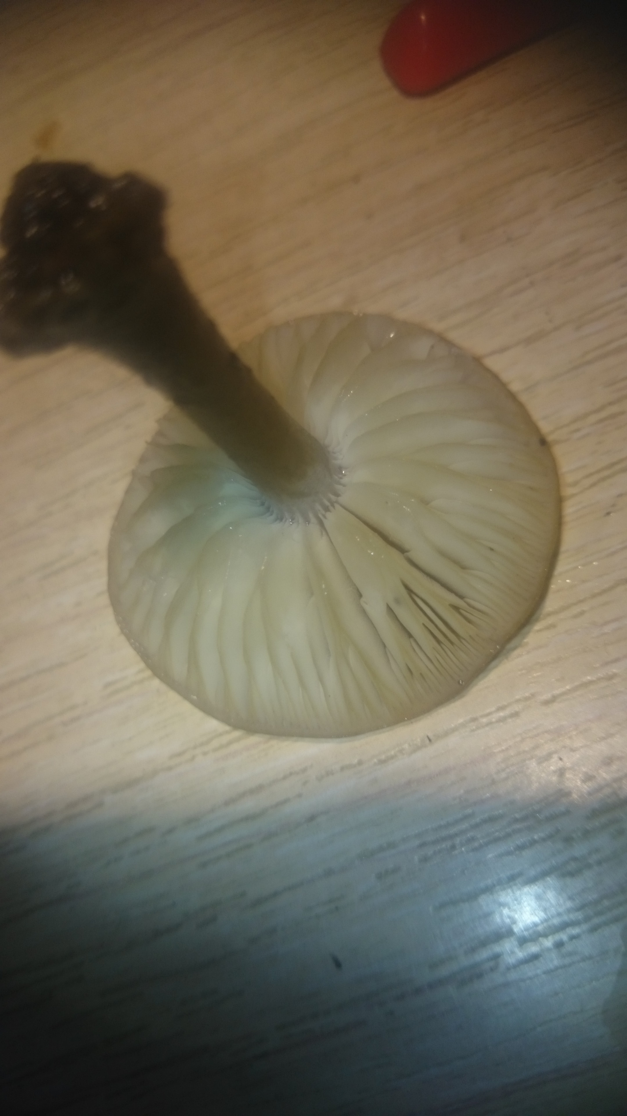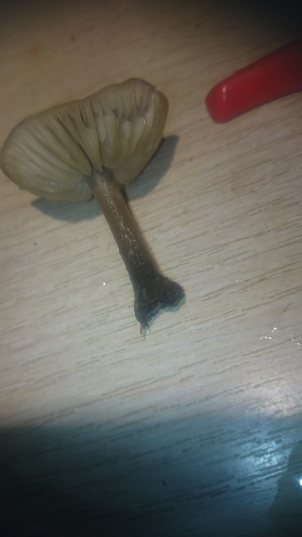 Описание гриба: Сегодня. 4.11.25г. В траве в огороде. Фото в доме при искусственном свете, т.к. уже темнело. Диаметр шляпки -4см, ножка высота -4см, диаметр — 0,5см. Запах грибной. Ночью были заморозки до -3. Похож на коллибию масляную (денежка).