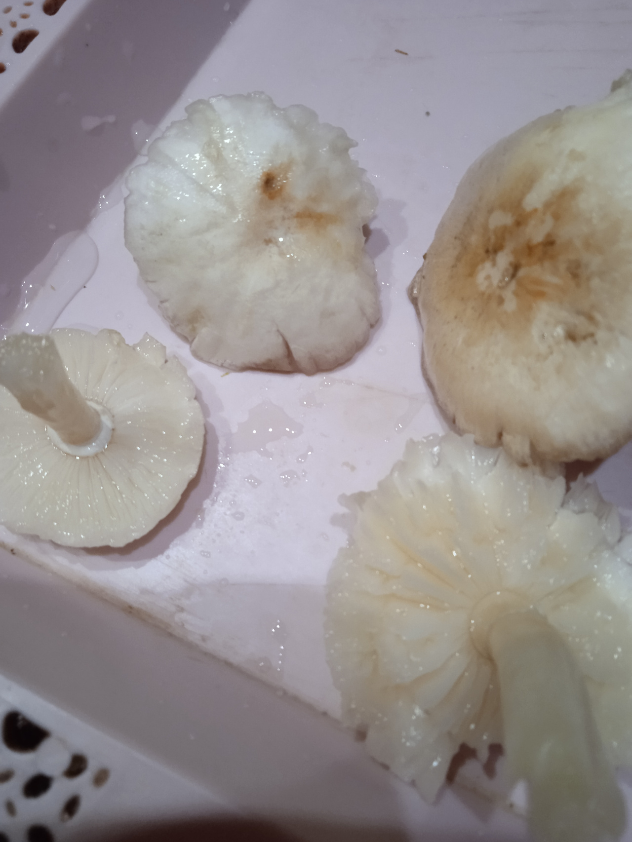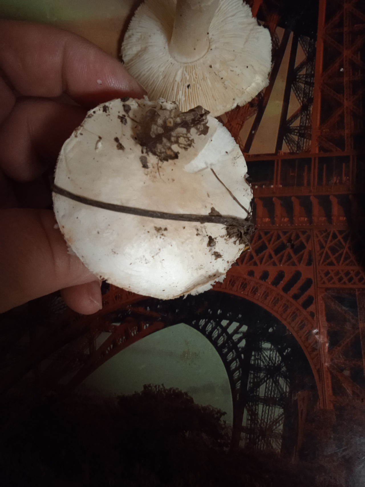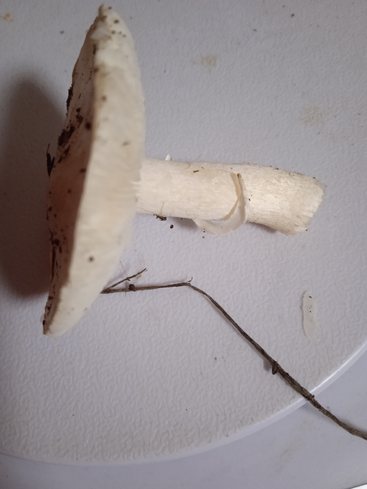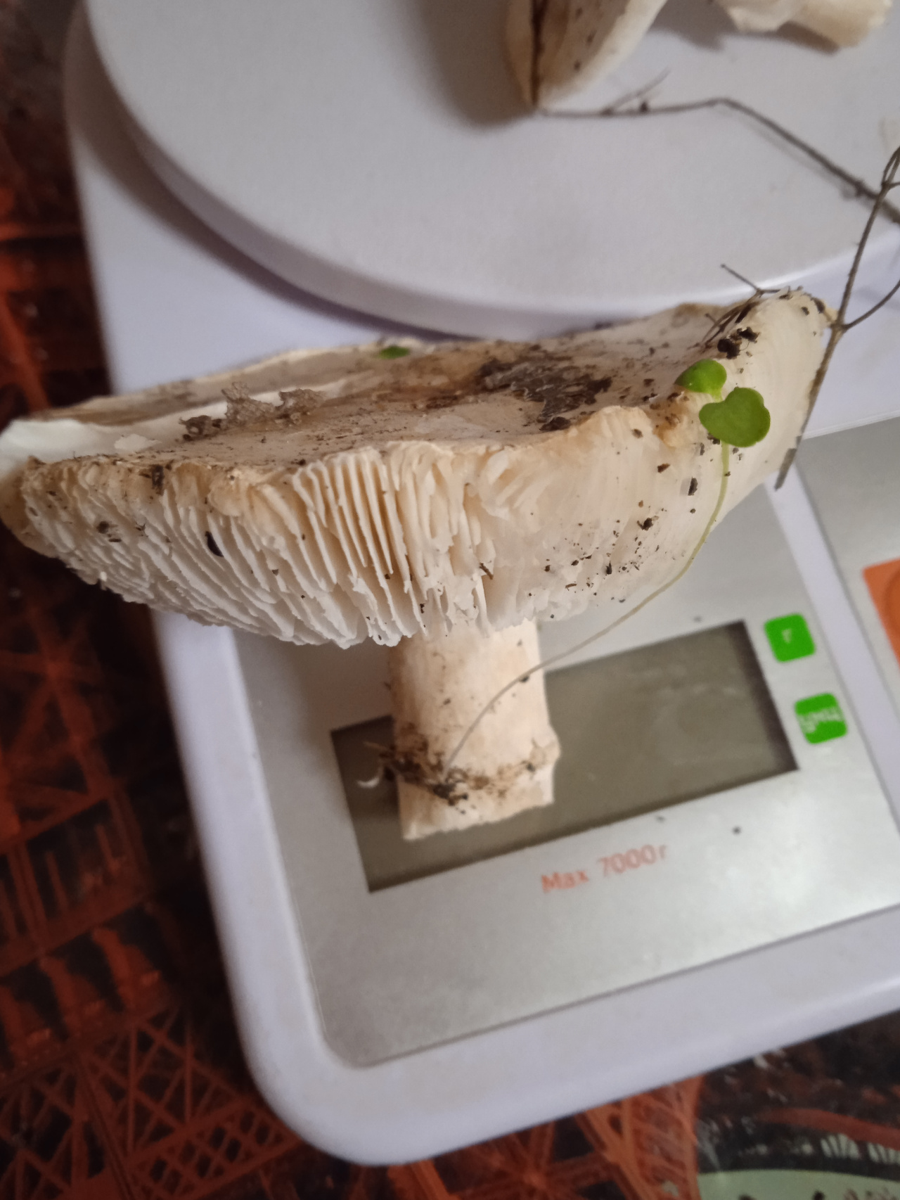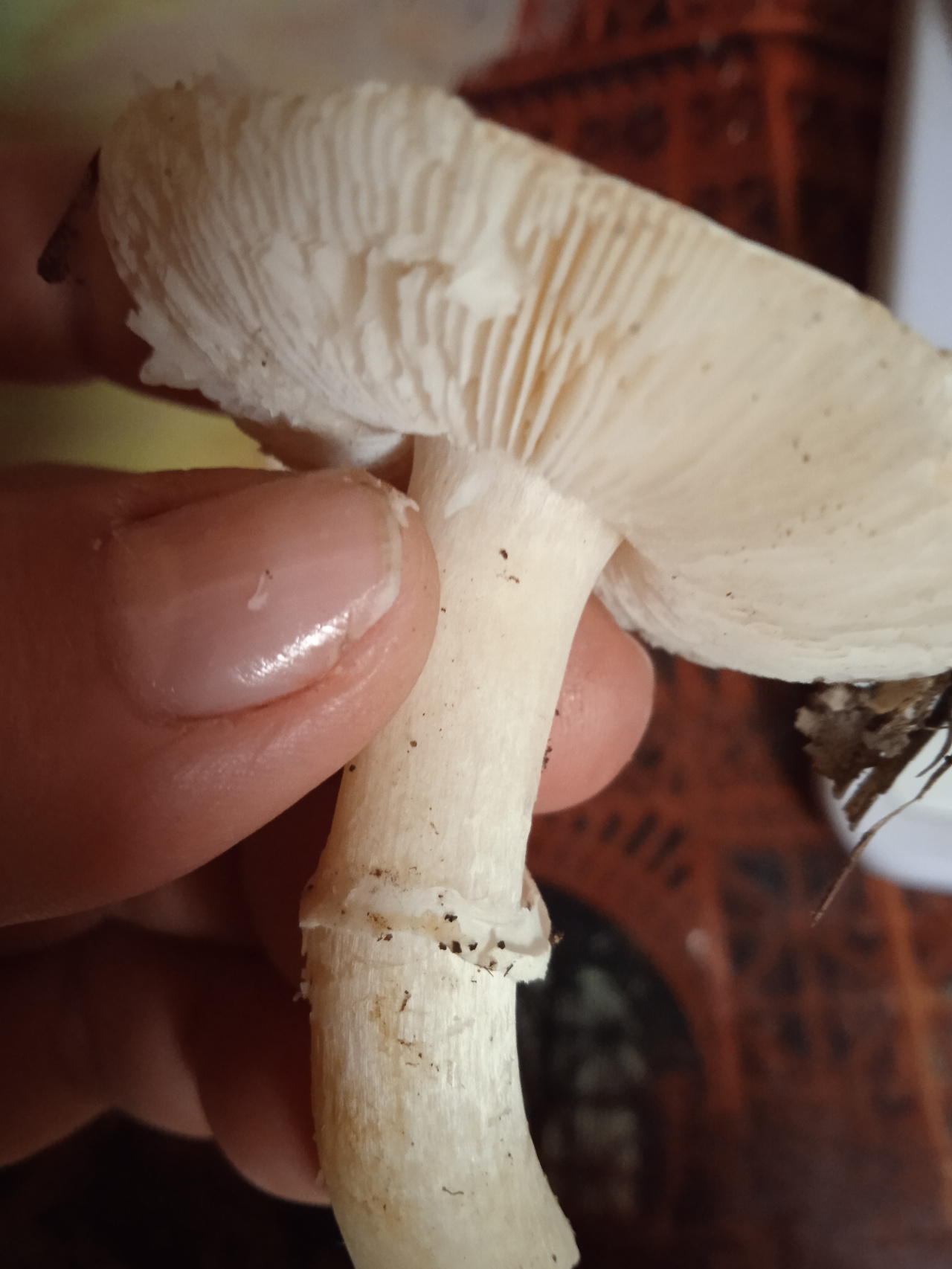 Описание гриба: Цвет белый,цвет не меняет, на ножке есть юбка, похож на рядовка, без запаха. Луг около деревьев Вяз