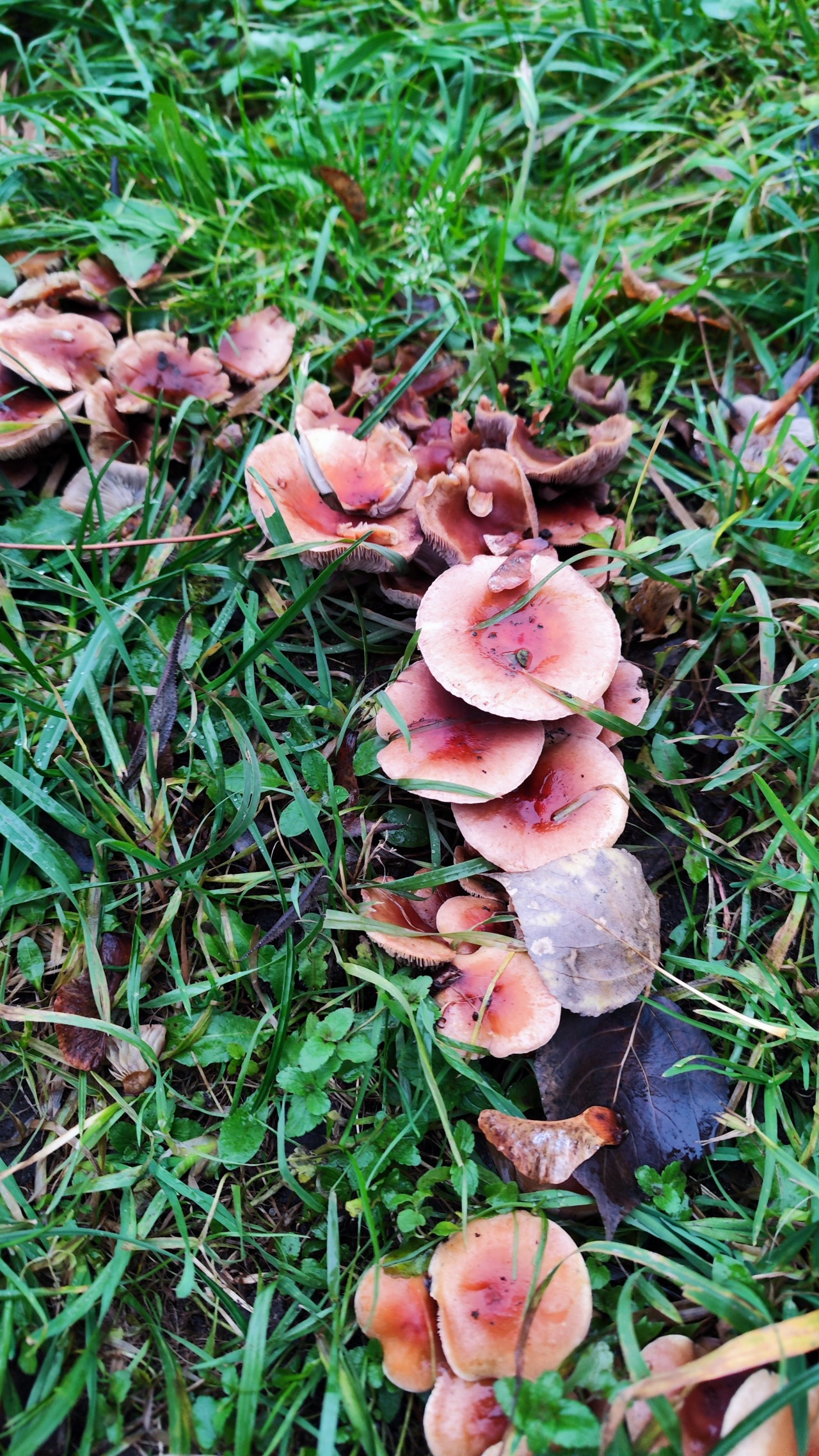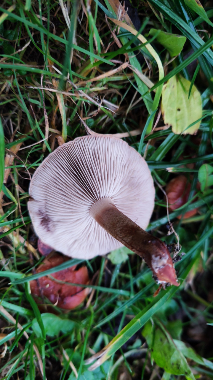 Описание гриба: В парке на газоне недалеко от лиственных деревьев. Грибы росли плотной группой в форме дуги окружности. Шляпки плоские, без углубления, характерной двуцветной окраски. У старых грибов края шляпок заворачиваются наверх; Ножка плотная, тёмная, волокнистая. Пластинки отличаются от верха шляпки по цвету: они практически серые. Сначала подумал, что это говорушка рыже-бурая, но пластинки примыкают к ножке под прямым углом, а шляпки не приобретают форму воронки.