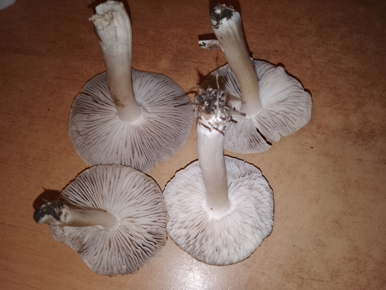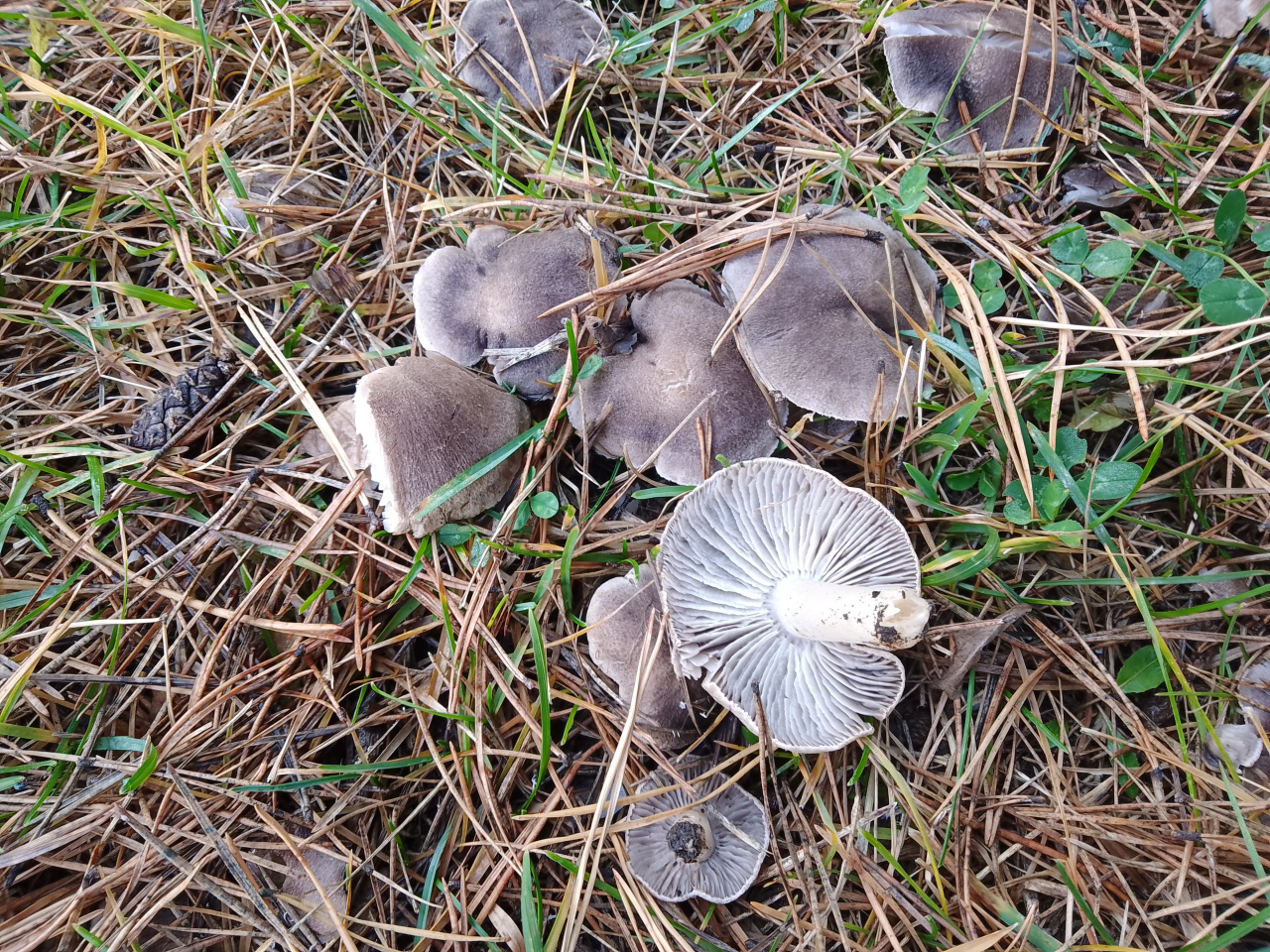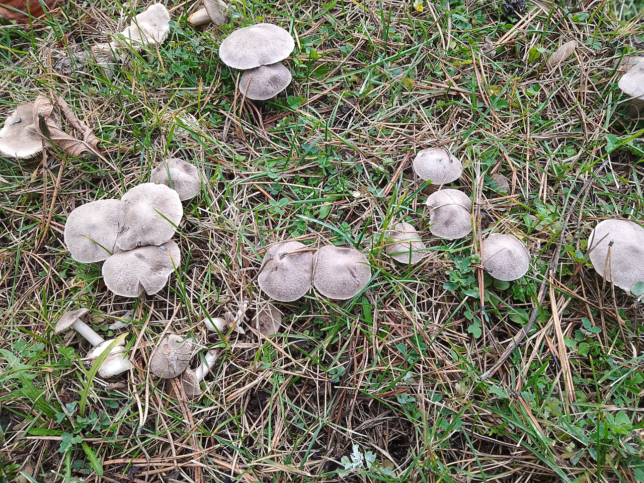 Описание гриба: Растет в сосновом лесу, в большом количестве, в октябре-начале ноября. Шляпка — не гладкая, а шероховатая, мышино-серого цвета, изредка с небольшим коричневым оттенком, никаких чешуек и полосок нет. То есть, не штриховатая. Иногда — с небольшим бугорком по центру. Ножка — достаточно плотная, белого цвета. Пластинки — редкие, белые или сероватые. Запах — слабый грибной (не мыльный). Похоже, что рядовка землистая или серая (я просто никогда не собирал, поэтому сомневаюсь). Как вариант — рядовка Гульден. Сначала подумал, что мыльная, но ни по запаху, ни по цвету не похожи, при разломе цвет не меняет (не розовеет, не краснеет). И пластинки не прирастают к шляпке, а немного не доходят до ножки.
