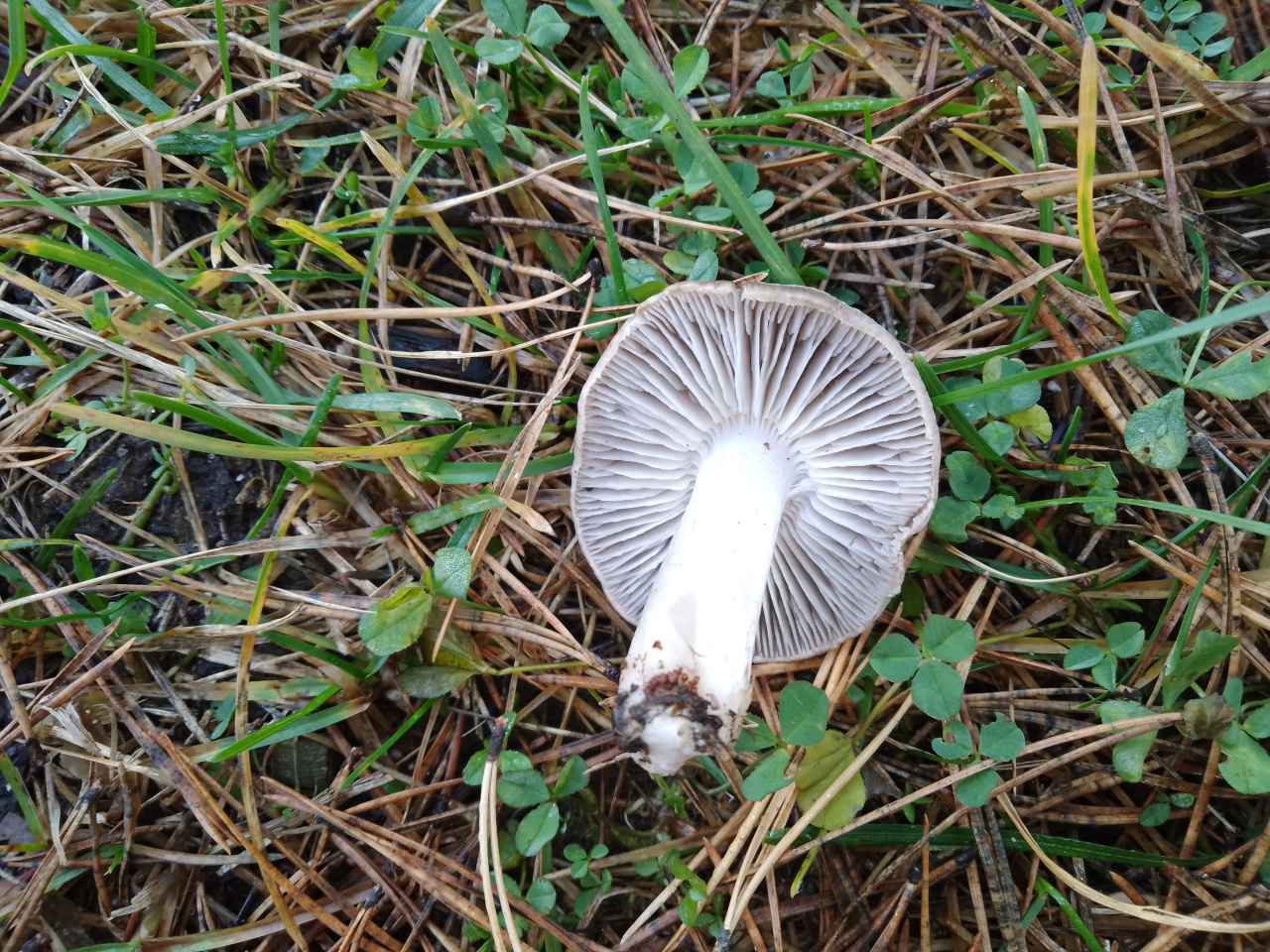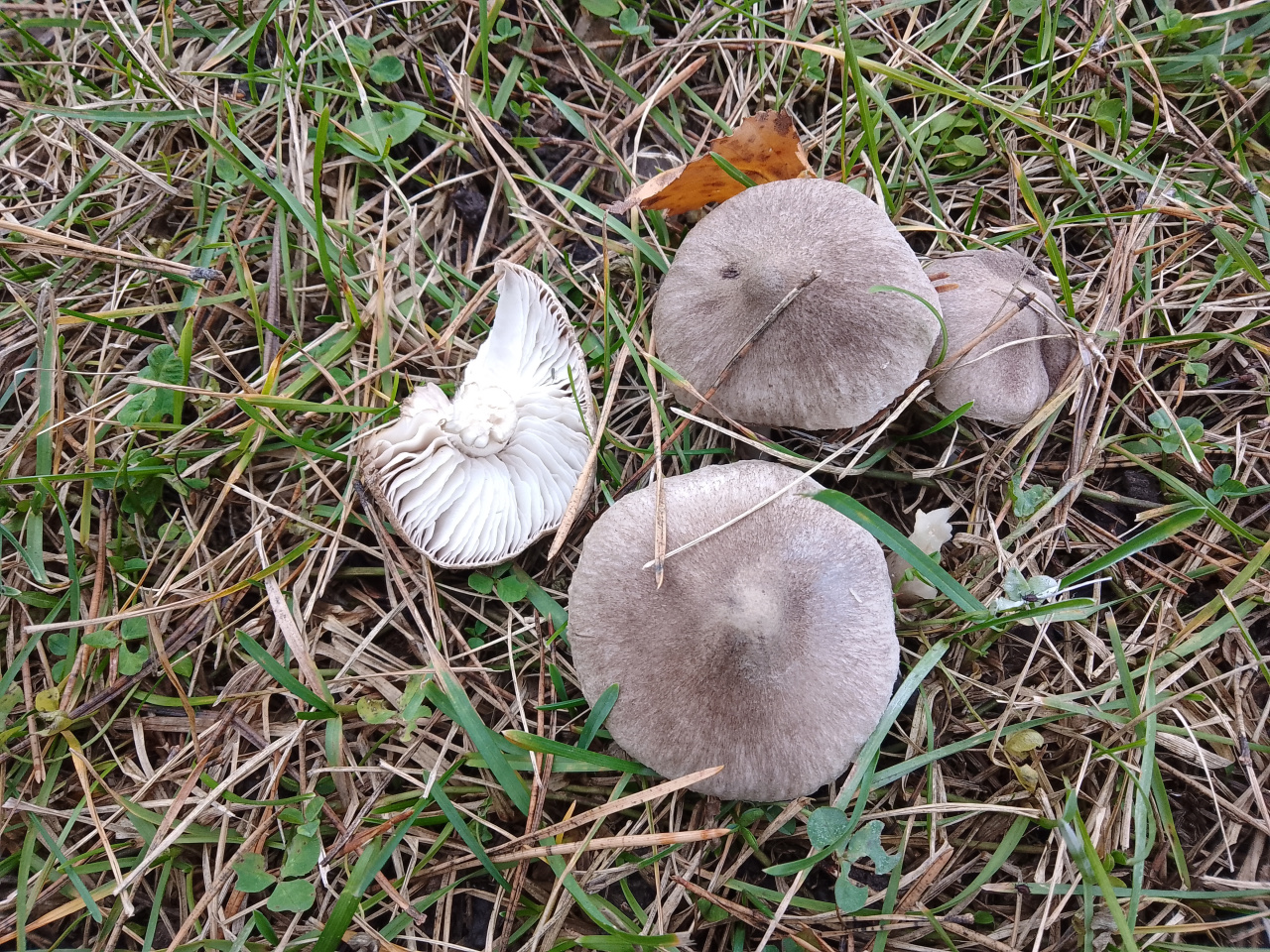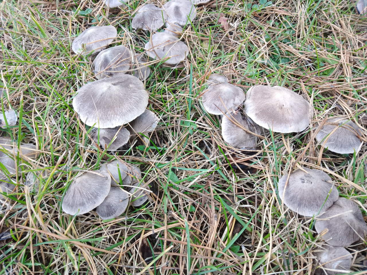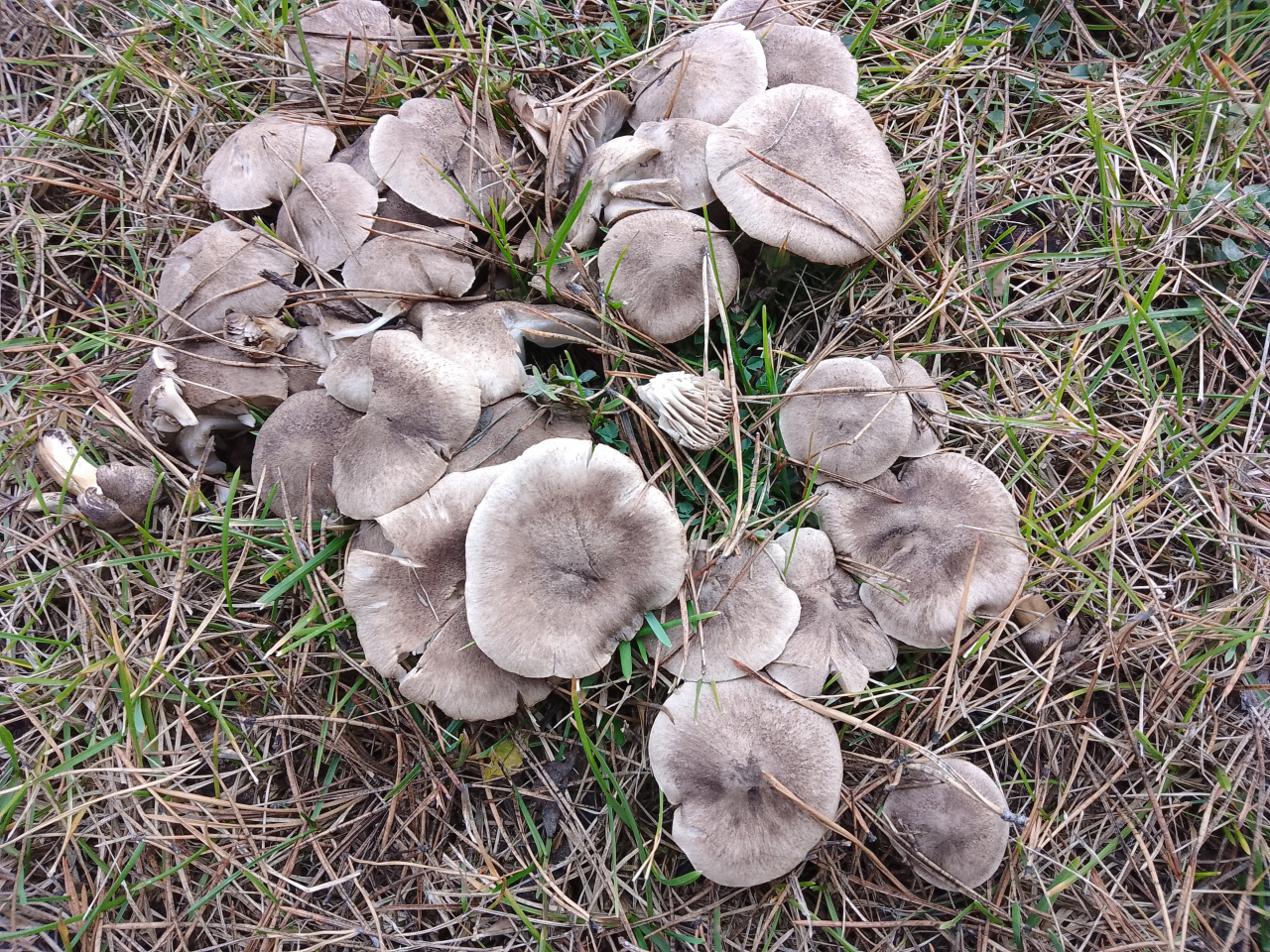 Описание гриба: Растет в сосновом лесу, в большом количестве, в октябре-начале ноября. Шляпка — не гладкая, а шероховатая, мышино-серого цвета, изредка с небольшим коричневым оттенком, никаких чешуек и полосок нет. То есть, не штриховатая. Иногда — с небольшим бугорком по центру. Ножка — достаточно плотная, белого цвета. Пластинки — редкие, белые или сероватые. Запах — слабый грибной (не мыльный). Похоже, что рядовка землистая или серая (я просто никогда не собирал, поэтому сомневаюсь). Как вариант — рядовка Гульден. Сначала подумал, что мыльная, но ни по запаху, ни по цвету не похожи, при разломе цвет не меняет (не розовеет, не краснеет). И пластинки не прирастают к шляпке, а немного не доходят до ножки.