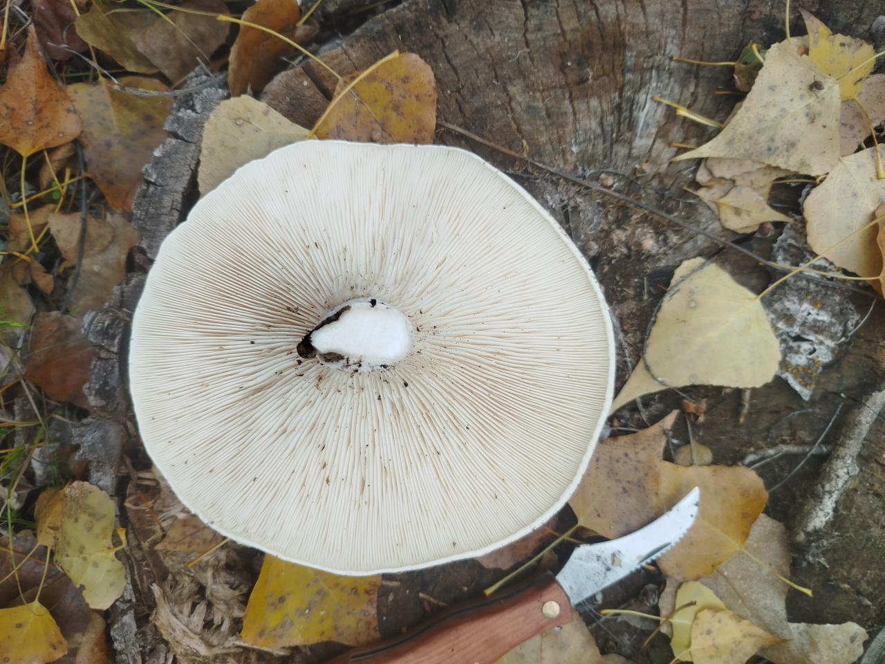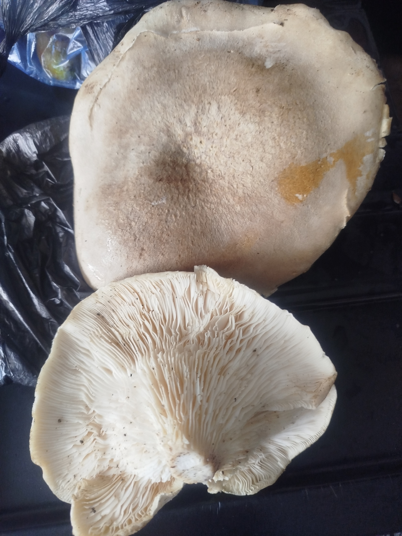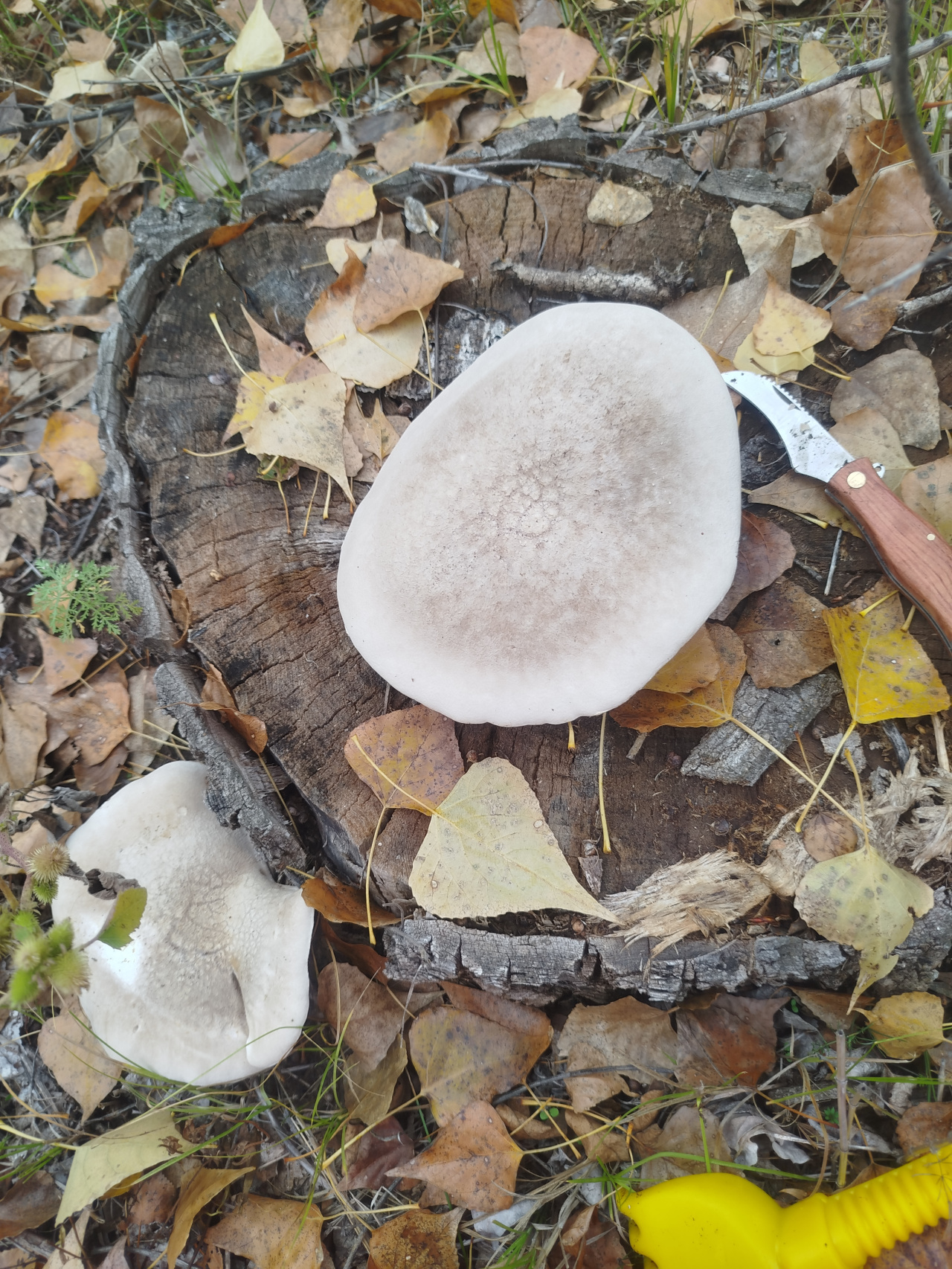 Описание гриба: Помогите,пожалуйста определить гриб. белый, плотный. Пластинки нисходящие к ножке. Ножка практически отсутствует. Рос горизонтально на пне. Лес лиственный, Запах сливочный, грибной. На разрезе плотный. Мякоть цвет не меняла.