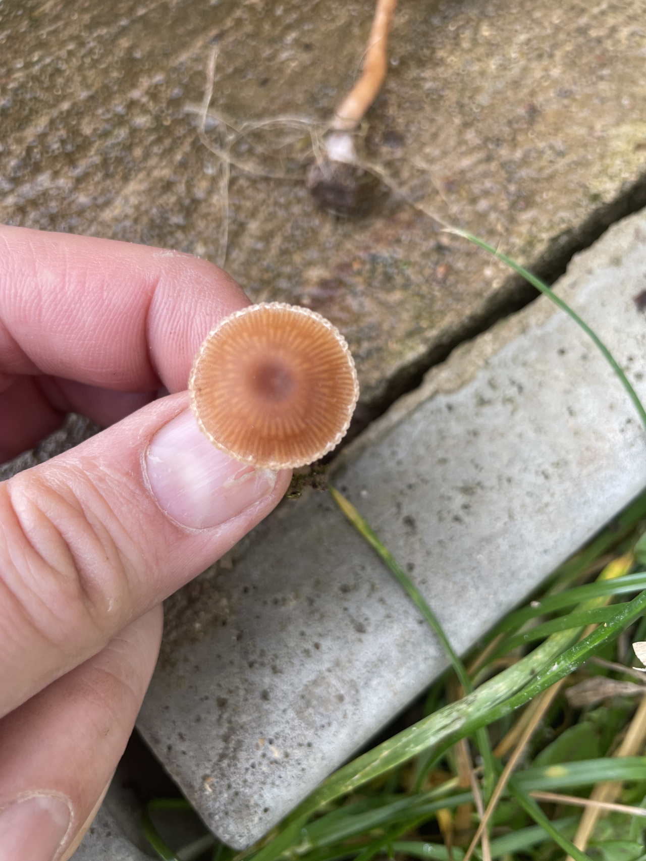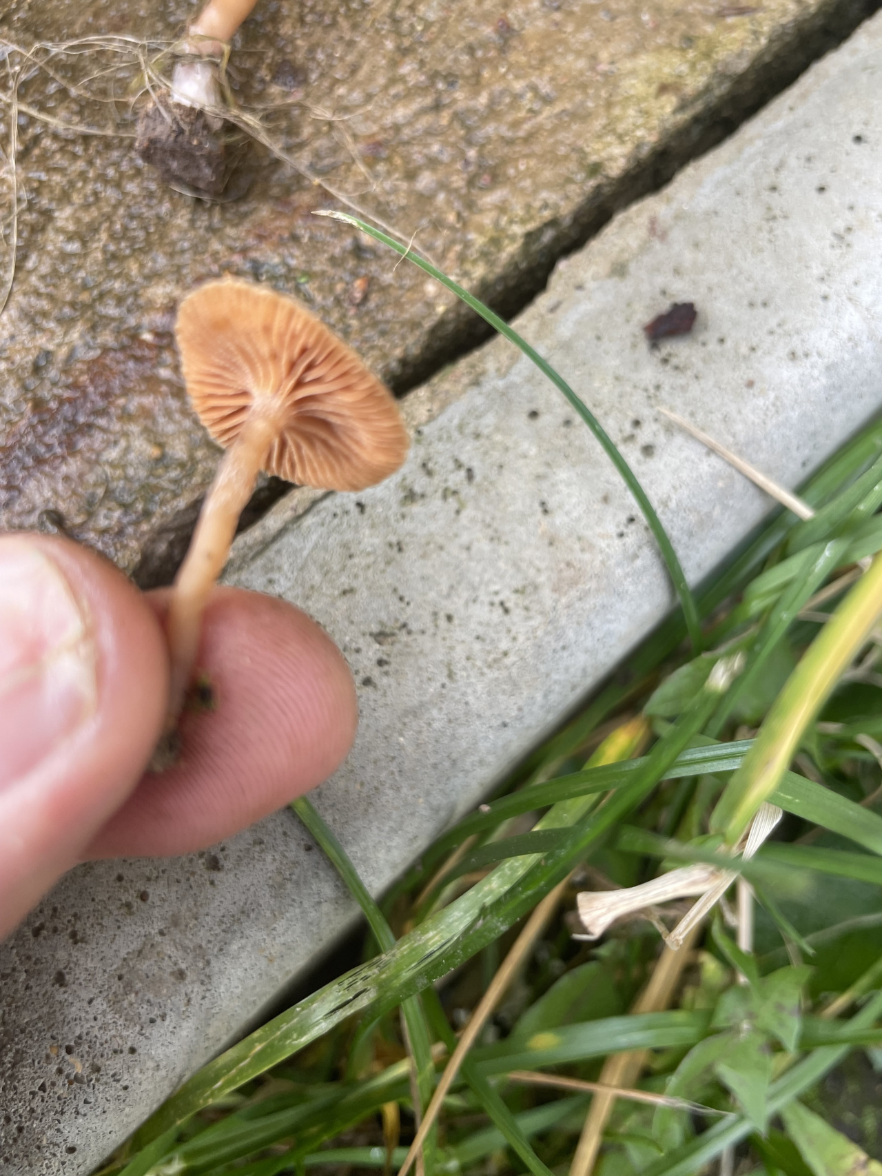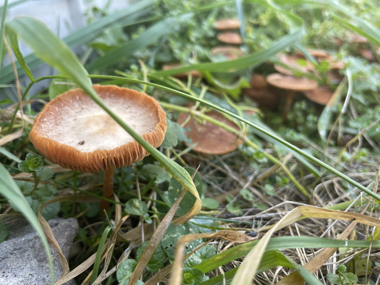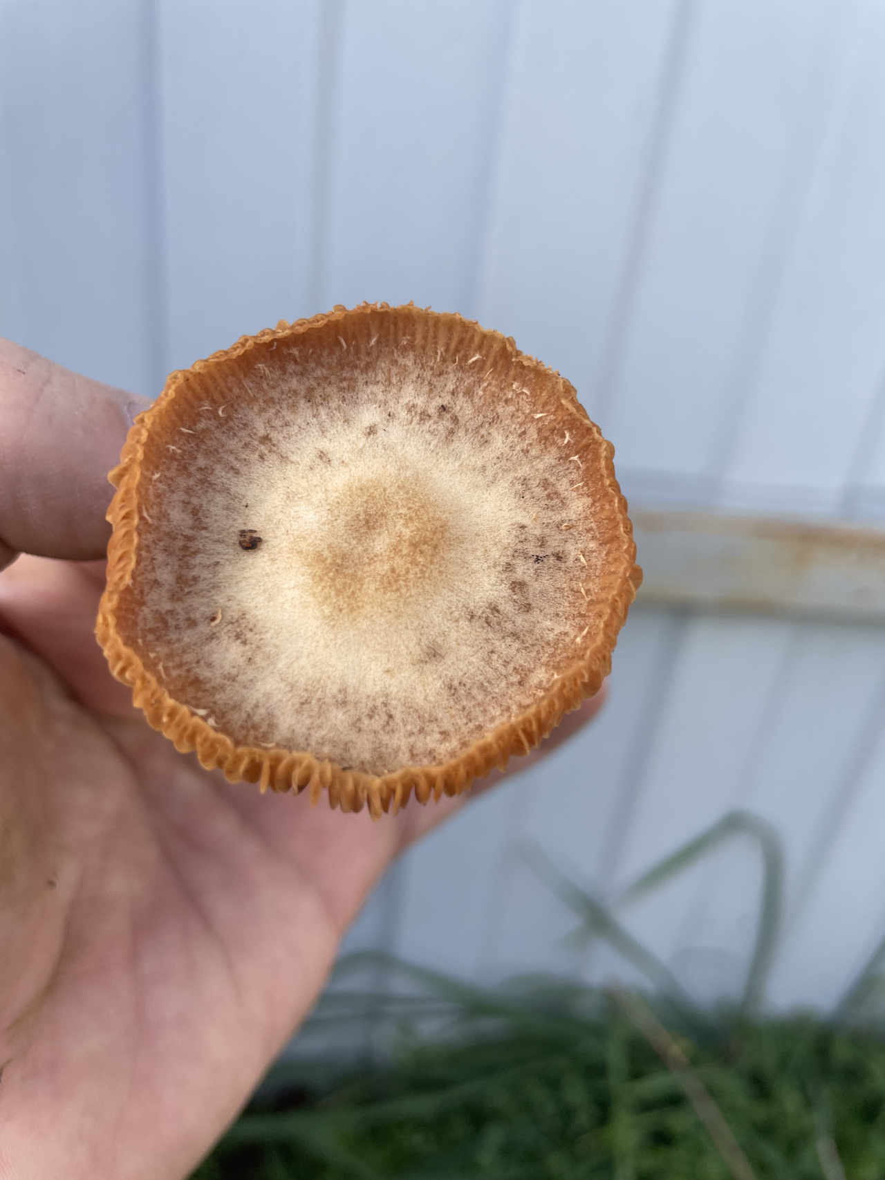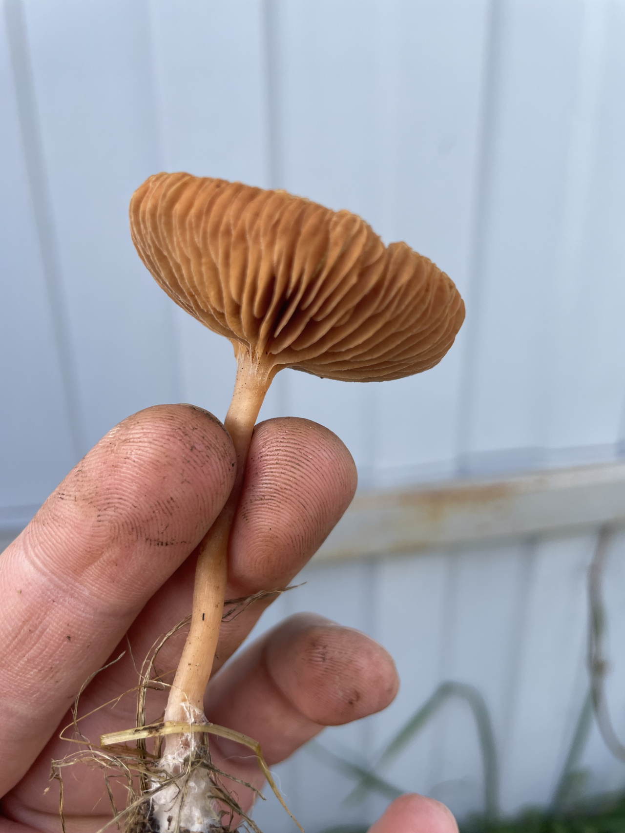 Описание гриба: Гриб растет под маленьким дубом привезенным из леса. Растет большой семейкой. Цвет светло-коричневый либо грязно оранжевый. Пластинчатый, пластинки довольно крупные, сросшиеся у ножки. Пластинки просвечиваются сквозь шляпку. На шляпке небольшой бугорок с углублением по её центру. Приятный грибной запах. У взрослого гриба шляпка раскрылась и края завернулись вверх. У молодых грибов по всей ее окружности имеется белая прерывистая полоска. Ножка у взрослого гриба длинная, около 7 см, у корня в беловатой паутине.