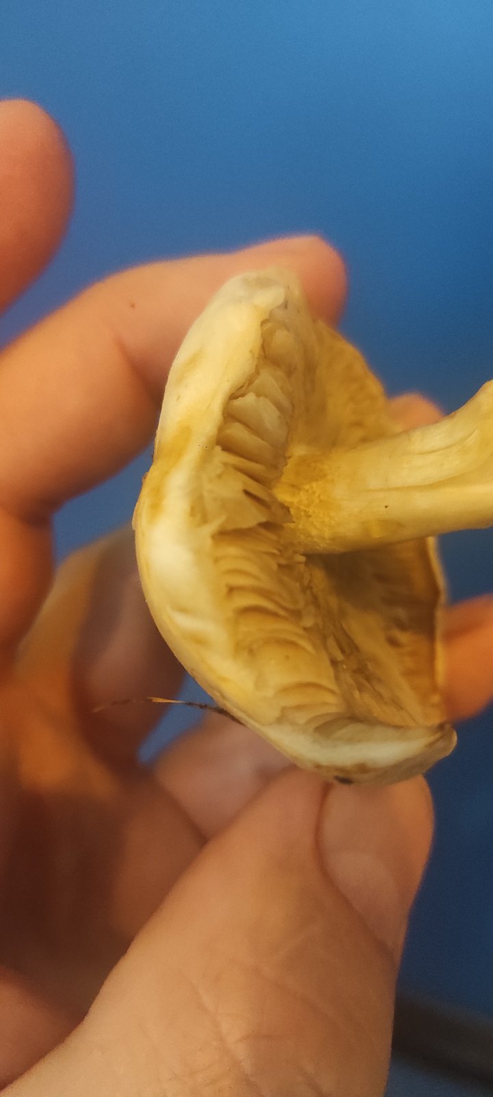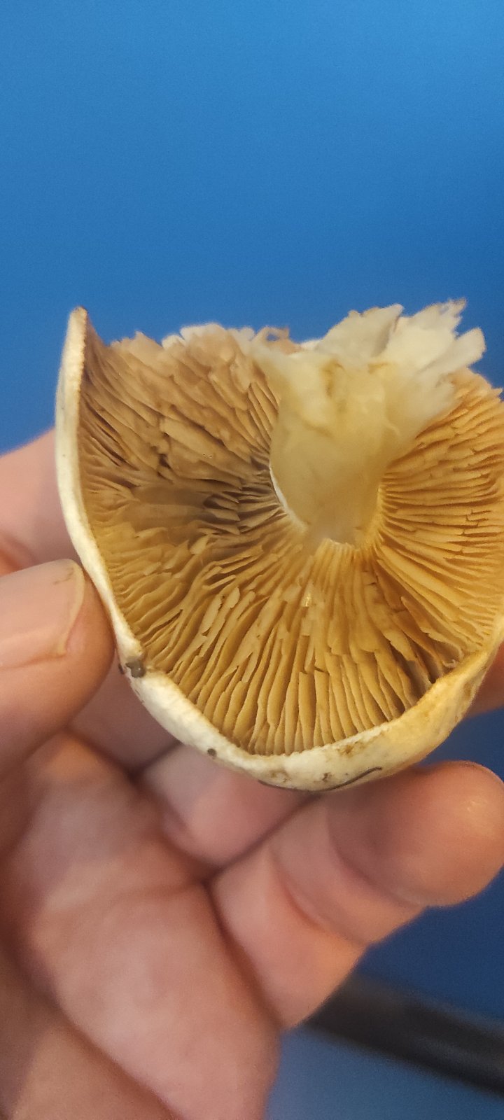 Описание гриба: Грибы выросли под соснами во дворе. Шляпка немного не круглая 4-6 см, цвет бежевый. Споры пластинчатые бежевого цвета. Запах приятный, но очень слабый. Ножка рыхлая, шляпка плотнее. Легко ломается. На изломе цвет не меняет, сок не выделяет. На фото цвет получился желтым, на самом деле бежевый