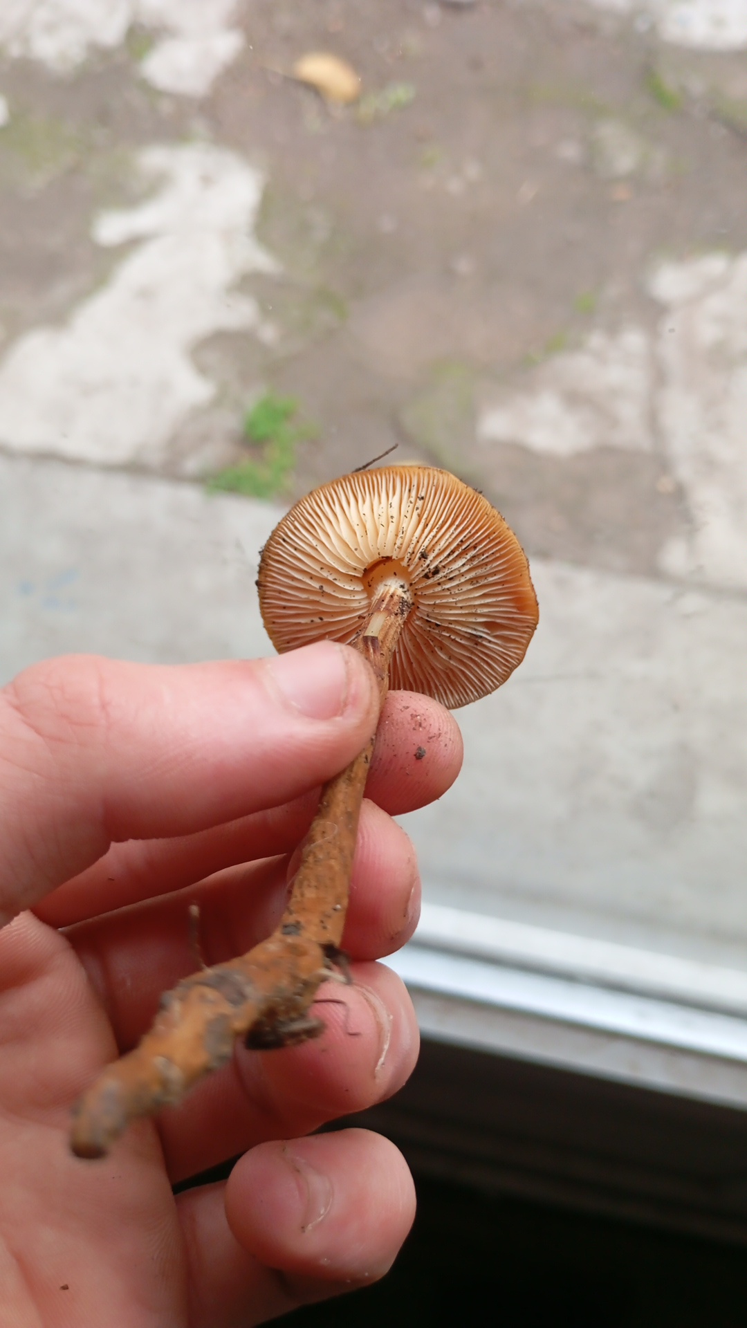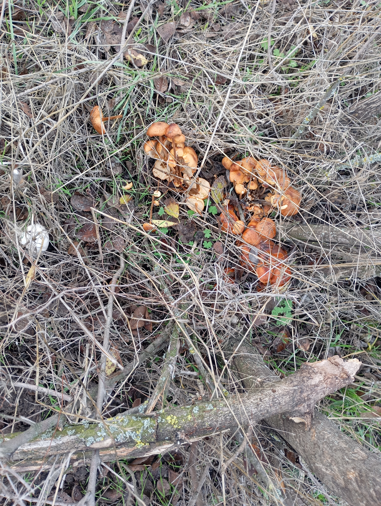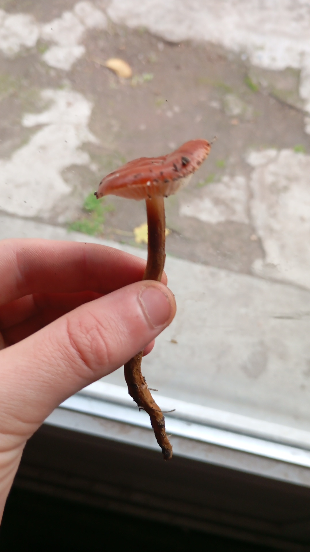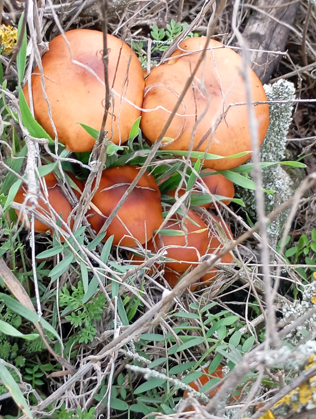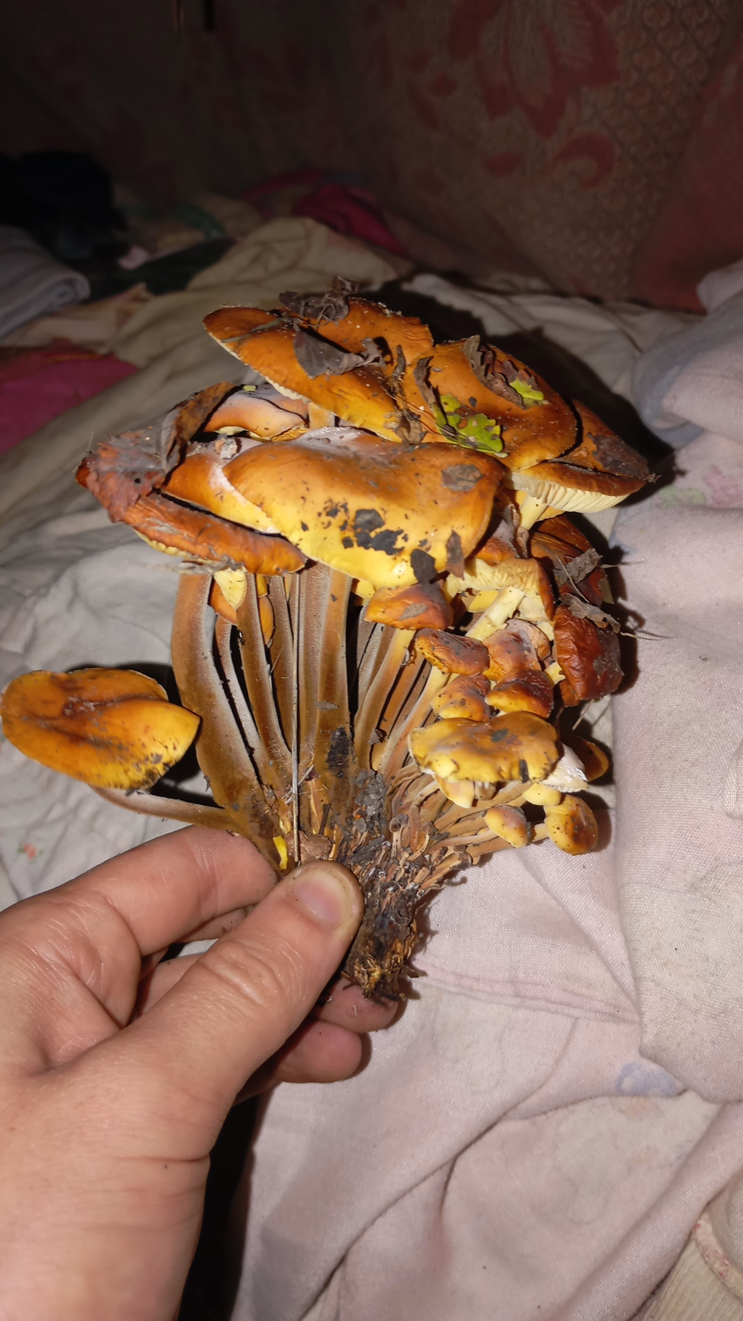 Описание гриба: Гриб с липкой и слизистой шляпкой растущий на пнях в коре деревьев на уровне земли и под деревьями в листве ножка темно коричневая растут группами