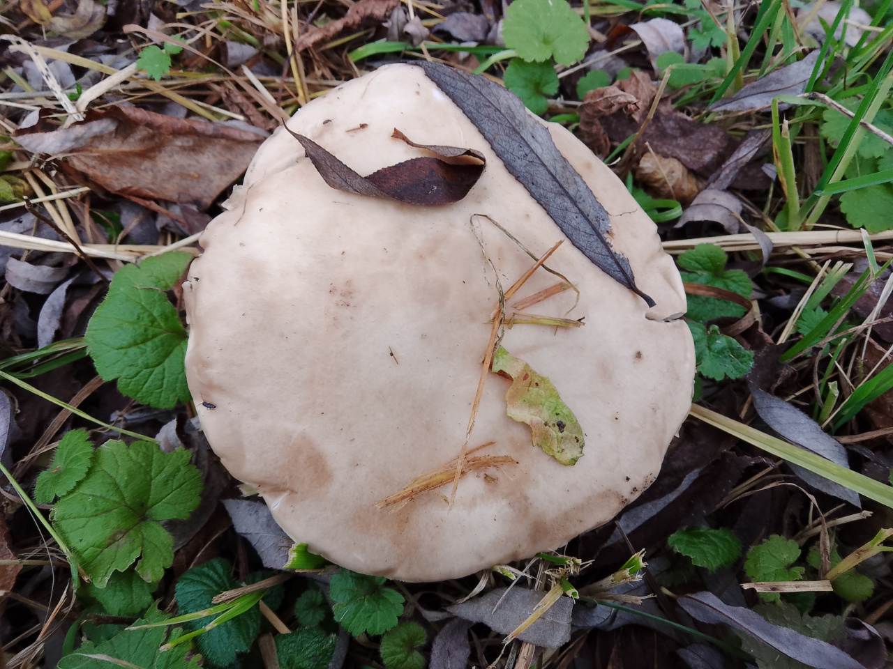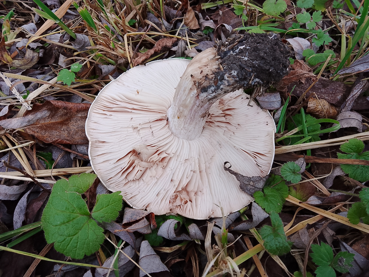 Шляпка — крупная, белого цвета, с лёгким бежево-розоватым оттенком, ножка — белая, плотная. Запах ярко-выраженный грибной.