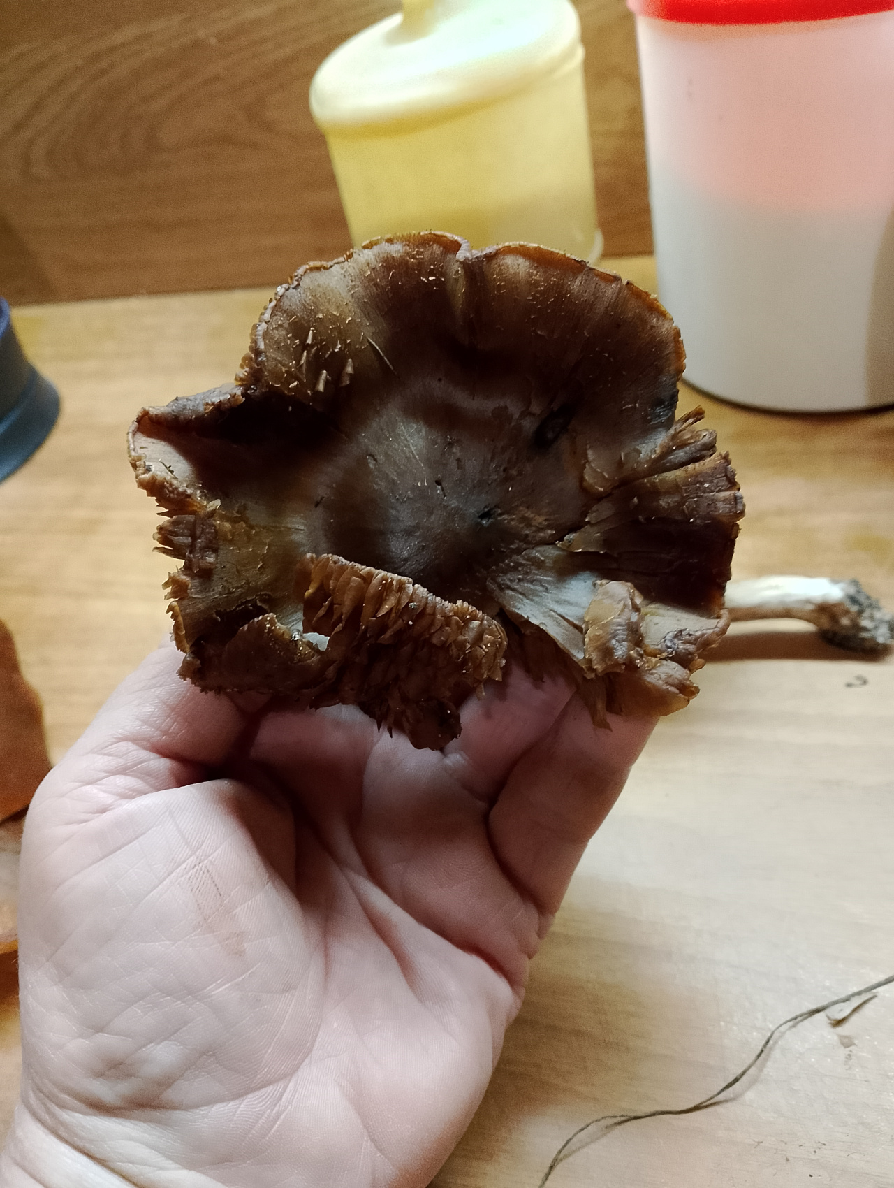Описание гриба: Ножка толстая,мясистый, тёмно-коричневый,лес смешанный, запах приятный грибной,цвет не меняется