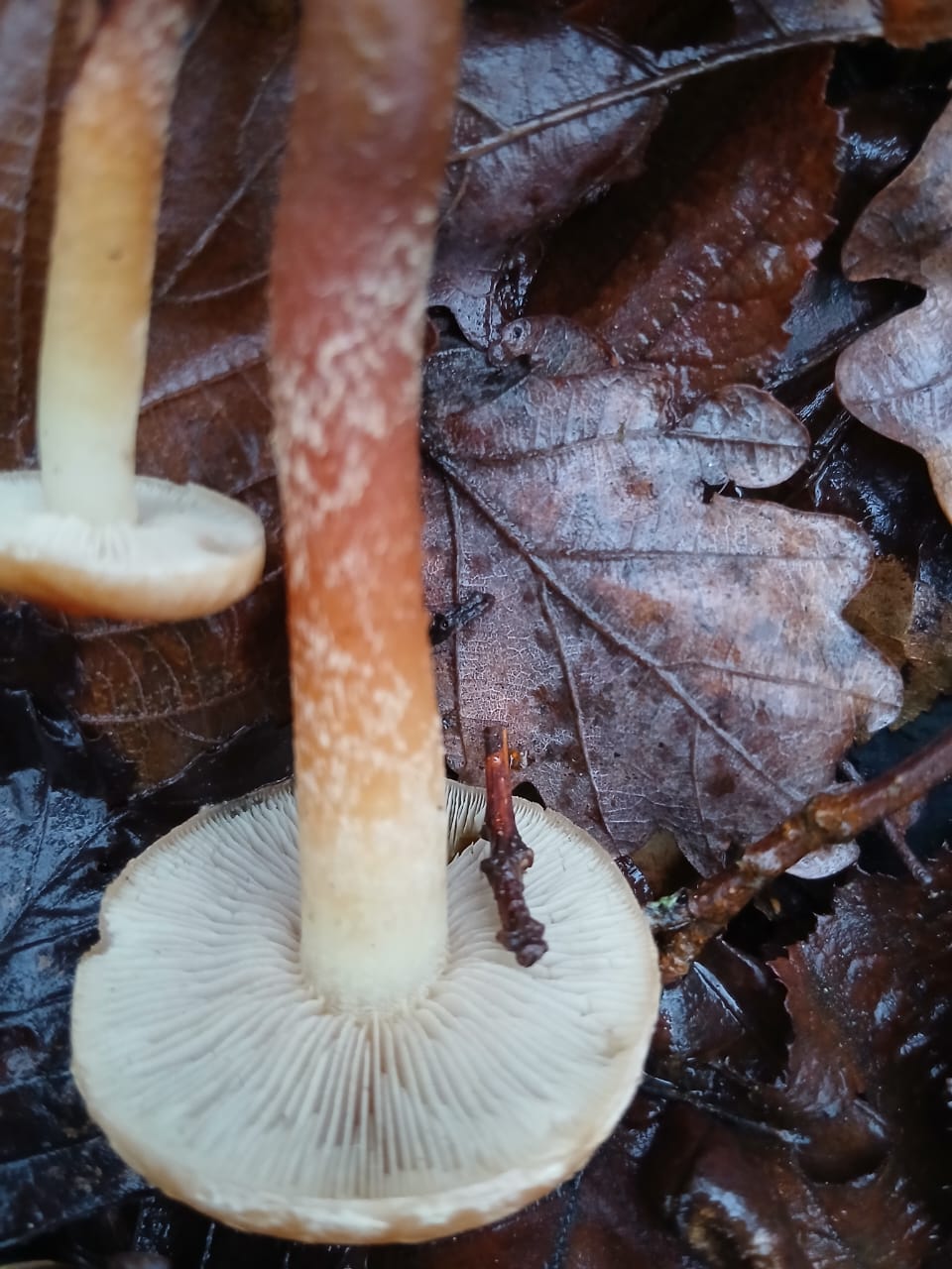 Грибы растут на земле, большими группами, прямо-таки колониями. Пластинки с сероватым оттенком. Кольца на ножке не заметила. Ножка с беловатым налетом. Запах не почувствовала.