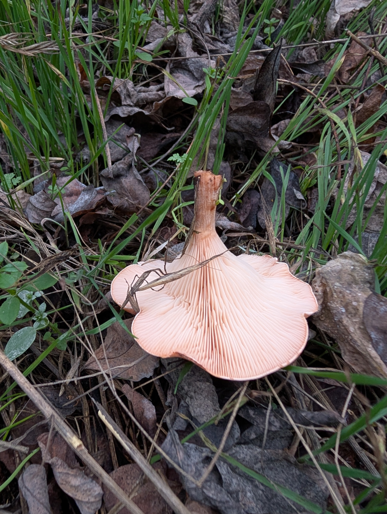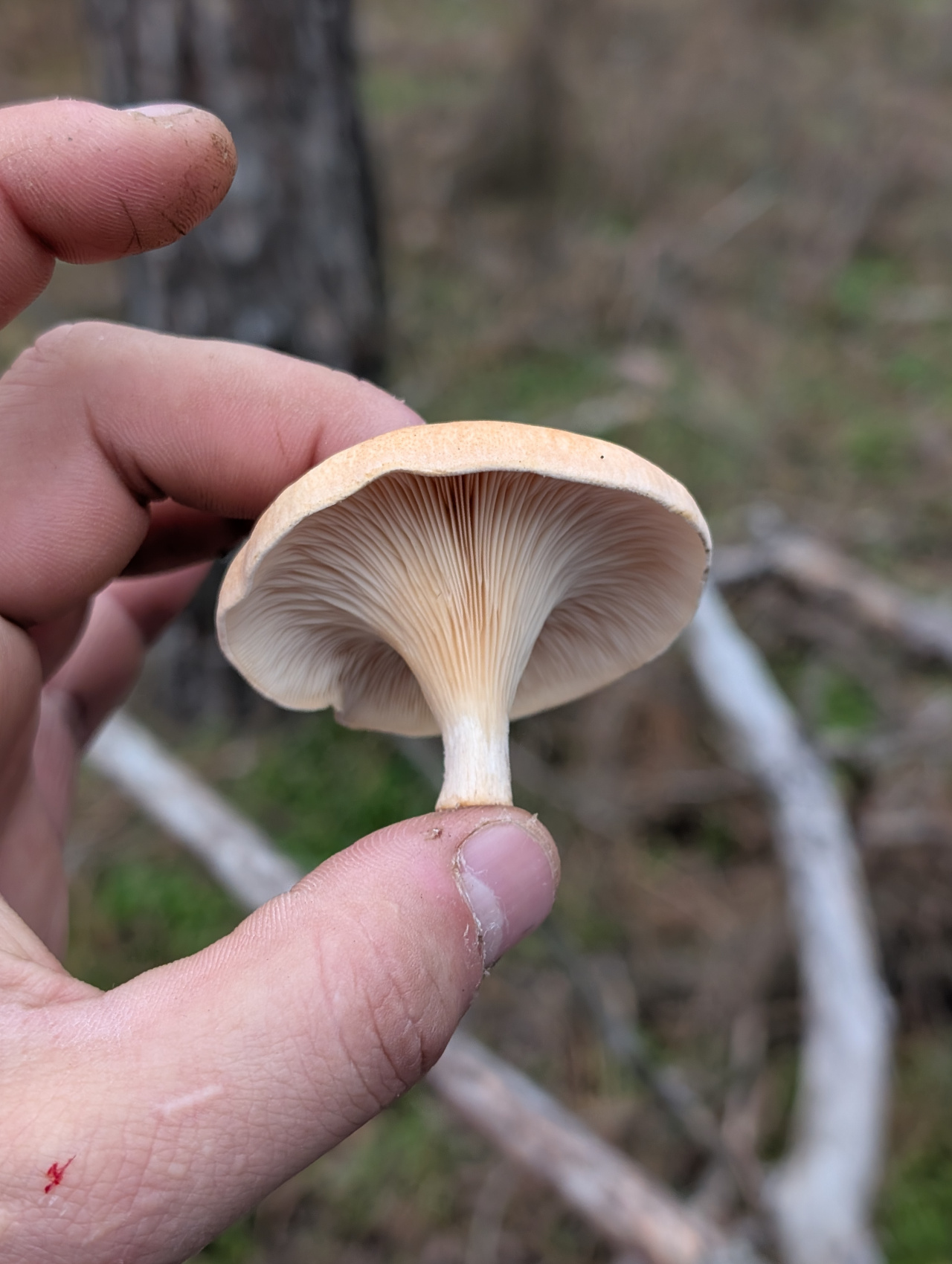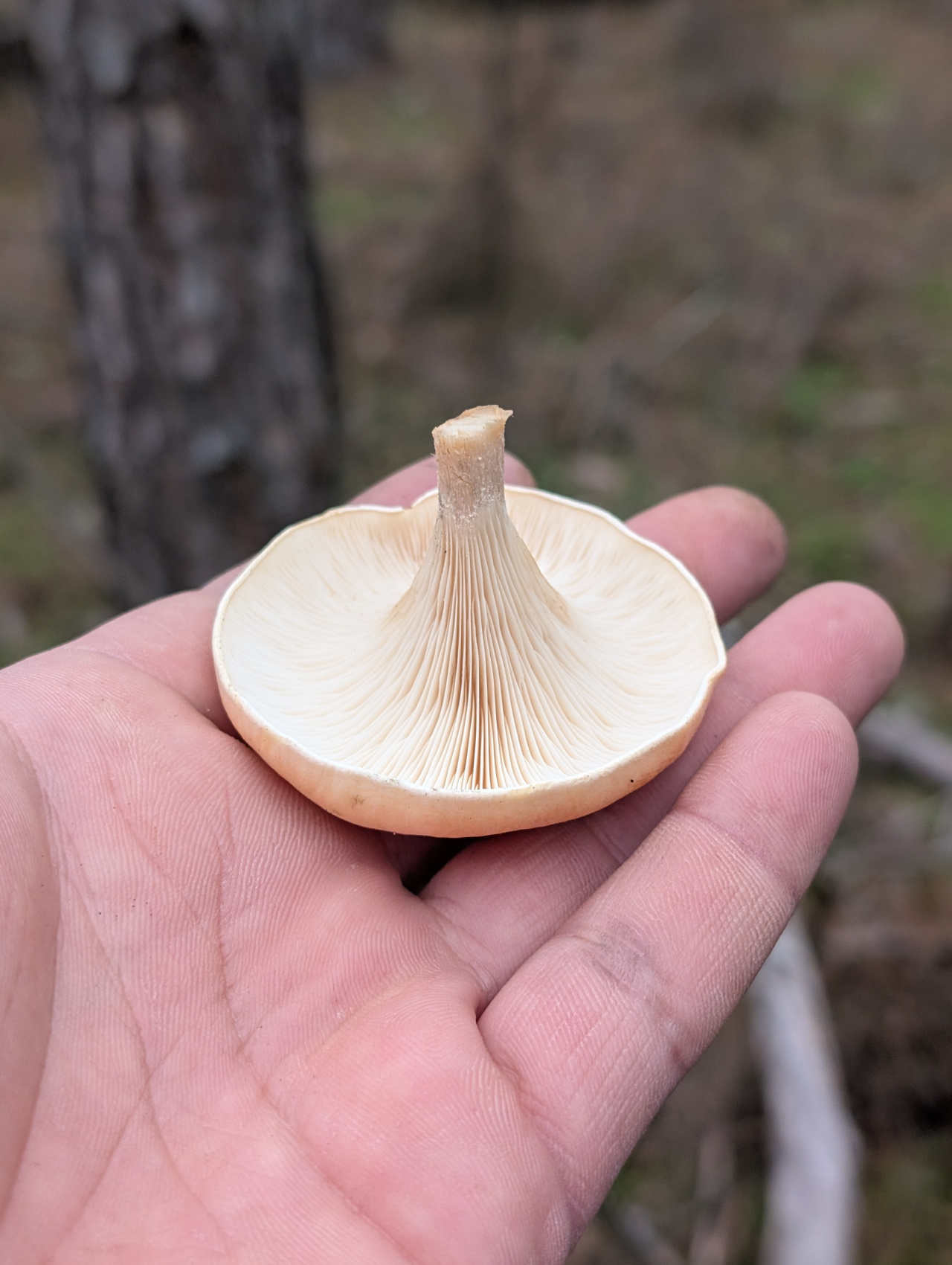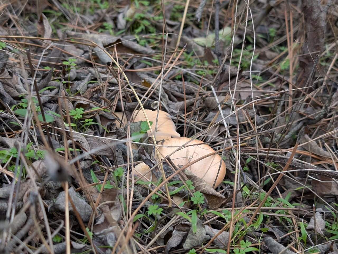 Описание гриба: Ноябрь, ростовская область, посадка акация/сосна. Температура уже месяц около +10. Пахнут приятно грибами, с небольшими фруктовыми нотами, растут полукольцами, будто бы на почве, но если раскопать — то на остатках деревьев, коре, листьях. Уже лет 10 собираю, ем, но так и никто не сказал, что это за гриб. Окраска темнее, если акации больше, светлее, если в хвое. Цвет не меняет на срезе. Иногда шляпка выворачивается как обычный зонтик, иногда плоская, иногда как у лисички вывернута.
